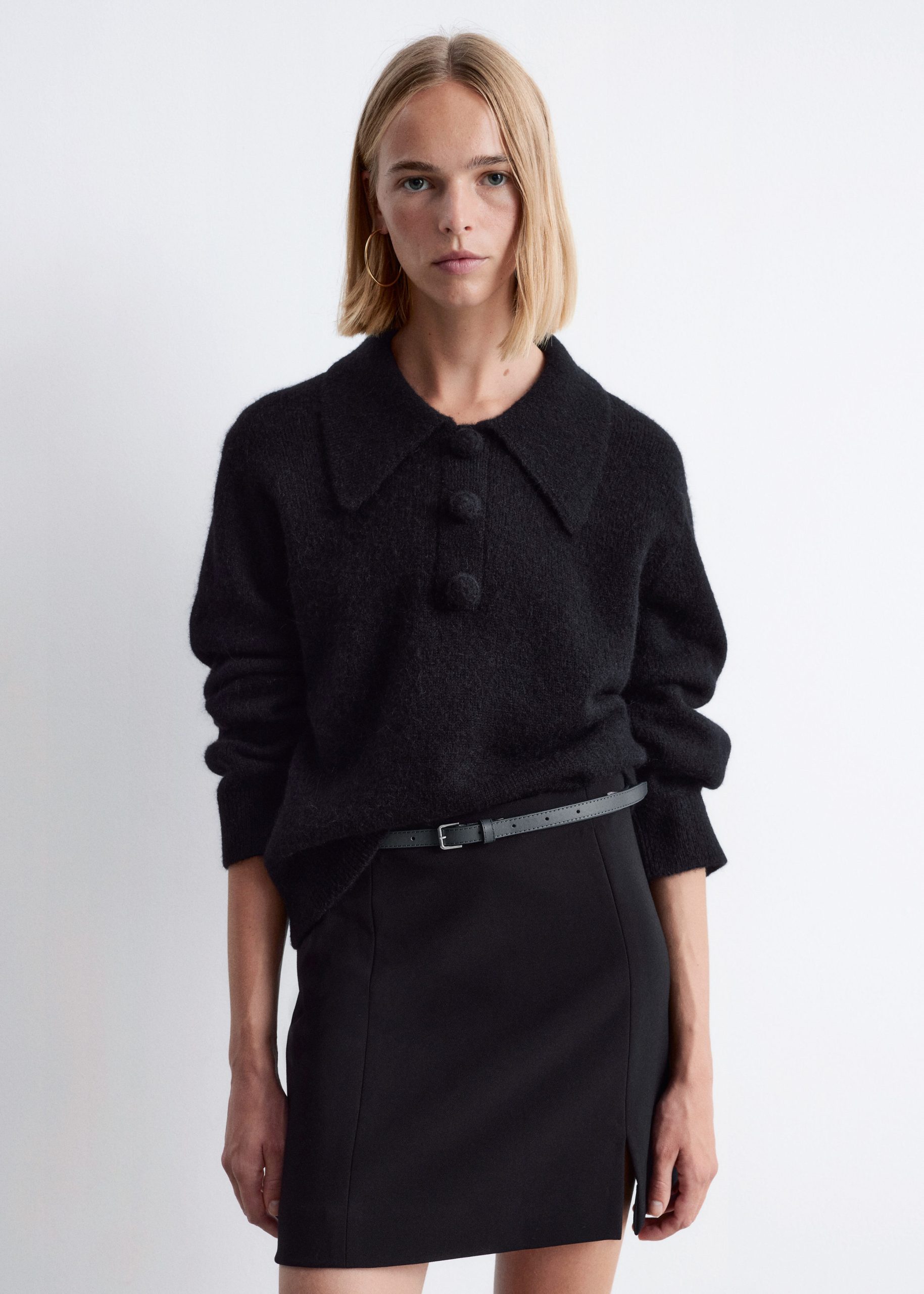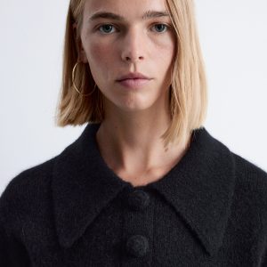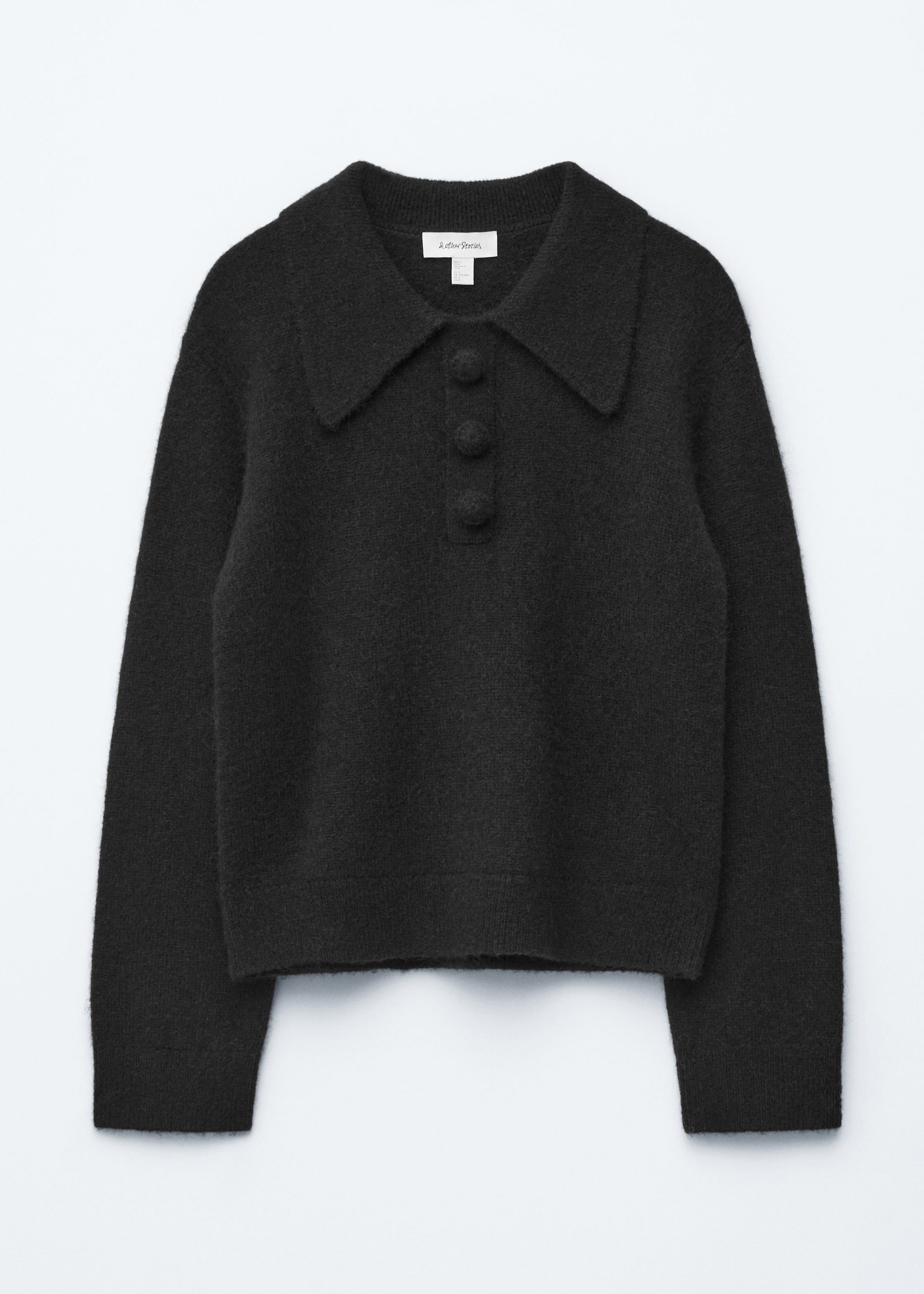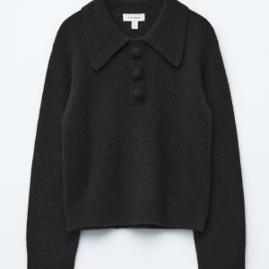 Knitted jumper made from an alpaca and merino wool blend, featuring an oversized collar and a decorative button placket with large, covered buttons. Designed with long sleeves and ribbing at the cuffs and hemline.