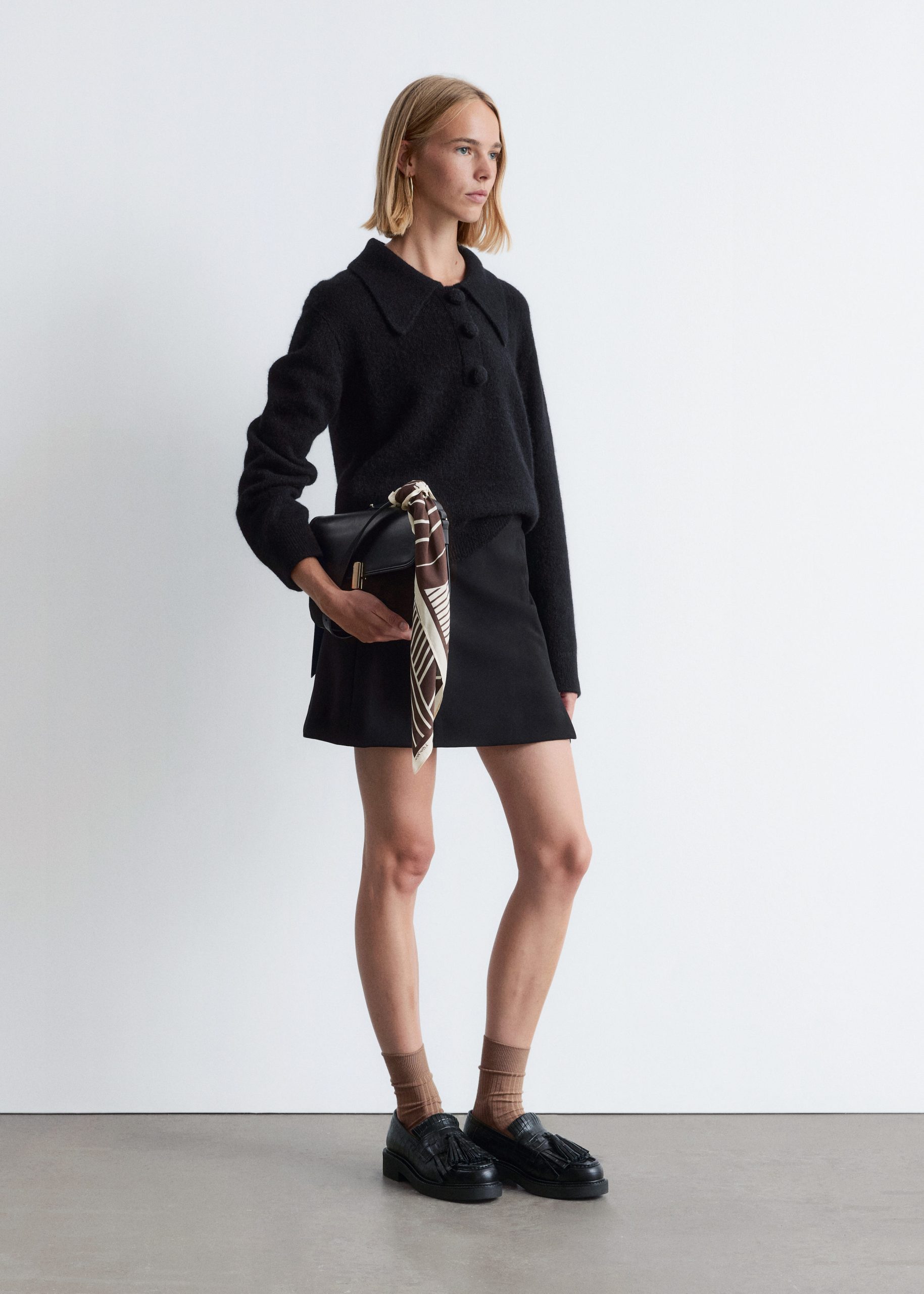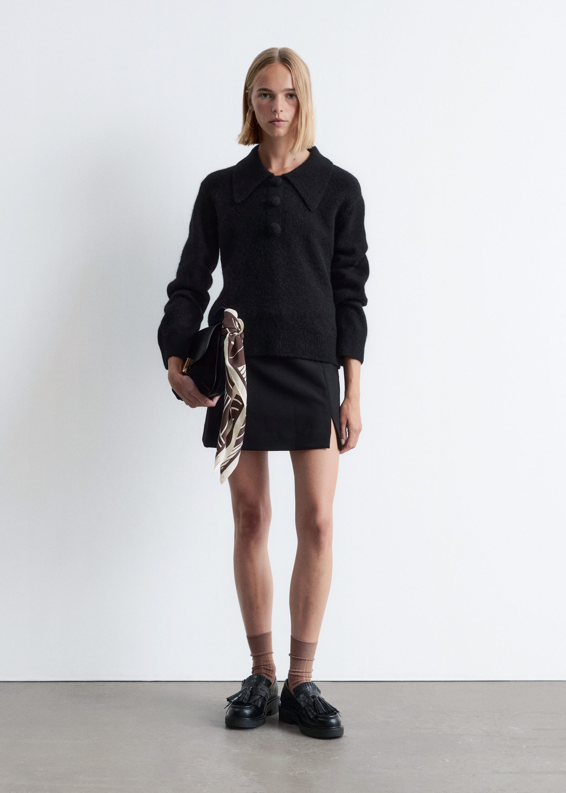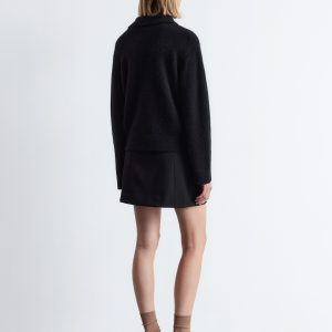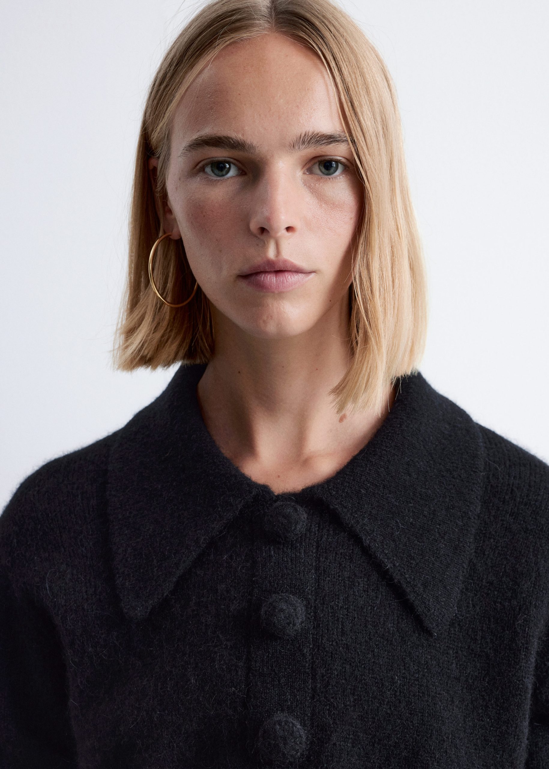Knitted jumper made from an alpaca and merino wool blend, featuring an oversized collar and a decorative button placket with large, covered buttons. Designed with long sleeves and ribbing at the cuffs and hemline.