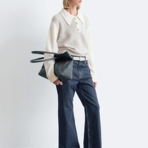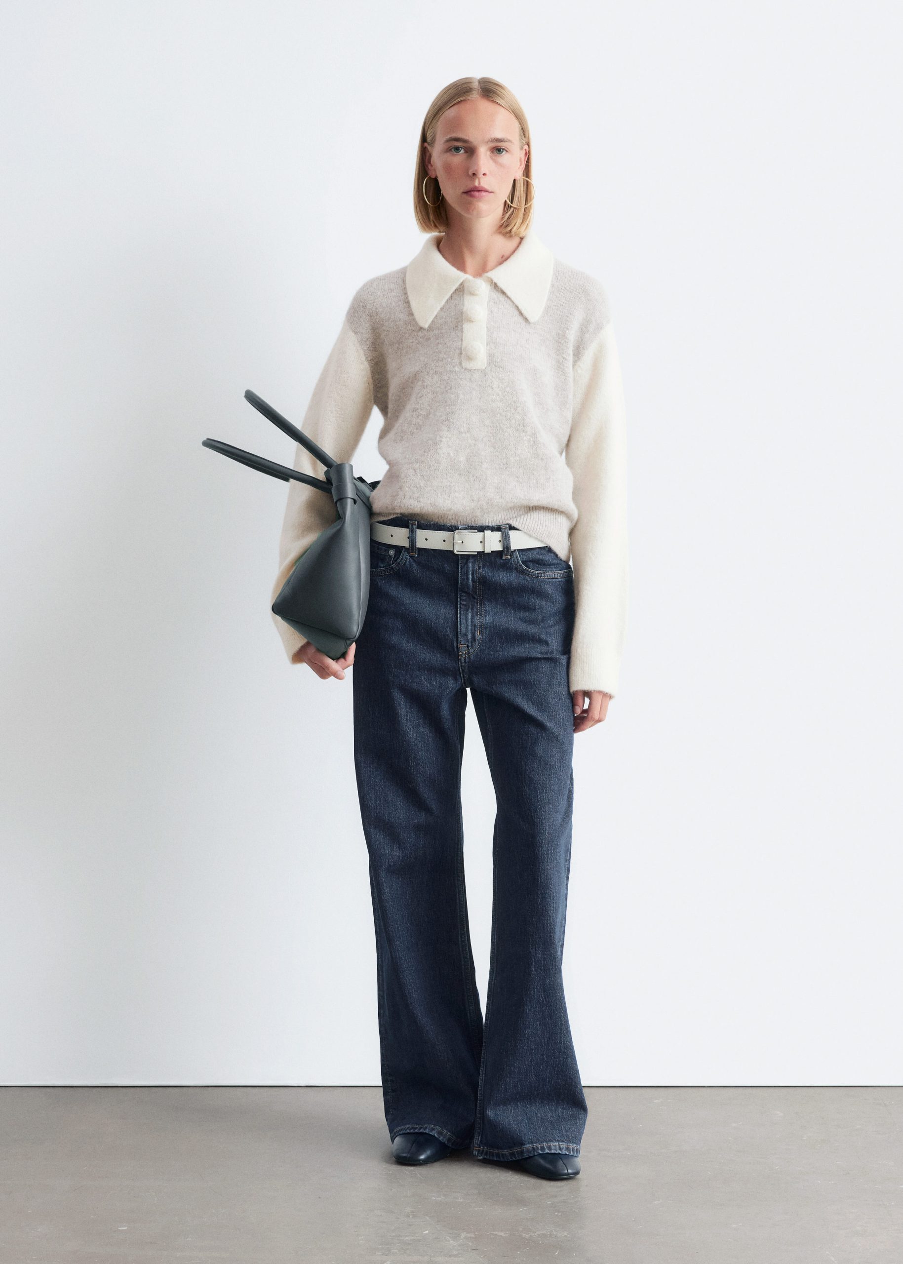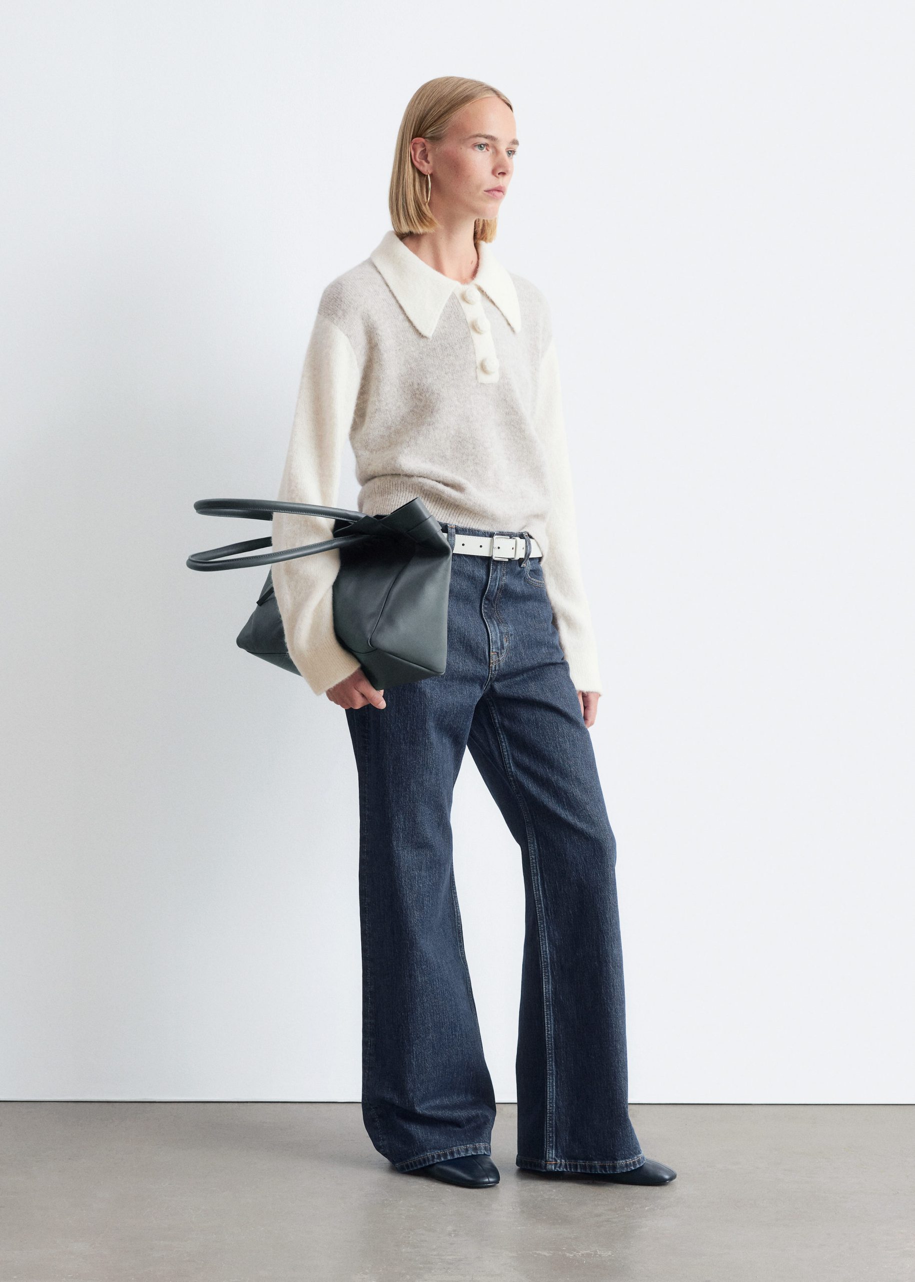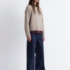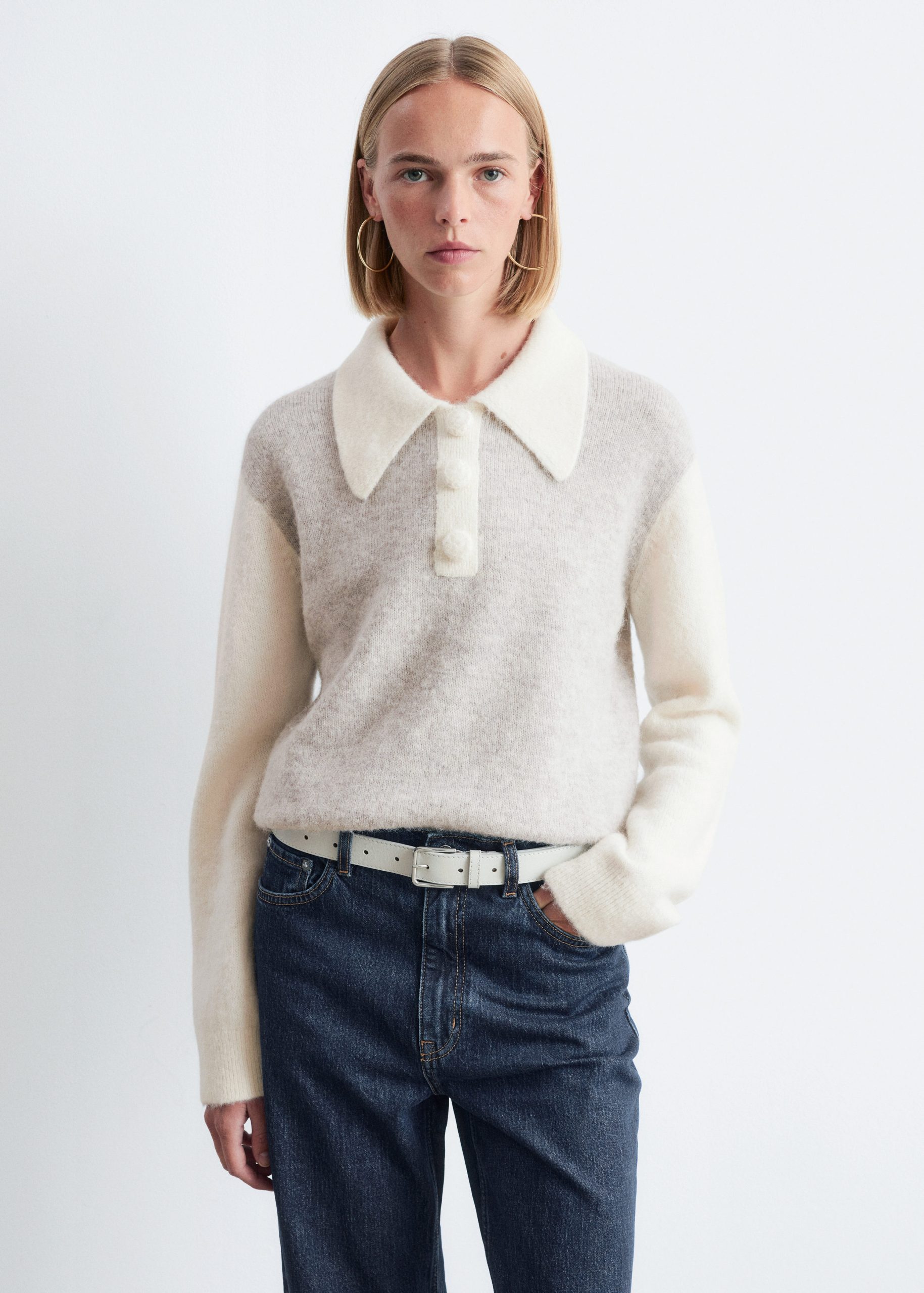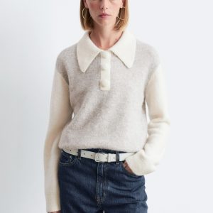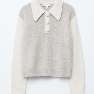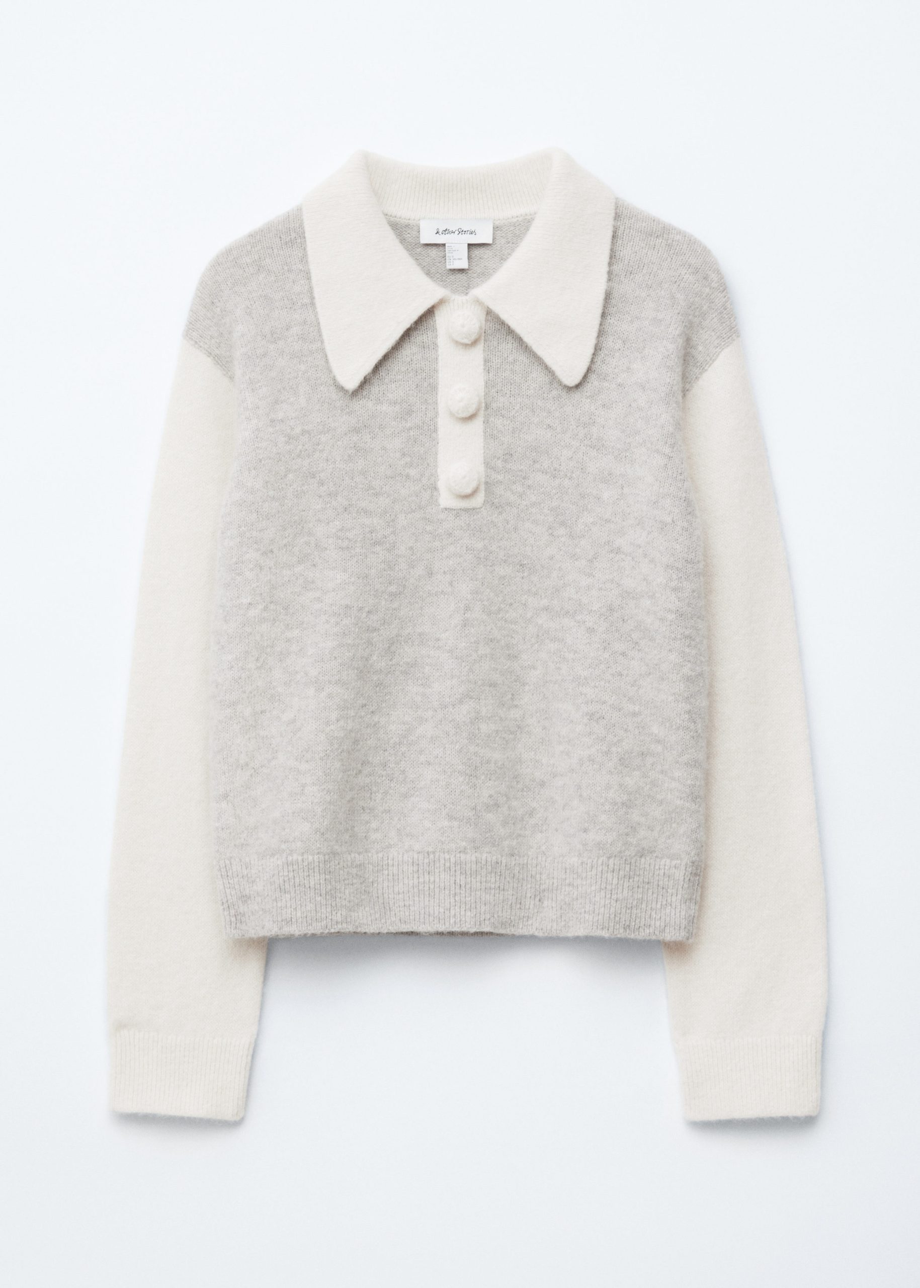 Knitted jumper made from an alpaca and merino wool blend, featuring an oversized collar and a decorative button placket with large, covered buttons. Designed with long sleeves and ribbing at the cuffs and hemline.