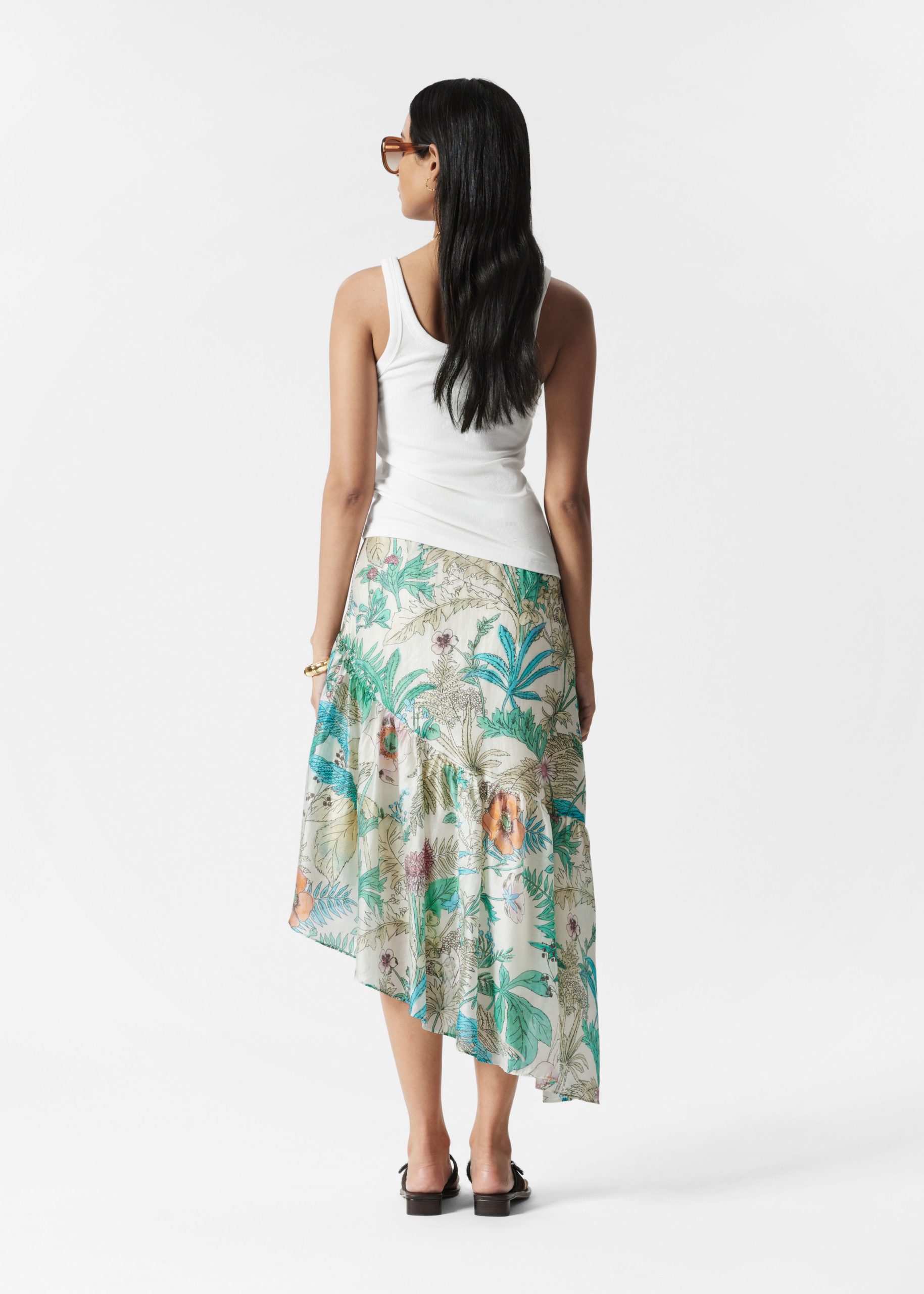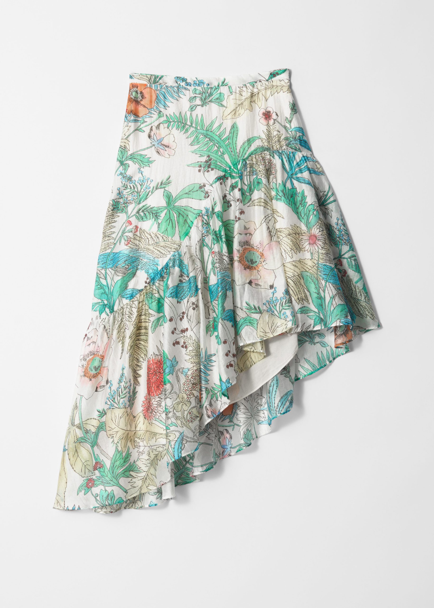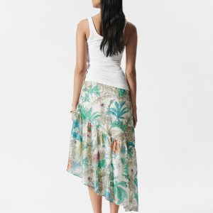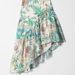 Let this skirt take center stage in your wardrobe. Designed with an asymmetric silhouette and soft gathered ruffles that cascade in a waterfall effect, adding fluid movement with every step. Finished with an concealed side zipper.Â