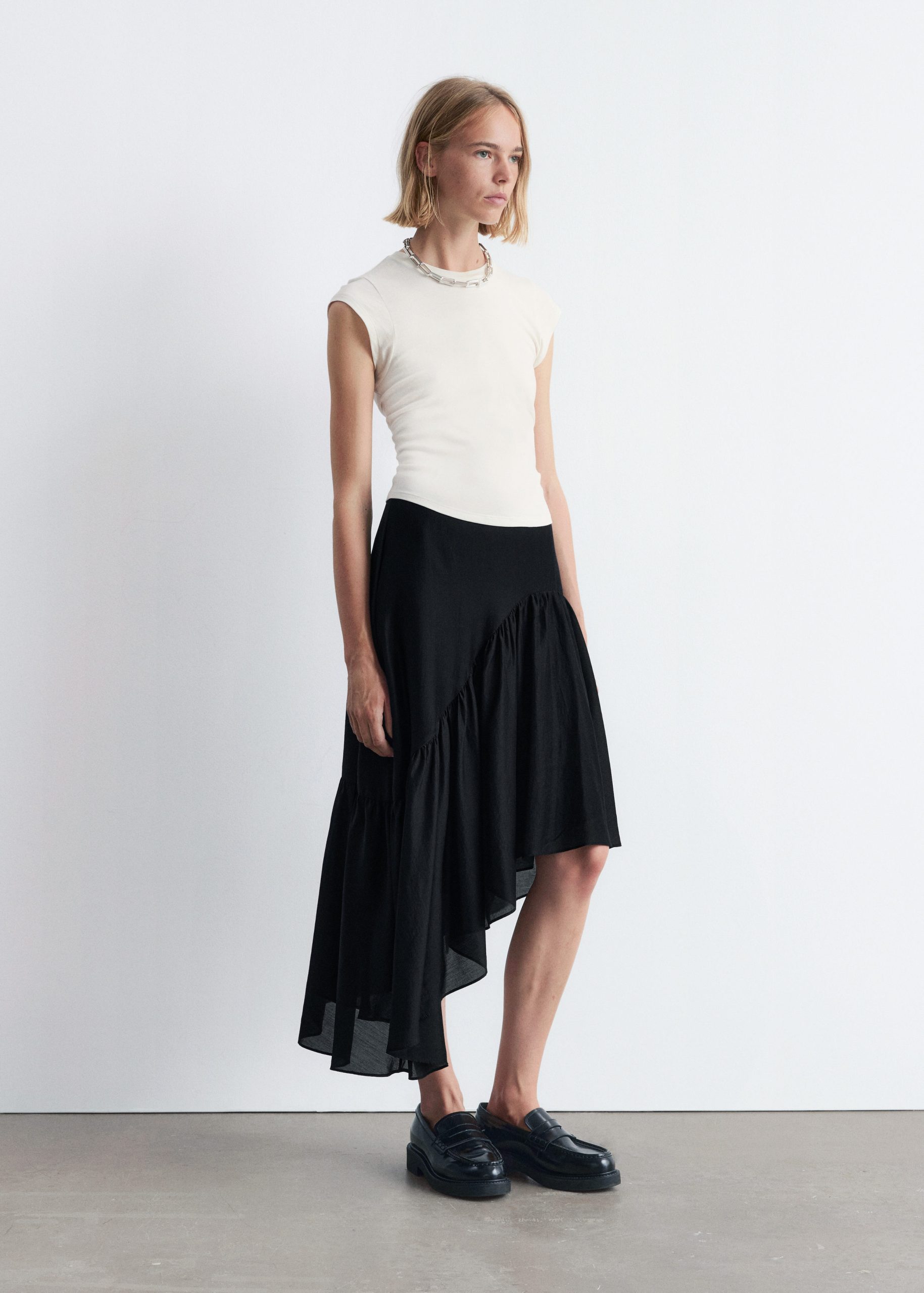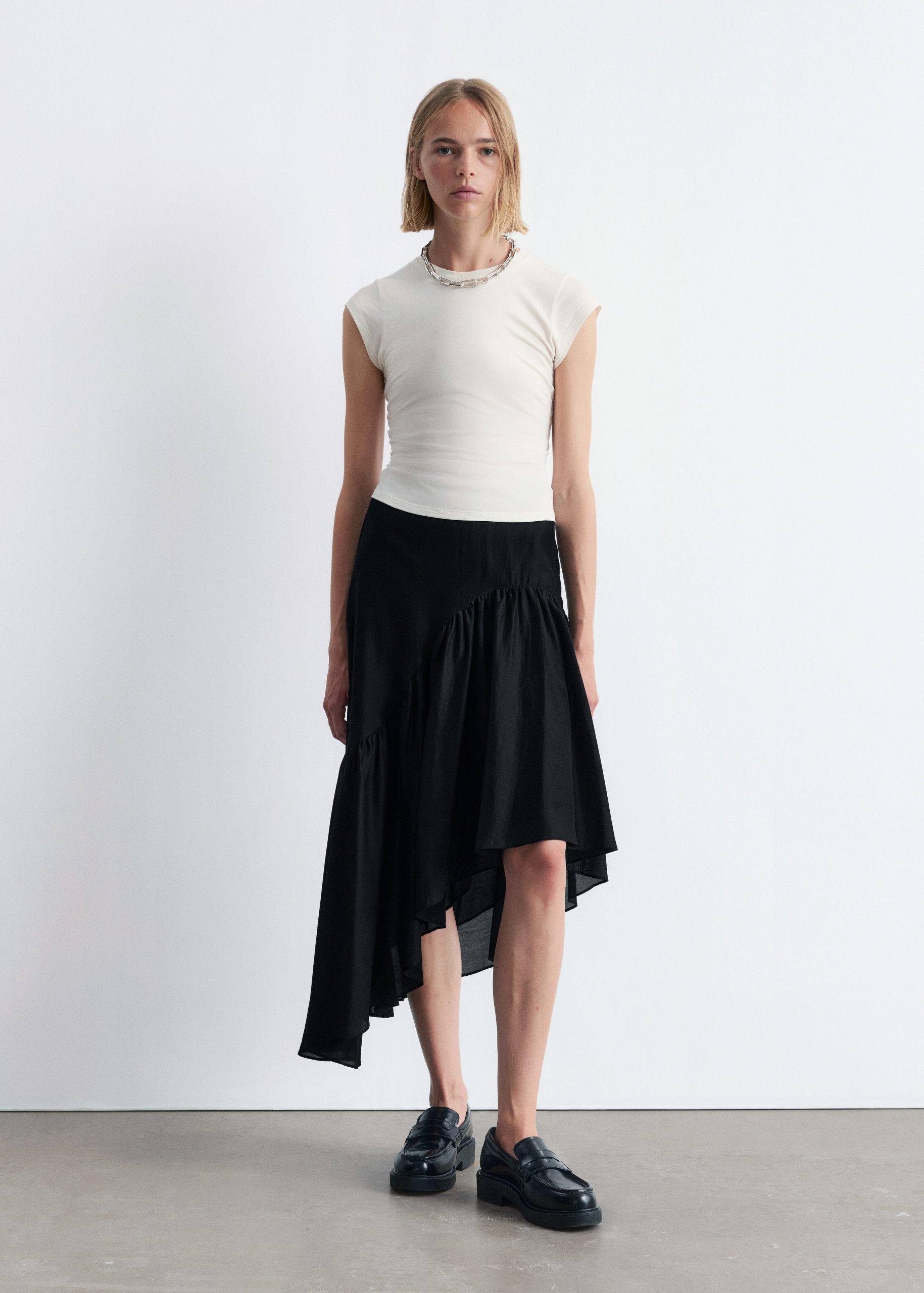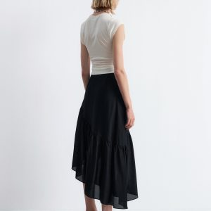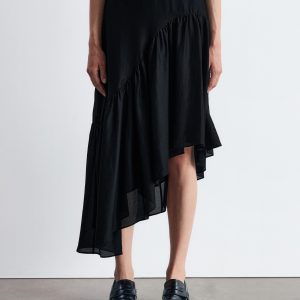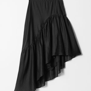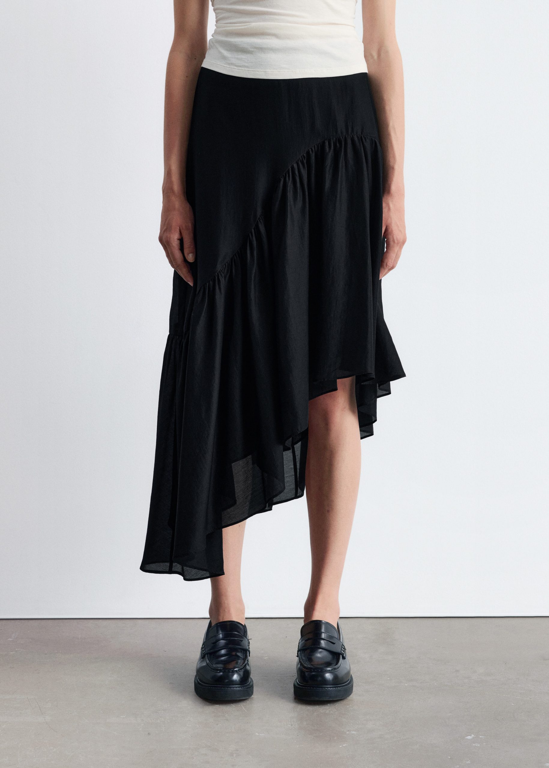 Let this skirt take center stage in your wardrobe. Designed with an asymmetric silhouette and soft gathered ruffles that cascade in a waterfall effect, adding fluid movement with every step. Finished with an concealed side zipper.Â