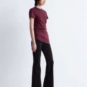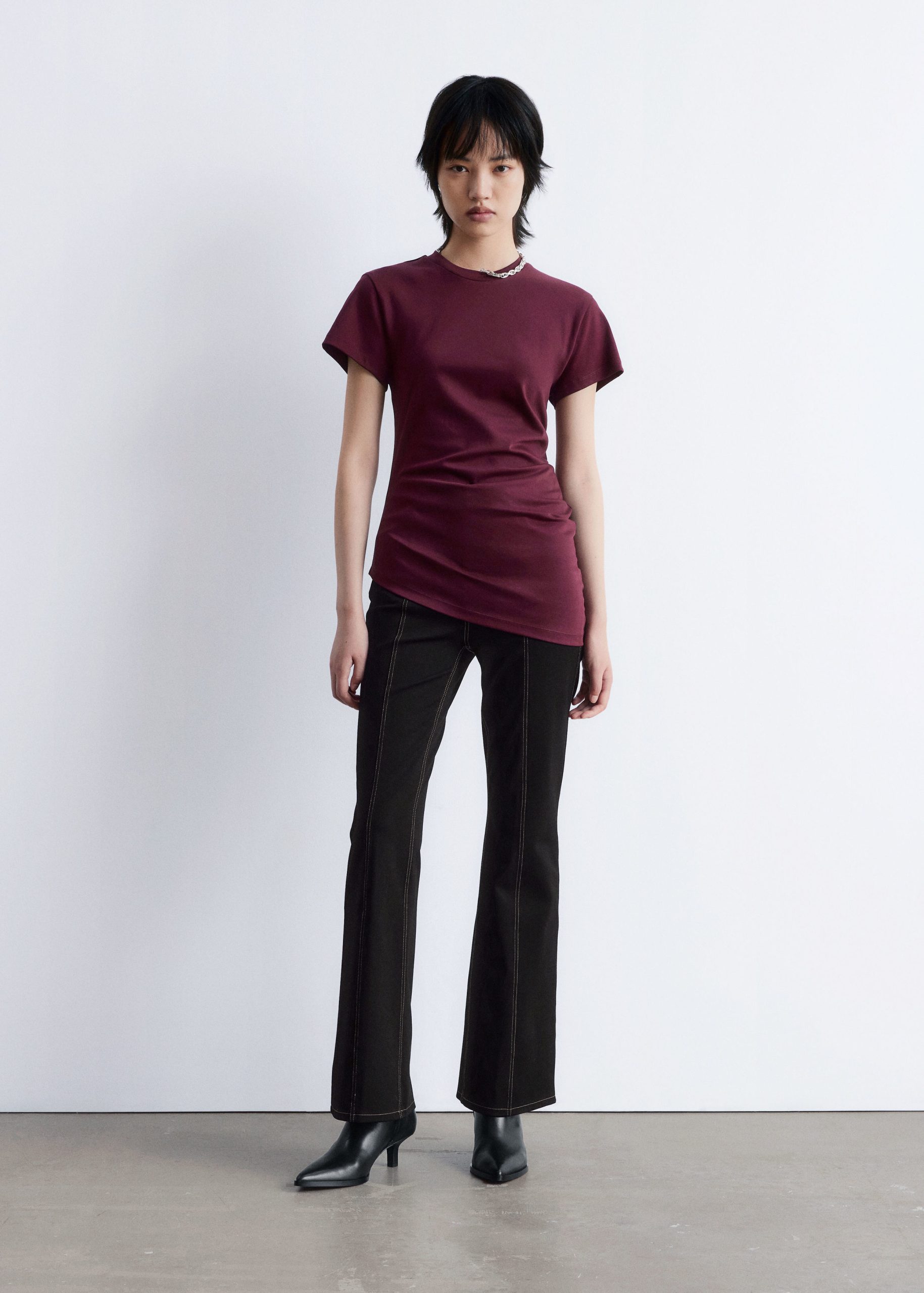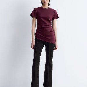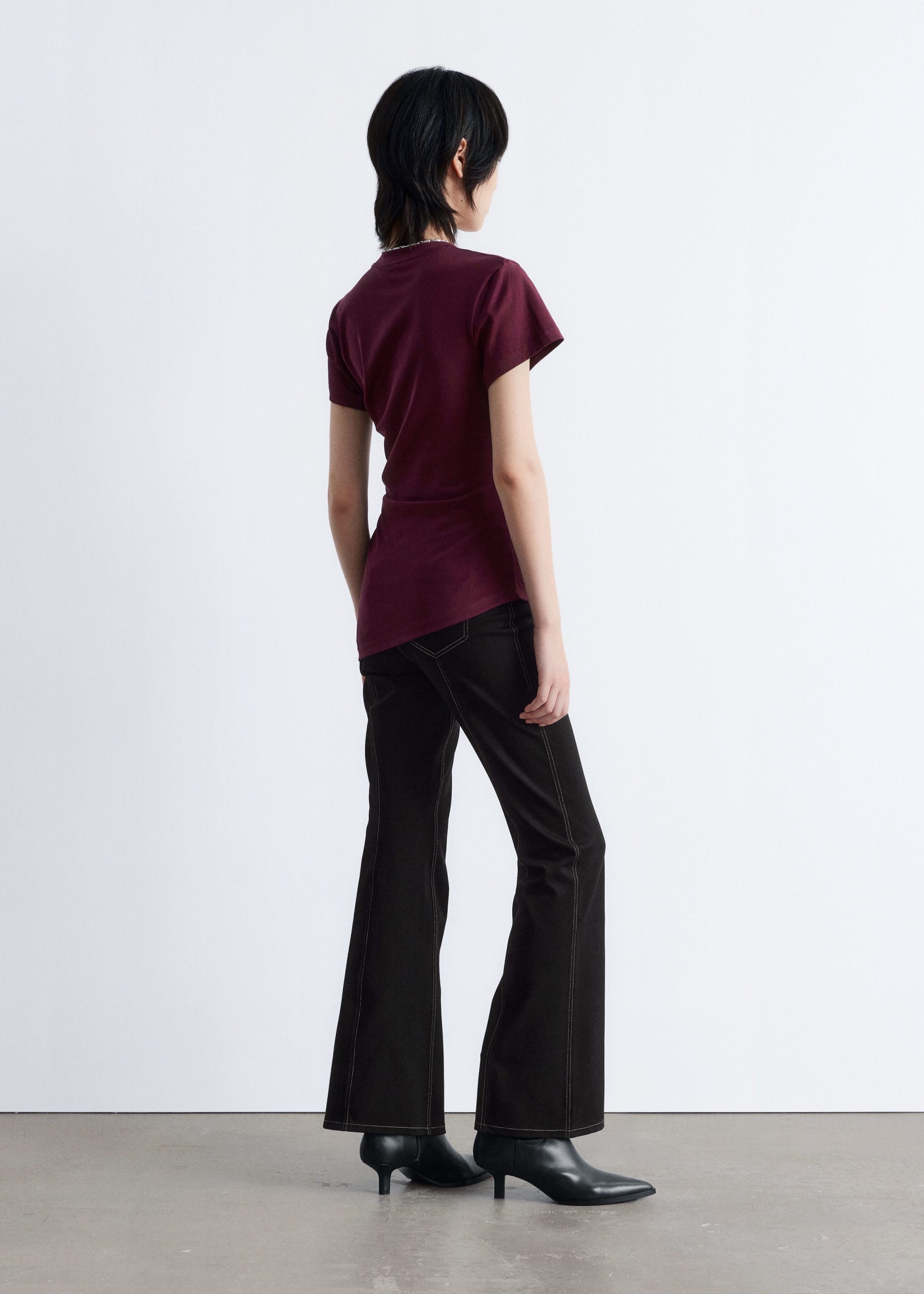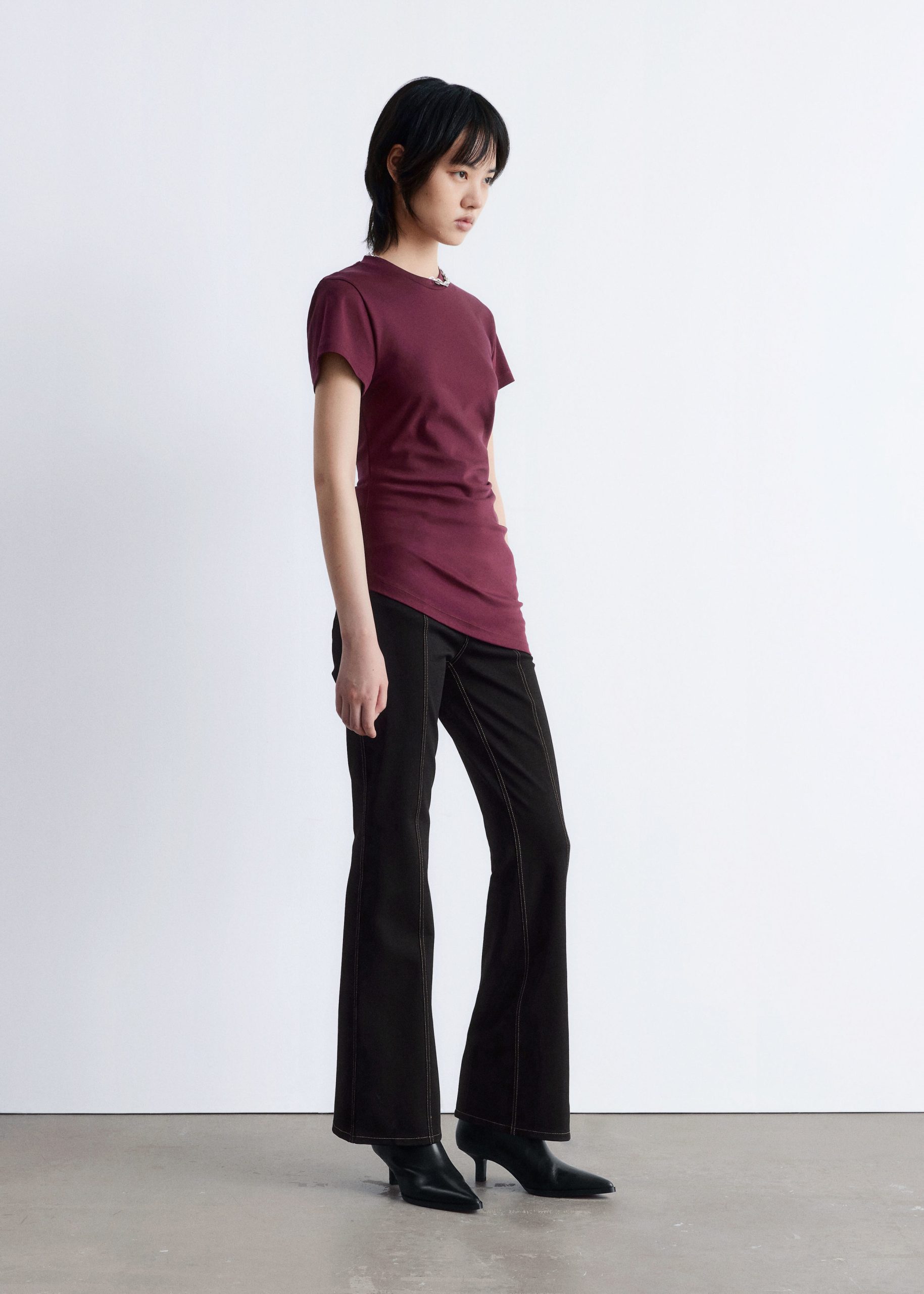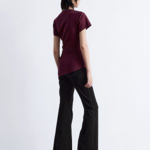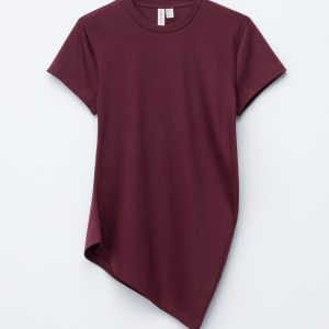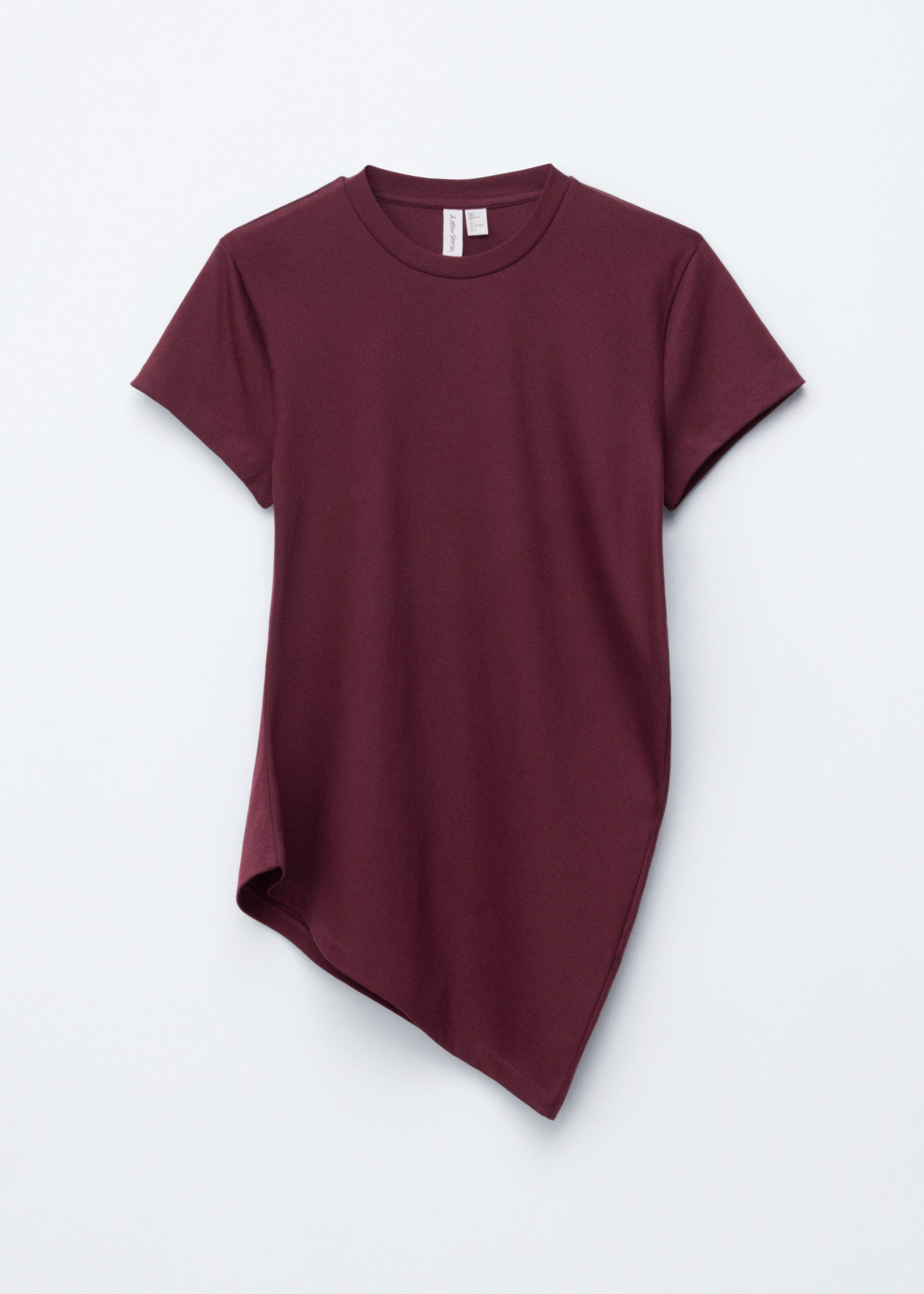 This t-shirt is knitted from soft, stretchy cotton jersey. Cut in a straight silhouette, it features a round neckline, short sleeves, and a sharply angled, asymmetric hemline that points diagonally across the body. A minimalist cotton staple with a twist—pair it with tailored trousers or denim.