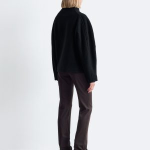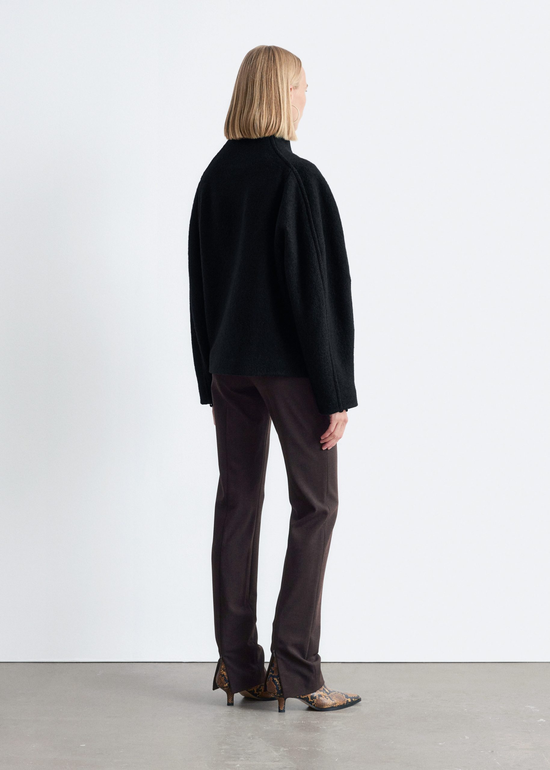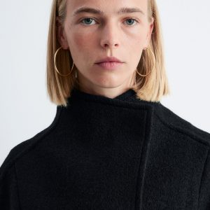 Wool jacket defined by an asymmetric, angled placket with concealed button closures.