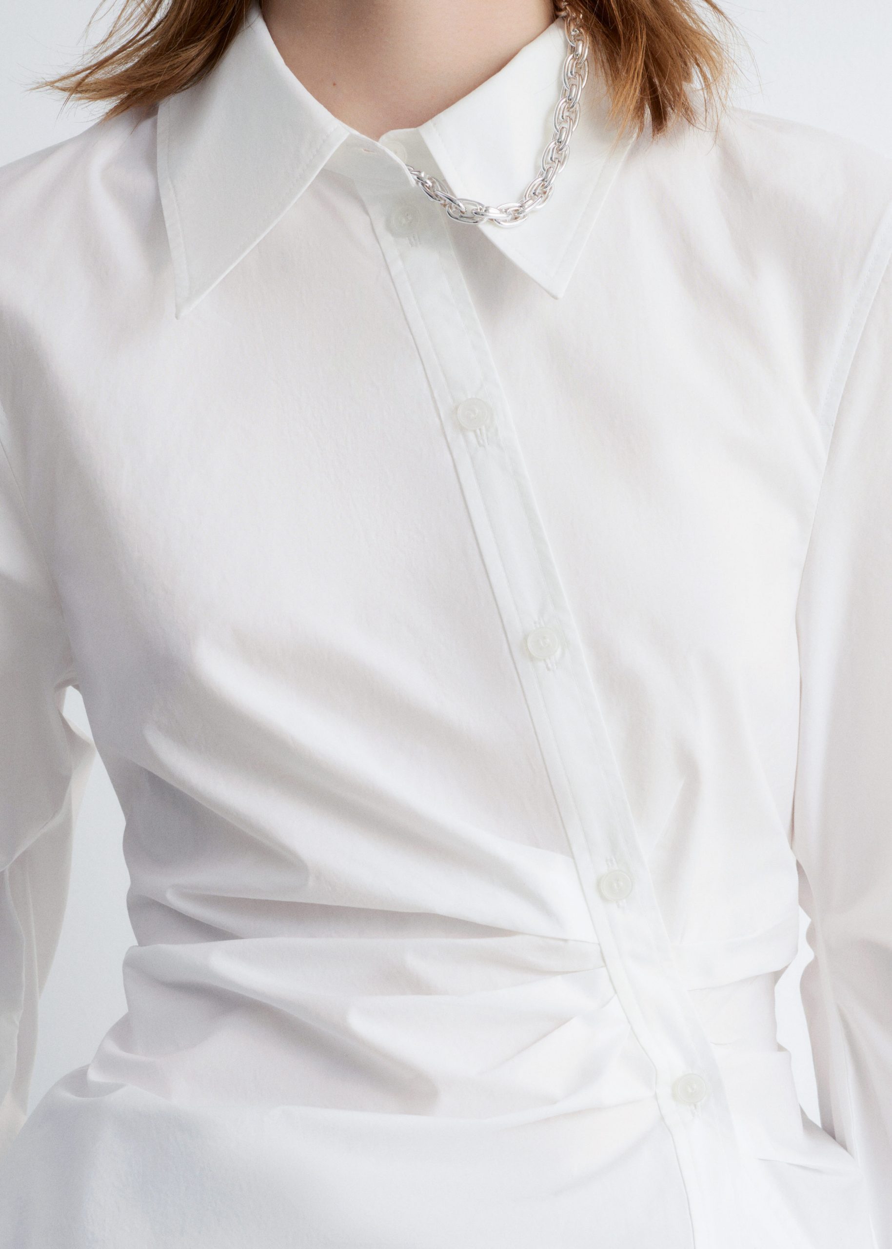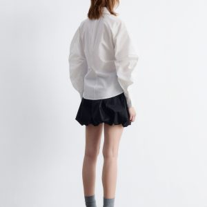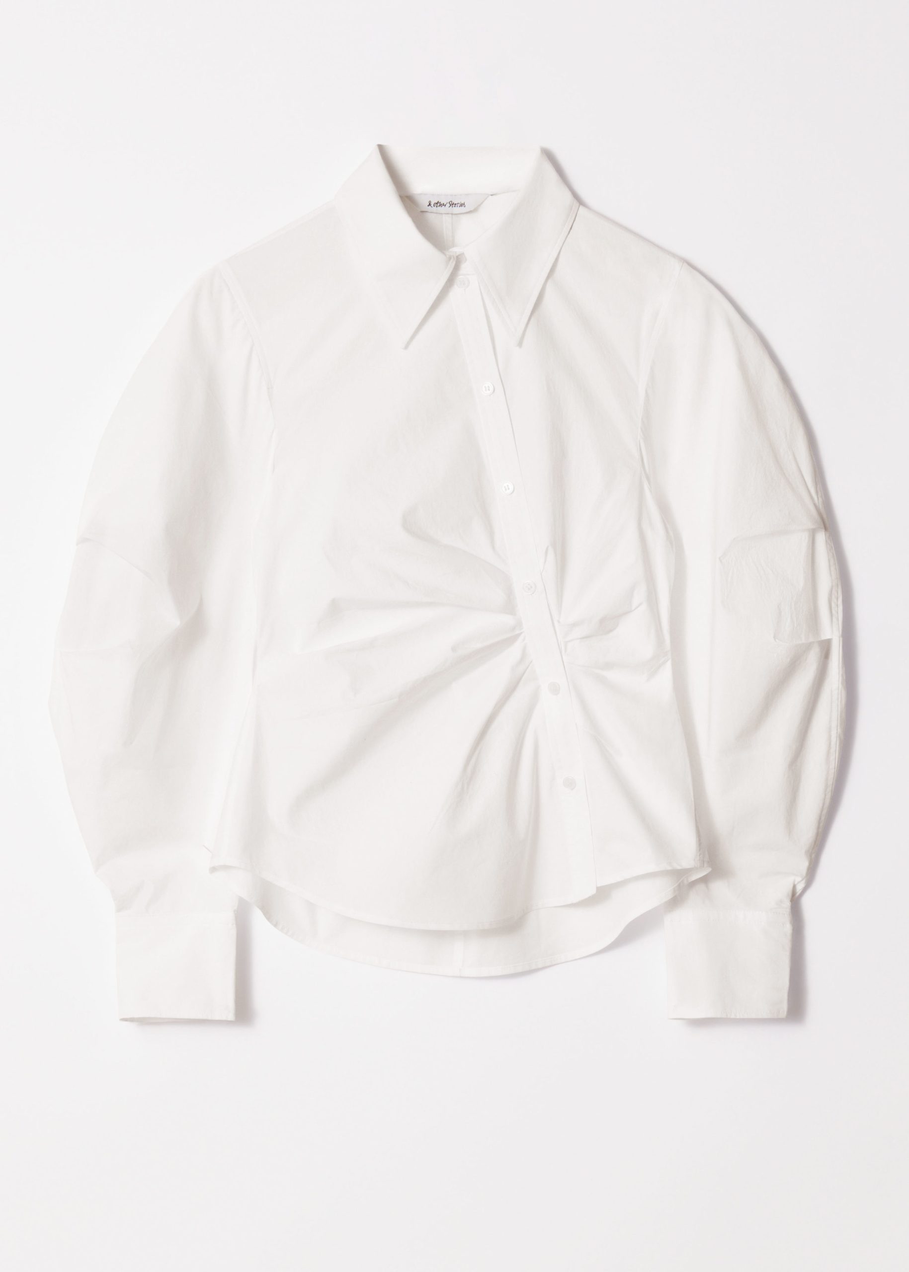 Cotton shirt designed with an asymmetrical button placket, voluminous sleeves, and cinched gatherings at the waist.