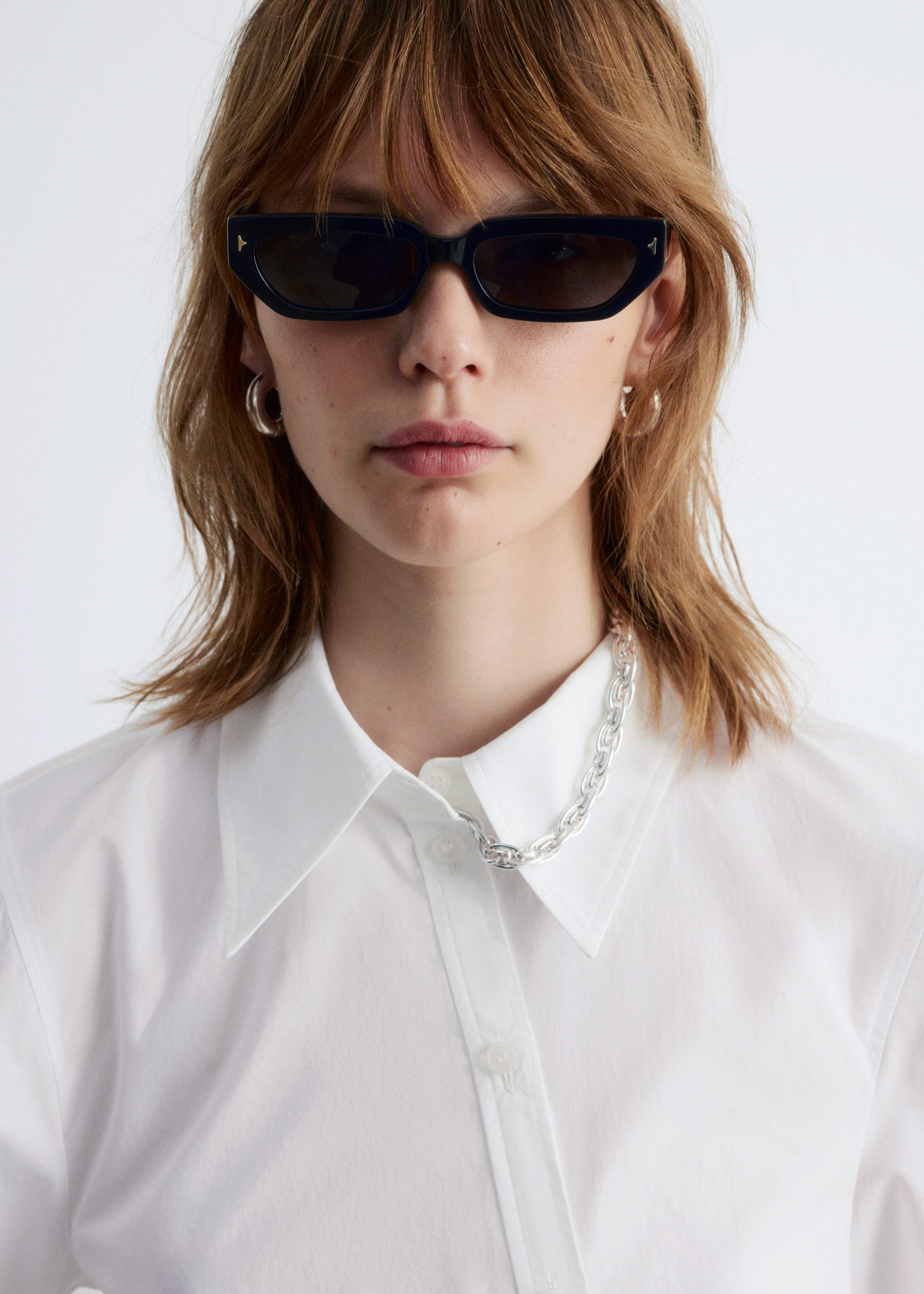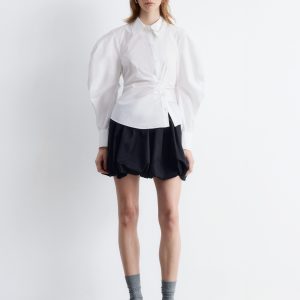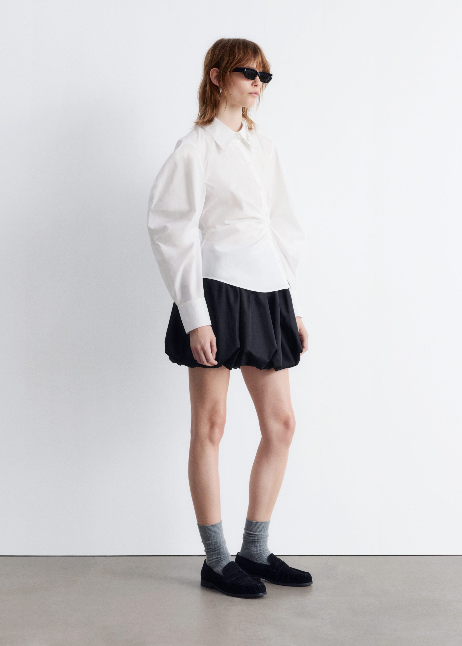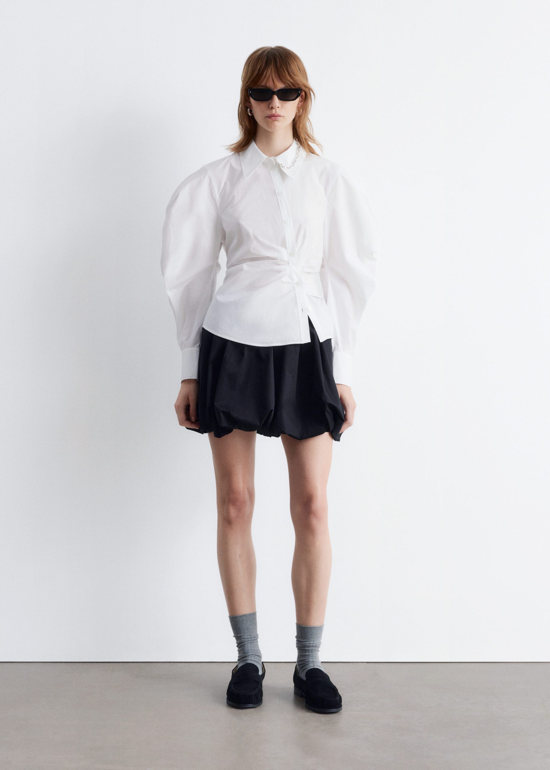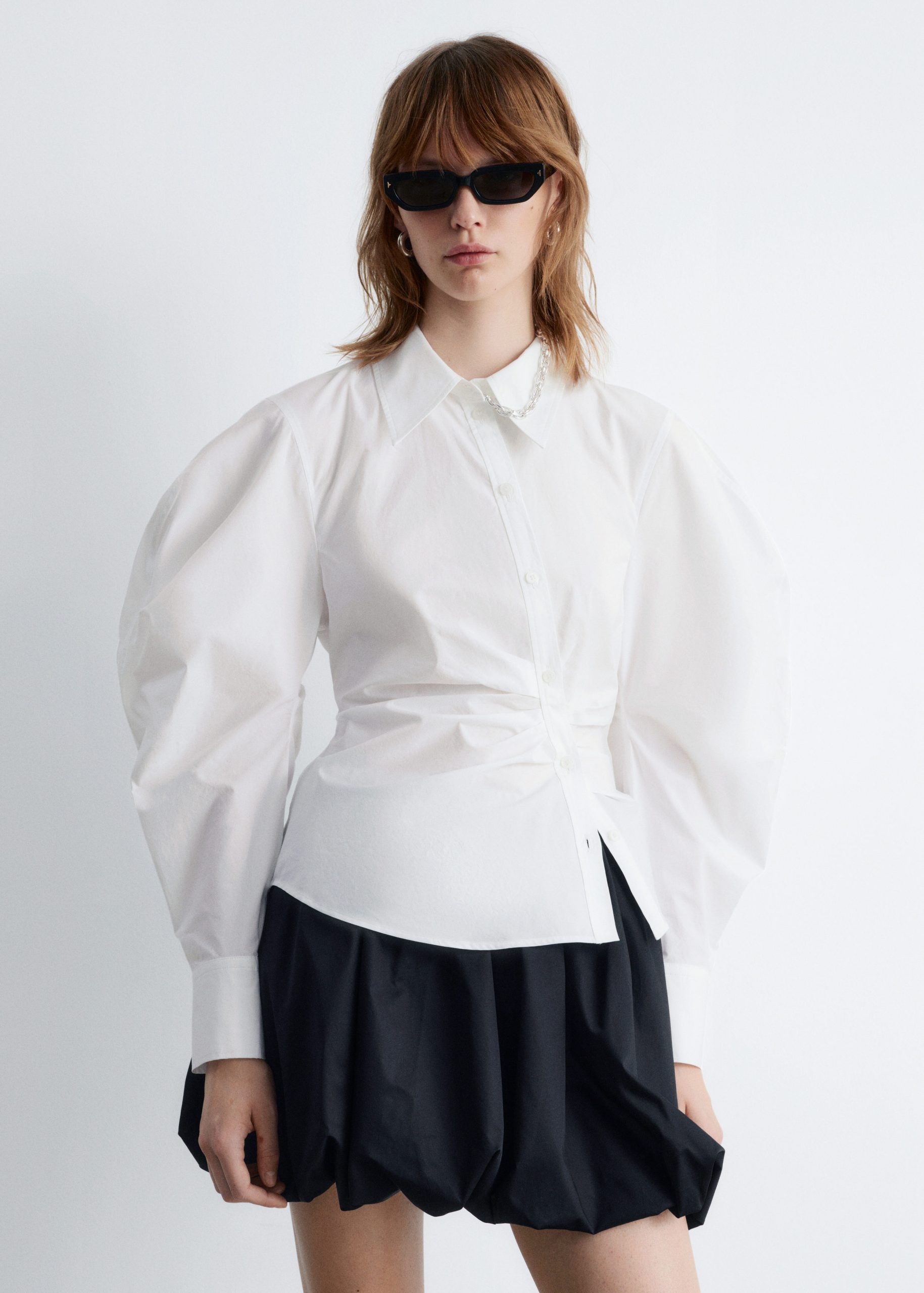 Cotton shirt designed with an asymmetrical button placket, voluminous sleeves, and cinched gatherings at the waist.