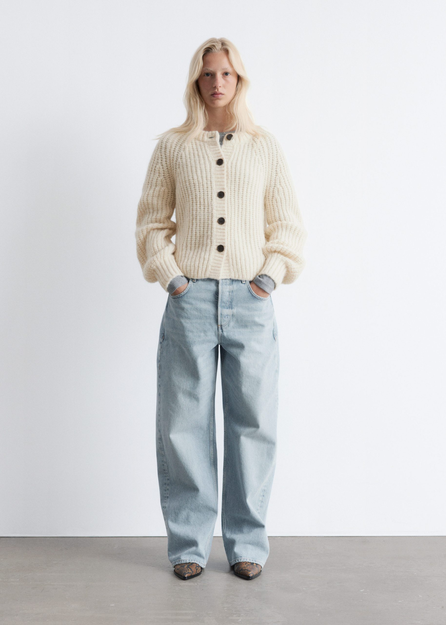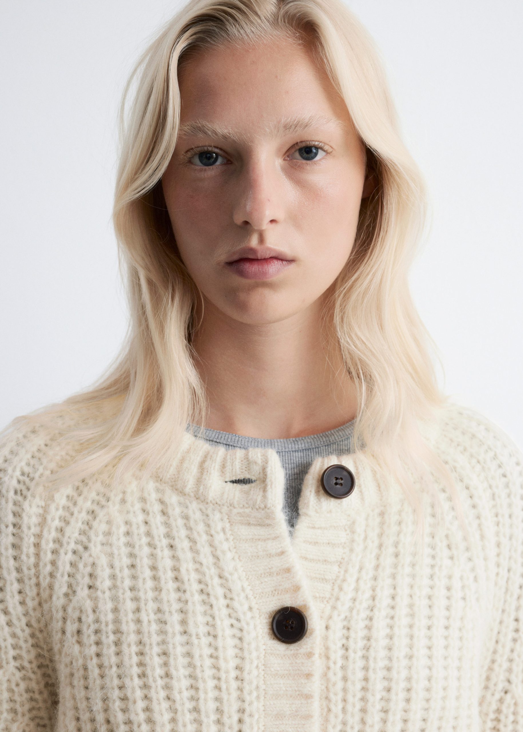 This cardigan is knitted from a cotton, alpaca, and wool blend. Cut in a relaxed silhouette, it features long balloon sleeves and ribbed trims, and is traced with buttons down the front.