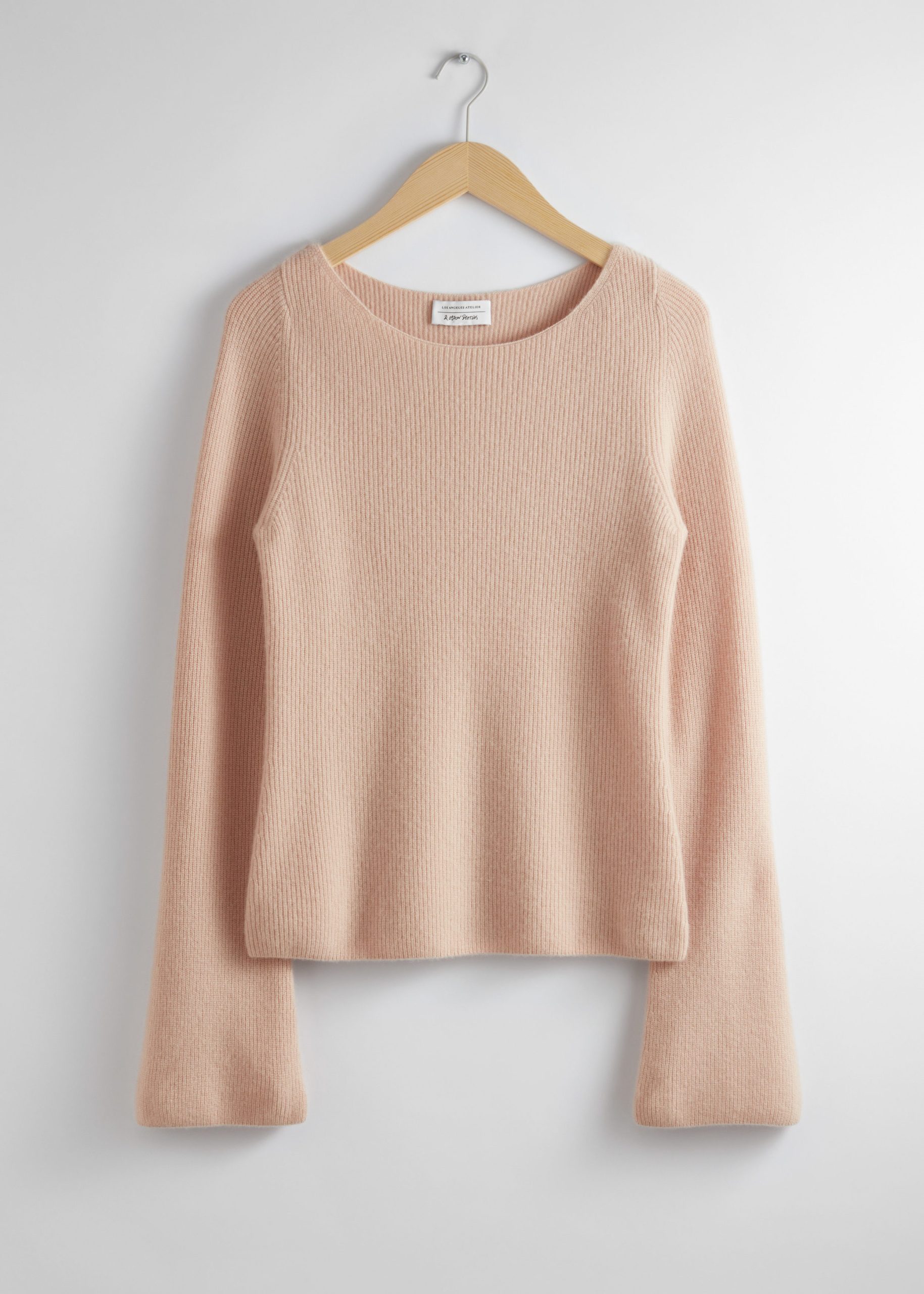 Ribbed cashmere knit sweater with a fitted silhouette and bell sleeves.