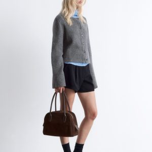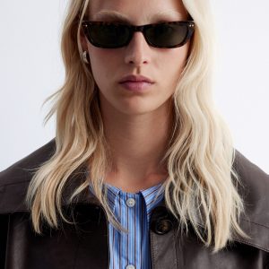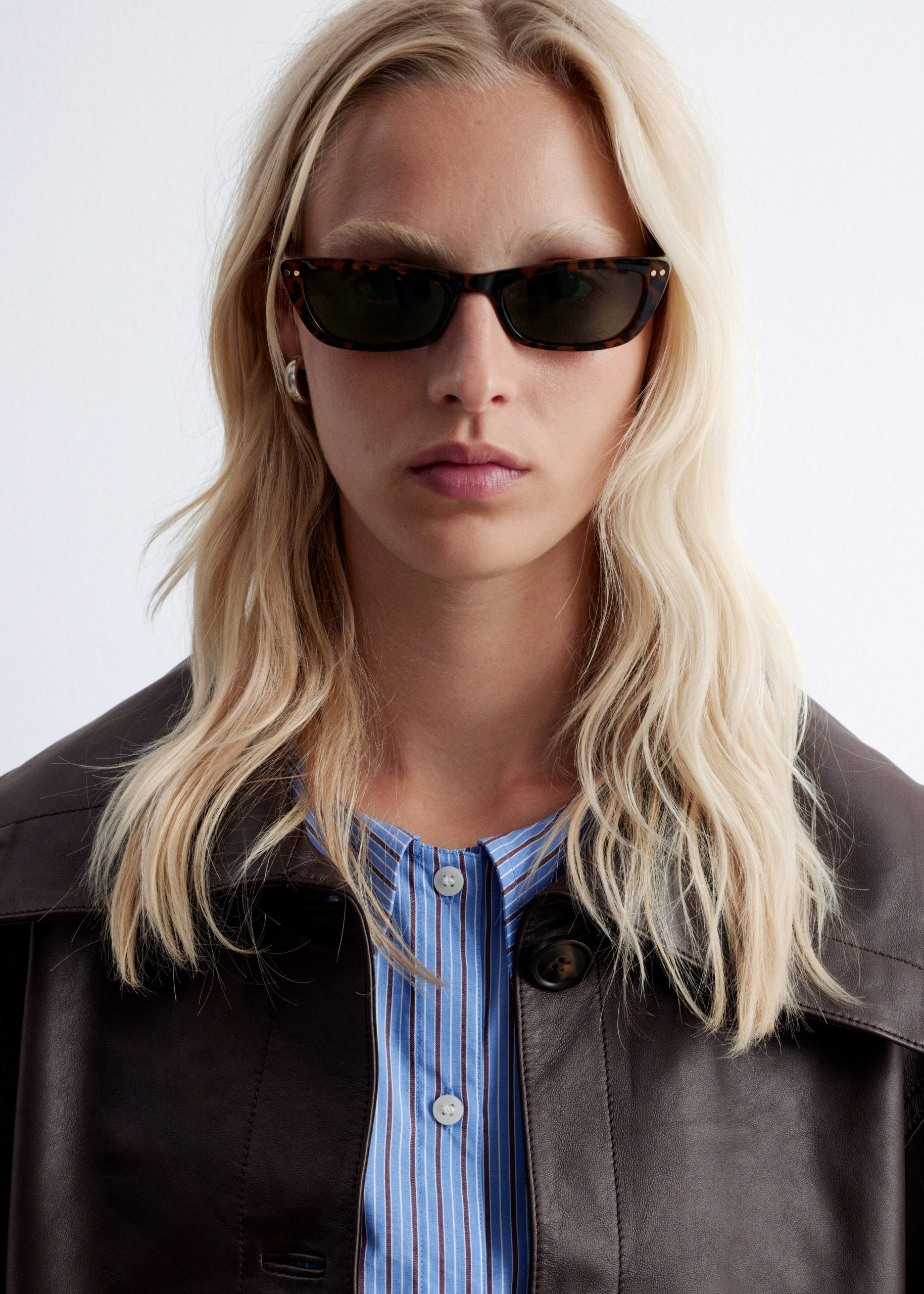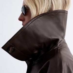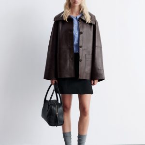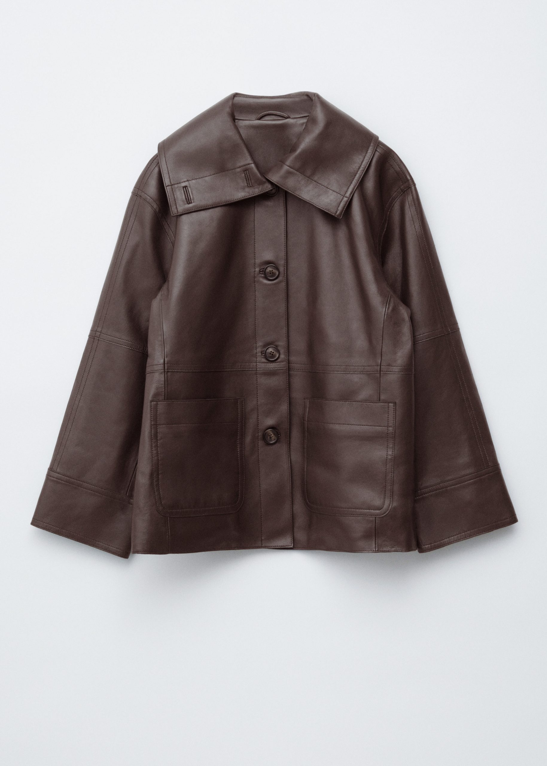 Crafted from 100% nappa leather, this jacket has a soft, textured finish. Cut in a straight, boxy silhouette, it features a large funnel collar that can be worn up or folded down, topstitched seam detailing, and oversized patch pockets. Traced with tonal buttons down the front and cuffs. Pair with the matching leather shorts for a tonal co-ord look.