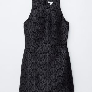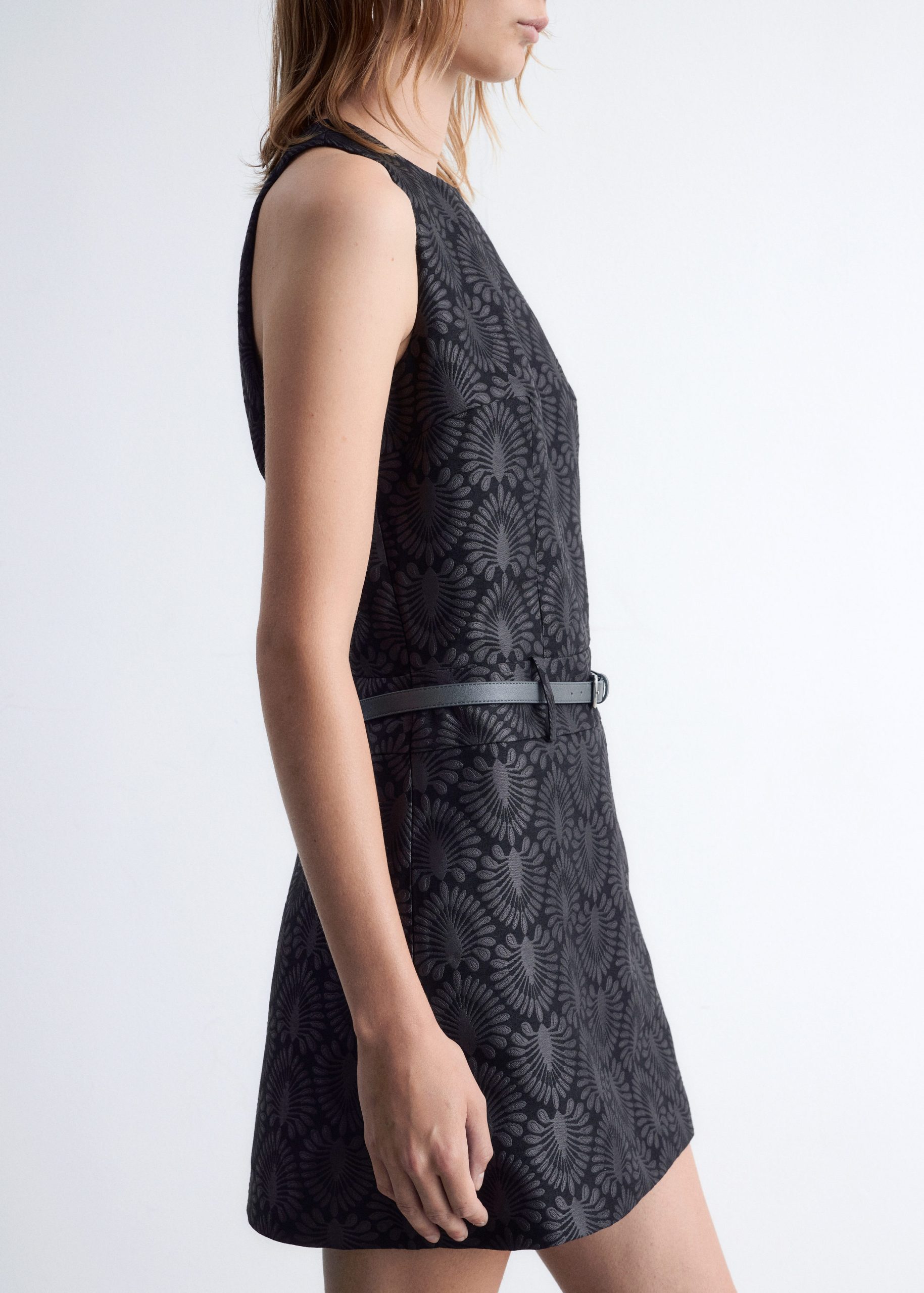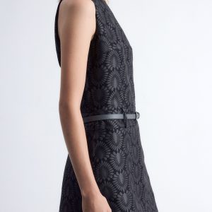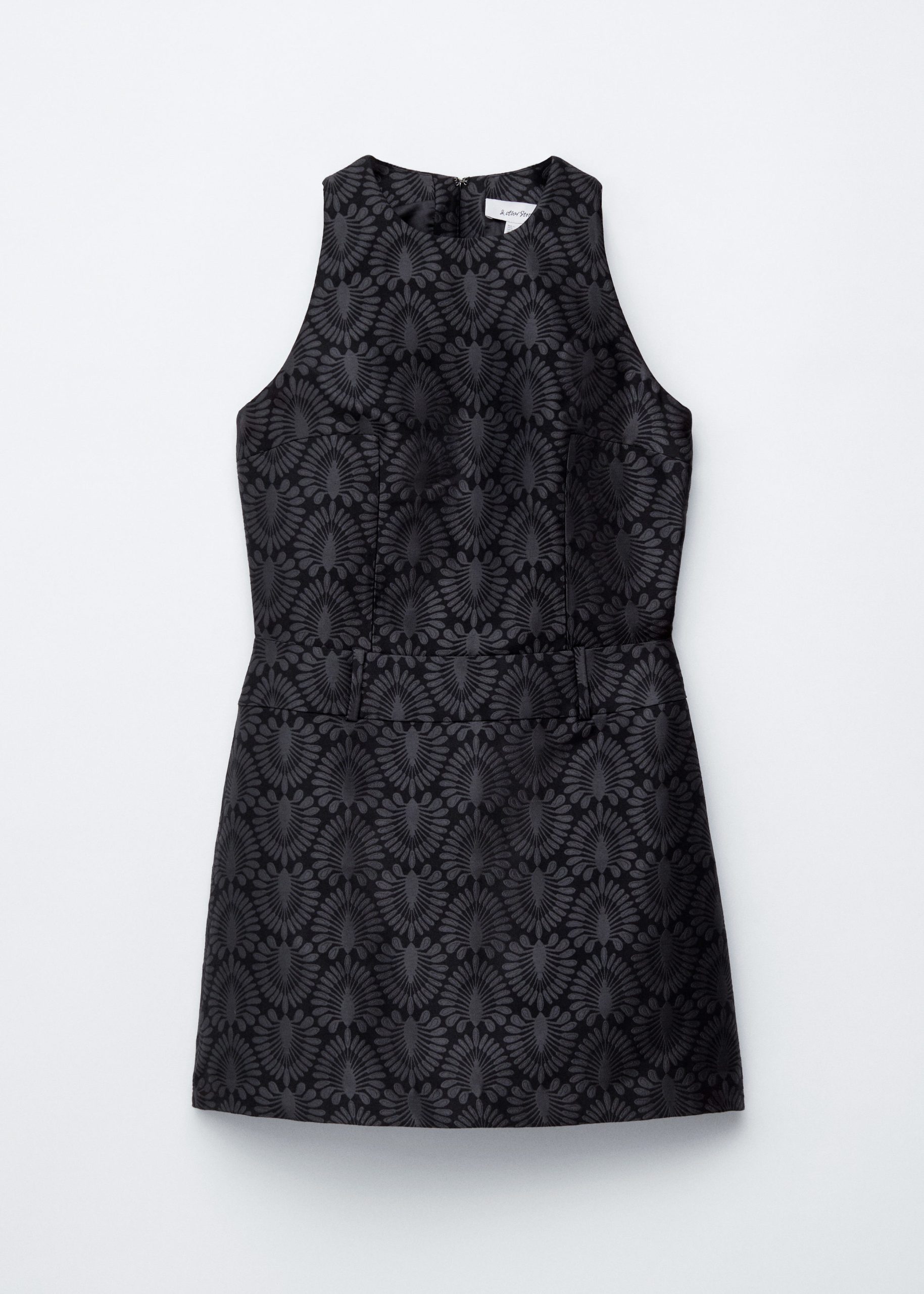 This mini dress is crafted from a satin brocade fabric with a richly textured peacock tile pattern. Cut in a sleeveless design, it features a round neck and a fake belt detail at the waist. Finished with a keyhole closure at the neck and a concealed side zipper with hook-and-eye closure.