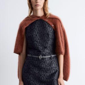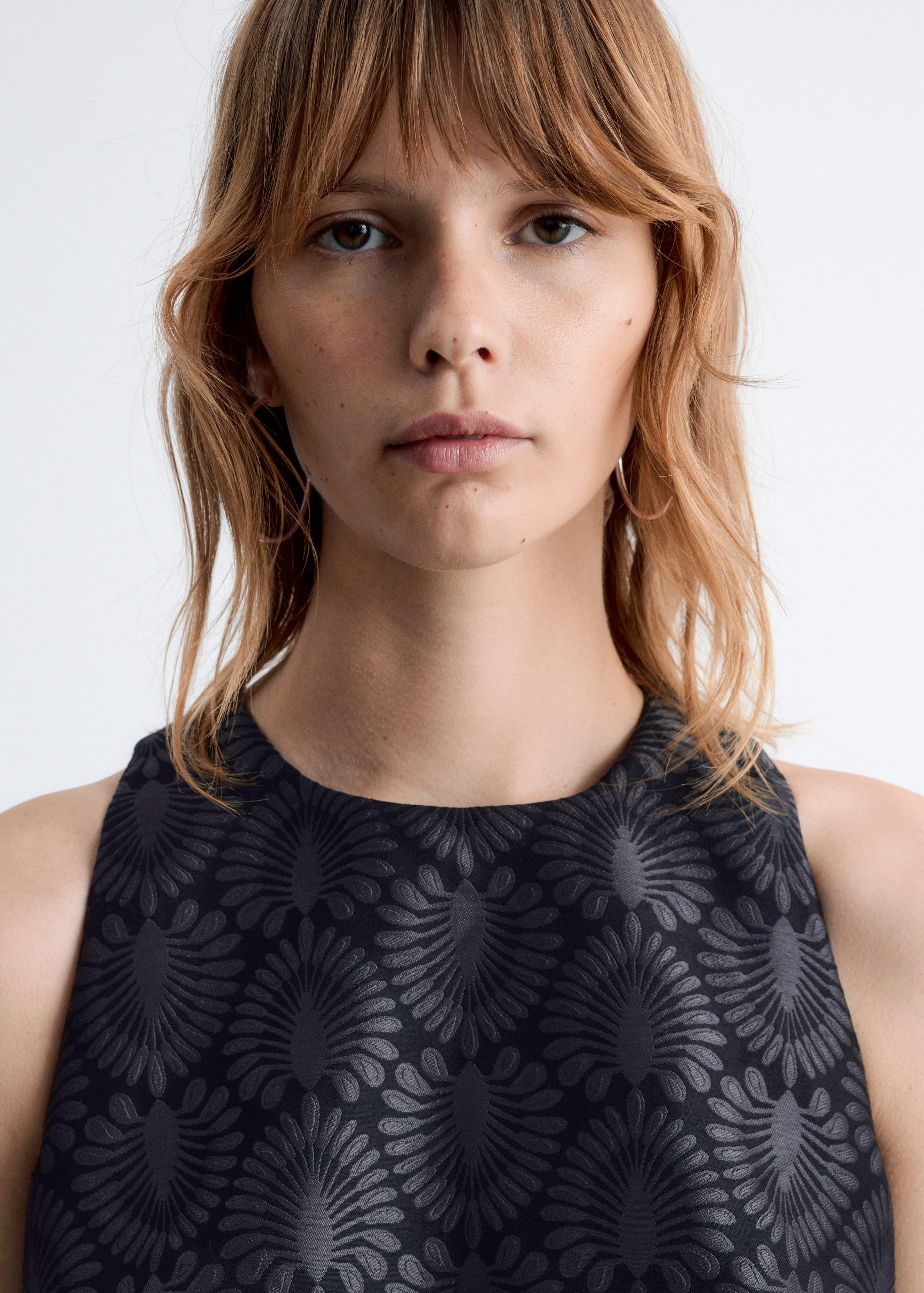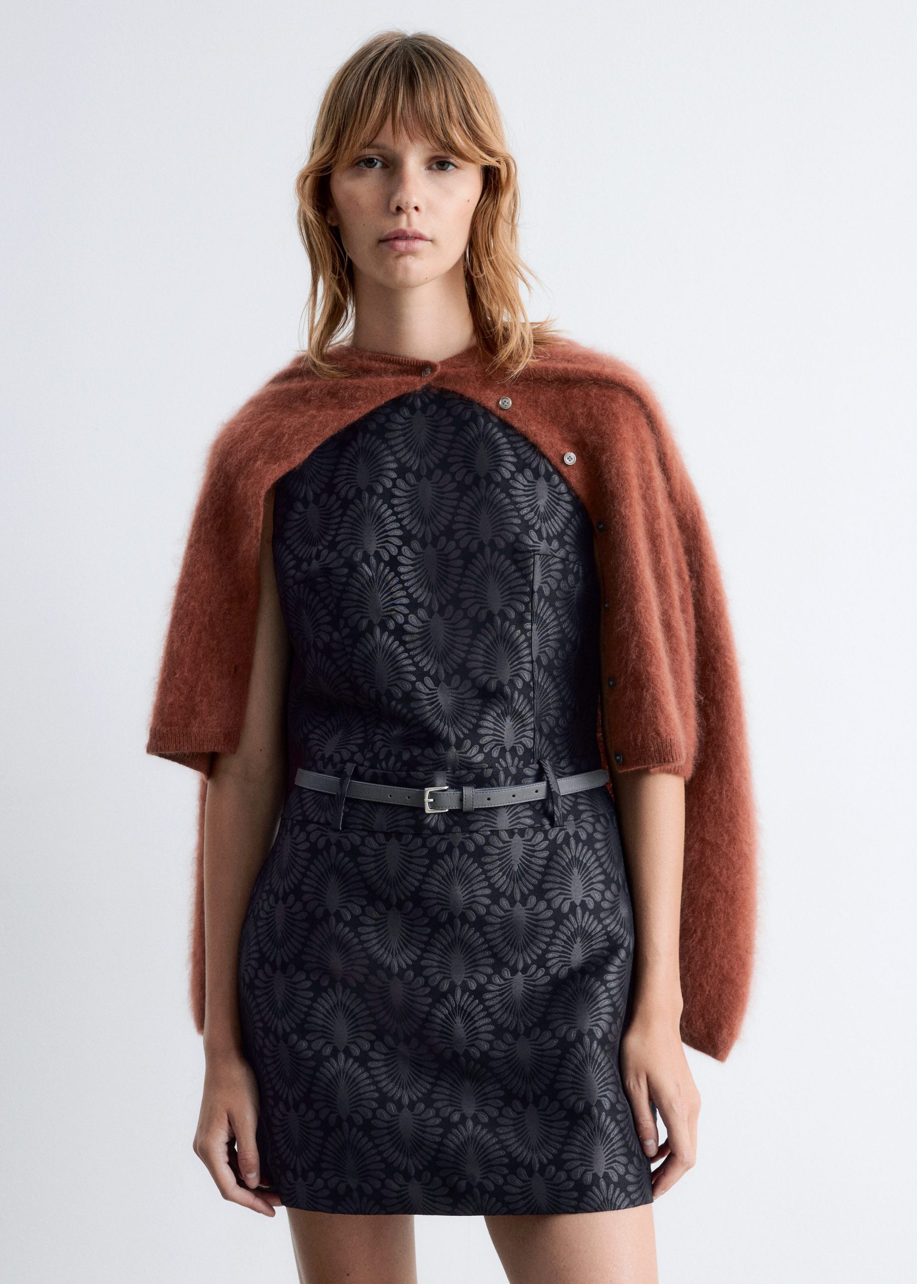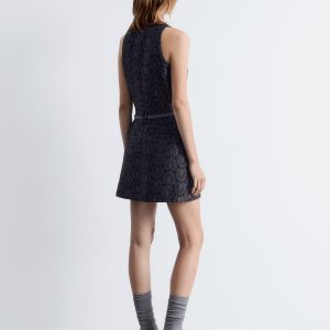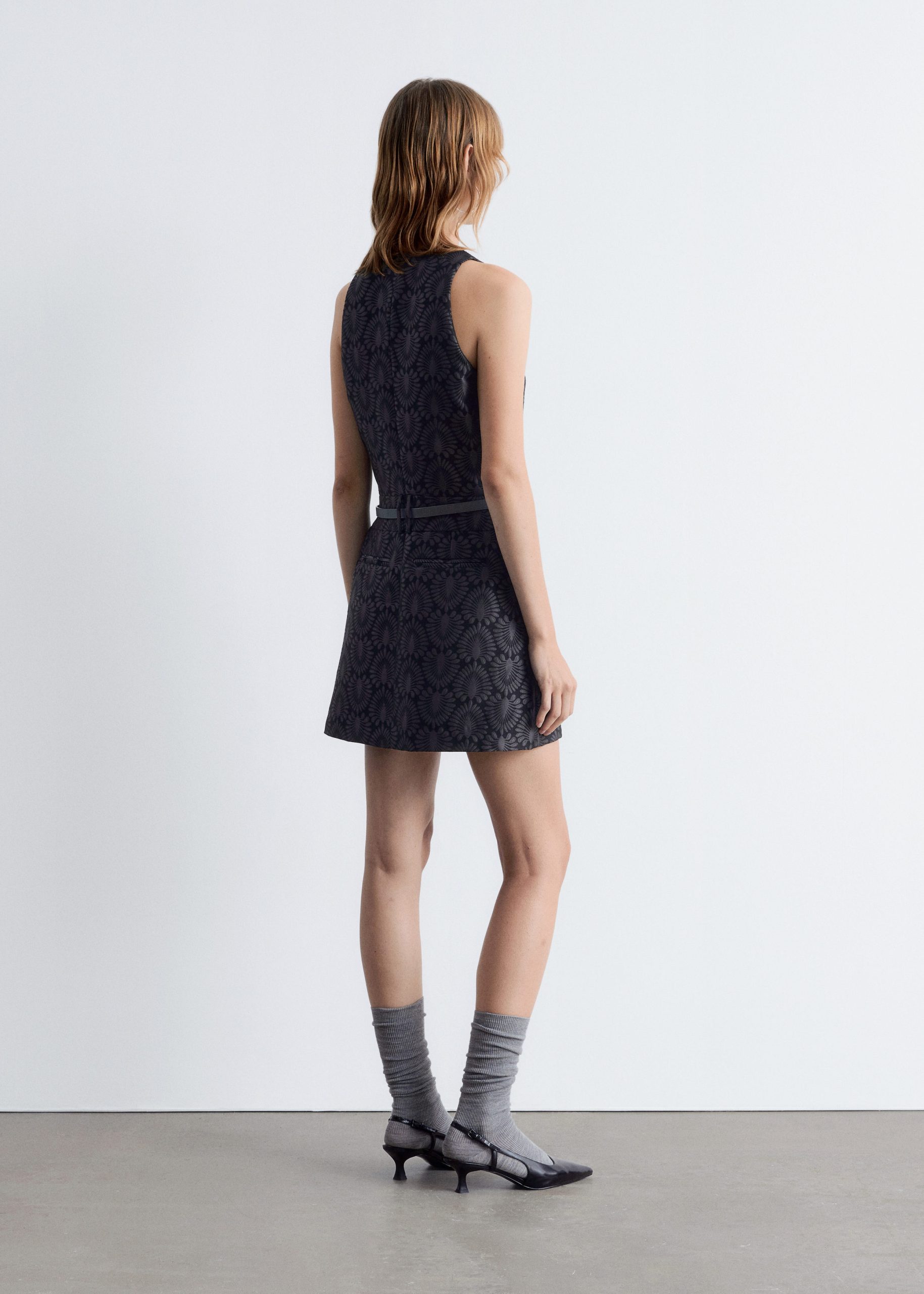 This mini dress is crafted from a satin brocade fabric with a richly textured peacock tile pattern. Cut in a sleeveless design, it features a round neck and a fake belt detail at the waist. Finished with a keyhole closure at the neck and a concealed side zipper with hook-and-eye closure.