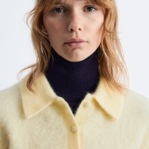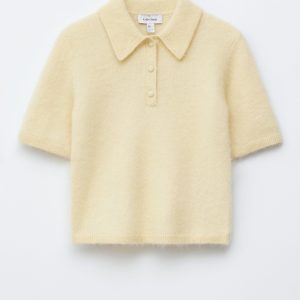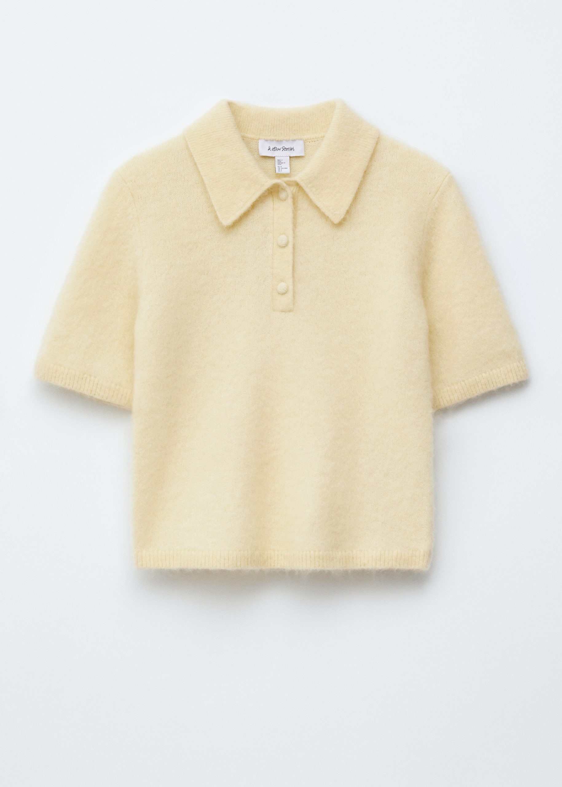 This t-shirt is knitted from a merino wool and mohair blend with a soft, brushed texture. It’s cut in in a straight silhouette with short sleeves and features a turn-down collar and a half-button placket. Finished with ribbed trims at the sleeves and hem.
