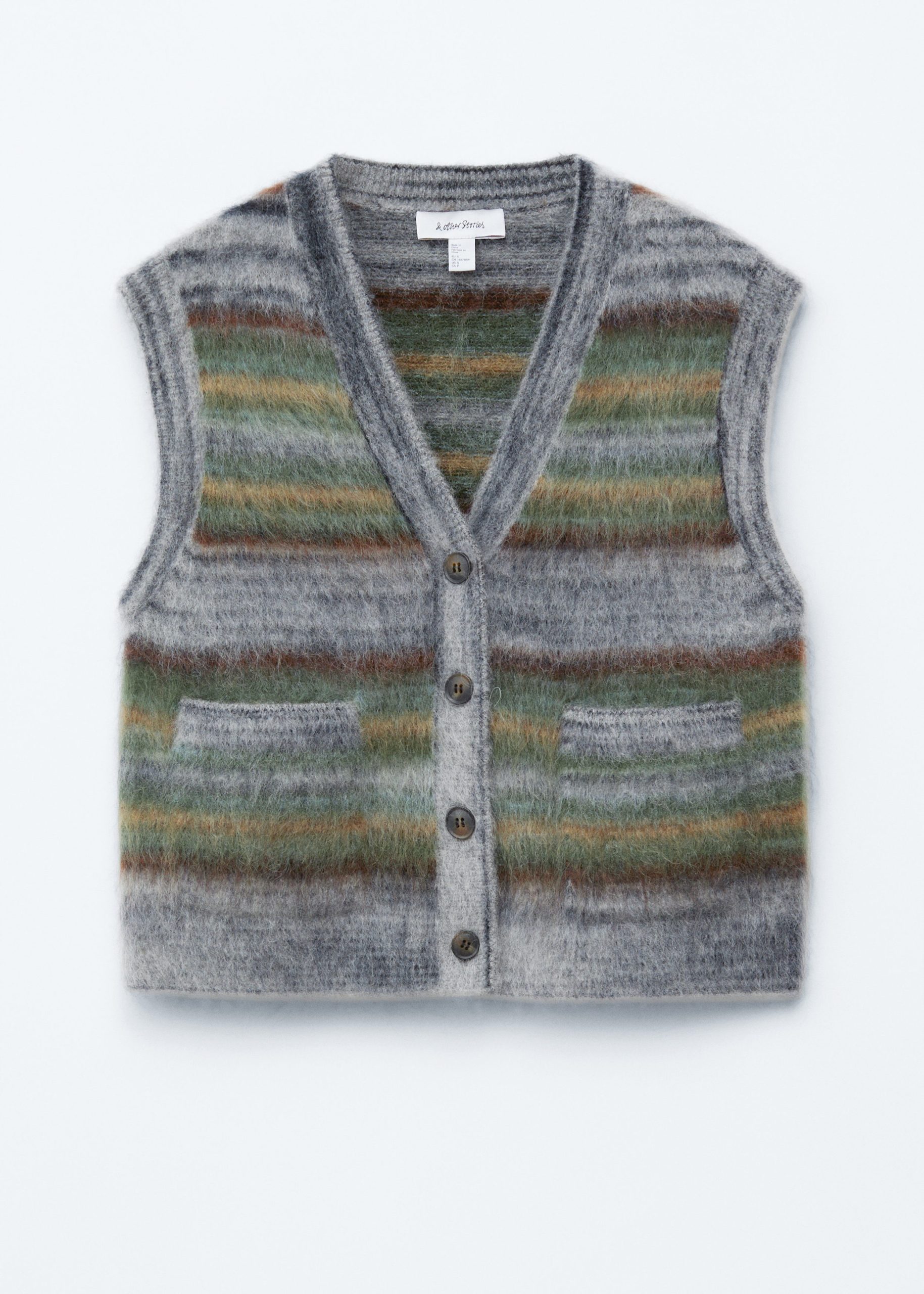 This vest is knitted from a mohair and wool blend with a brushed, tacile finish. It features a V-neckline, ribbed trims, and two front patch pockets. Finished with buttons down the front. Layer it over shirts and T-shirts.Â