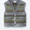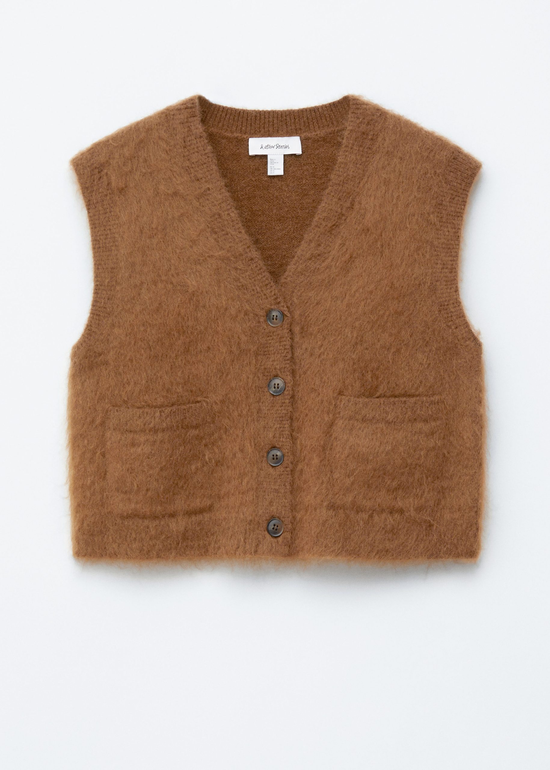 This vest is knitted from a mohair and wool blend with a brushed, tacile finish. It features a V-neckline, ribbed trims, and two front patch pockets. Finished with buttons down the front. Layer it over shirts and T-shirts.Â