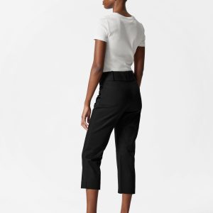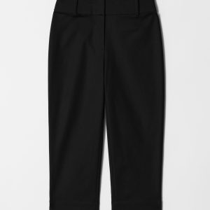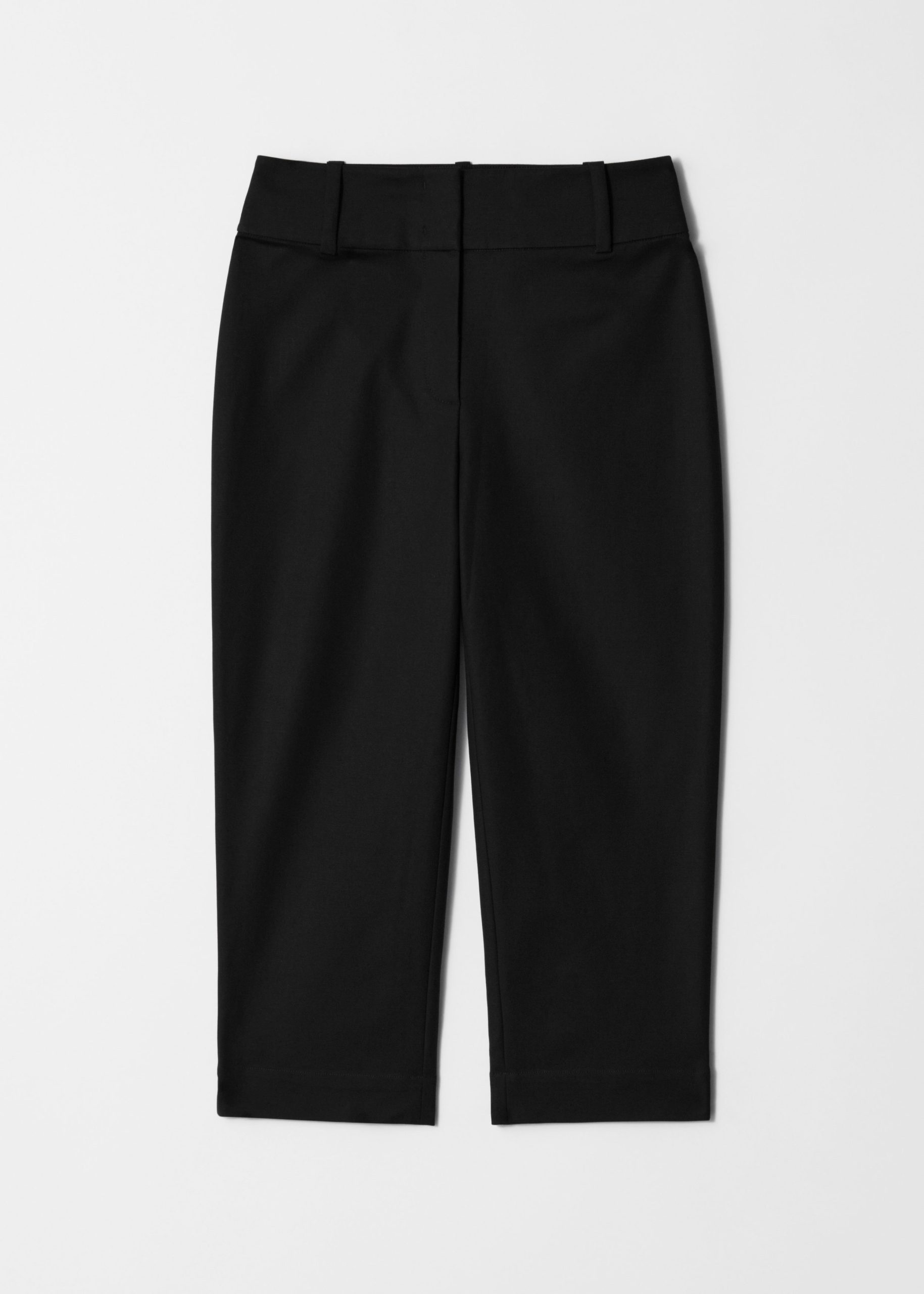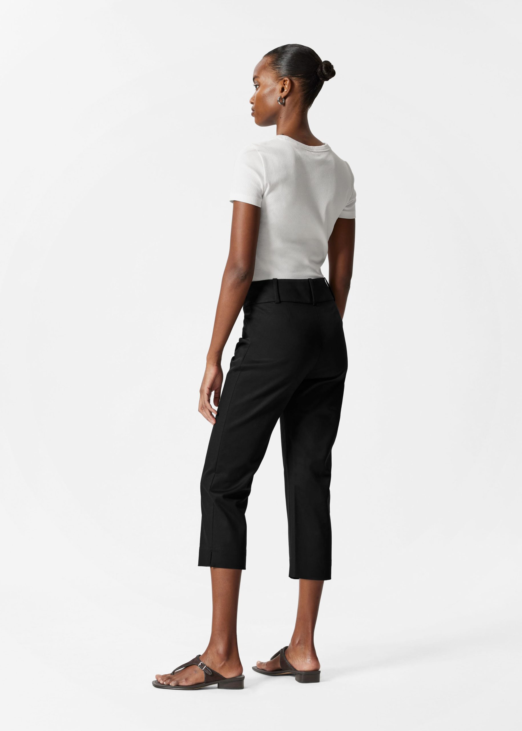 Capri trousers designed in a slim-fitting tailored silhouette with a cropped leg. Featuring a wide waistband and a hook and bar closure.