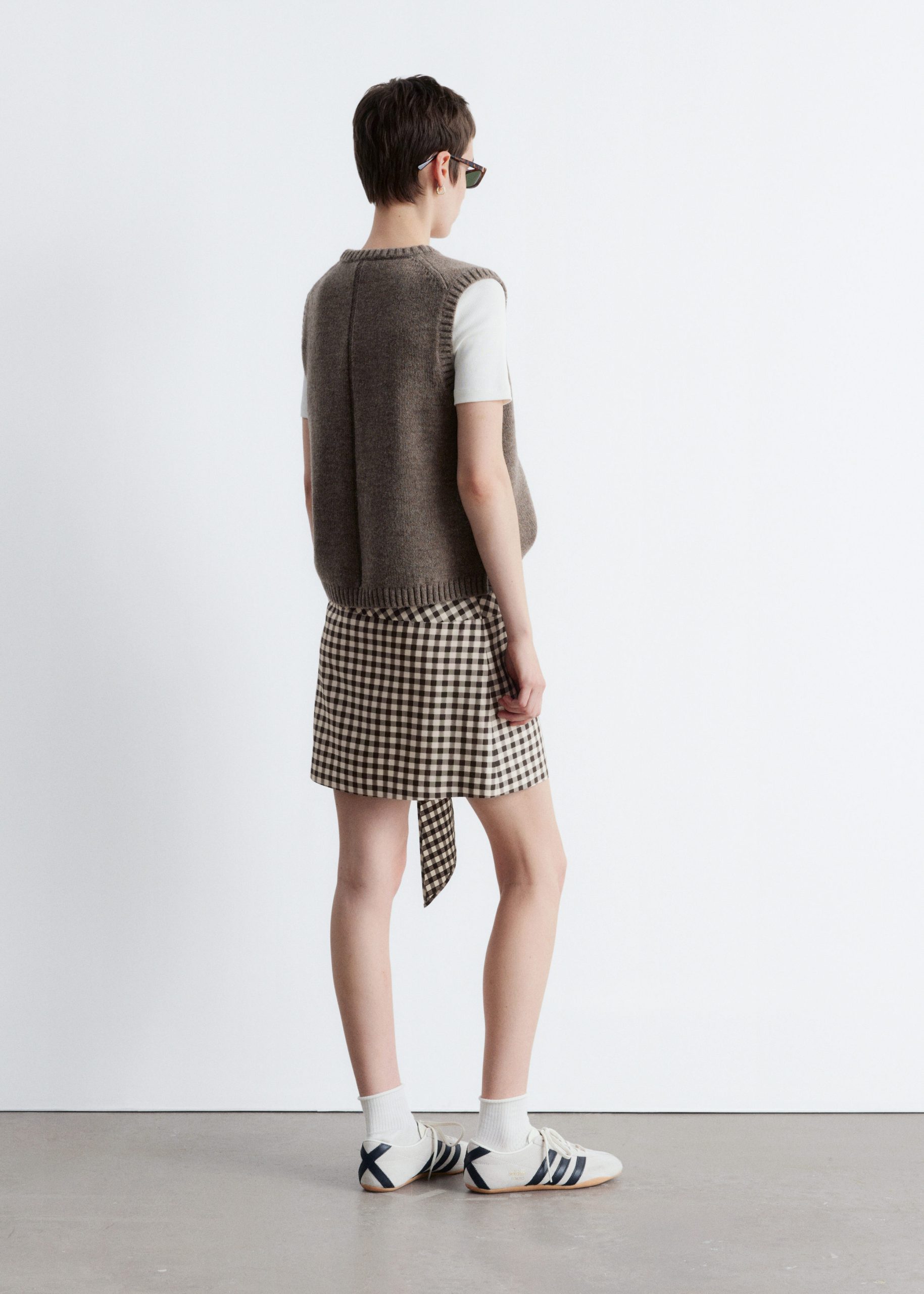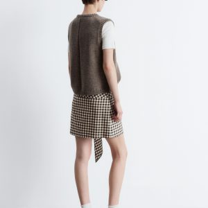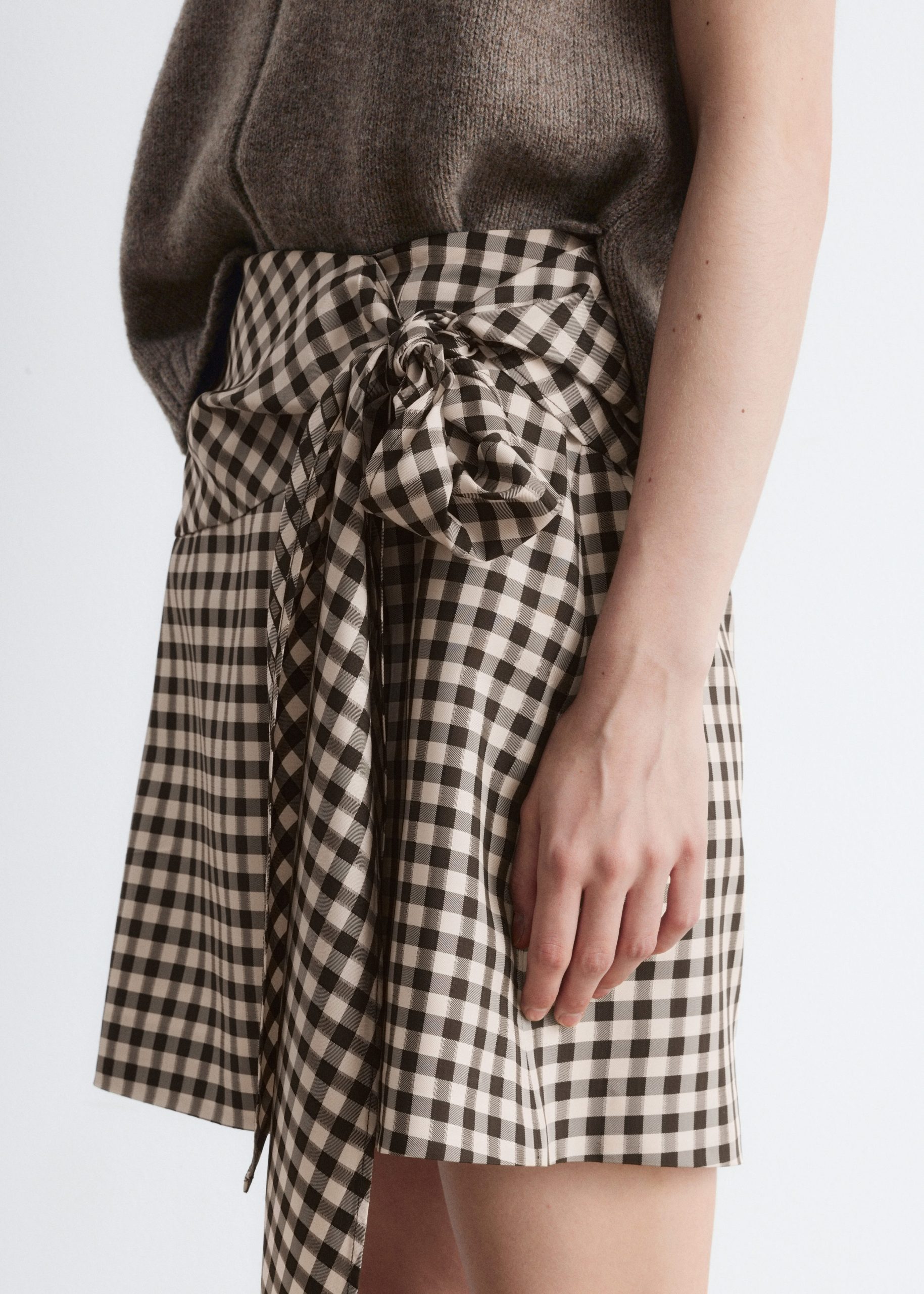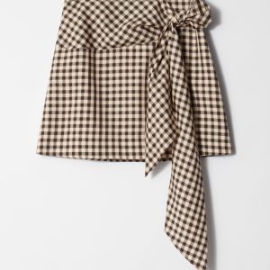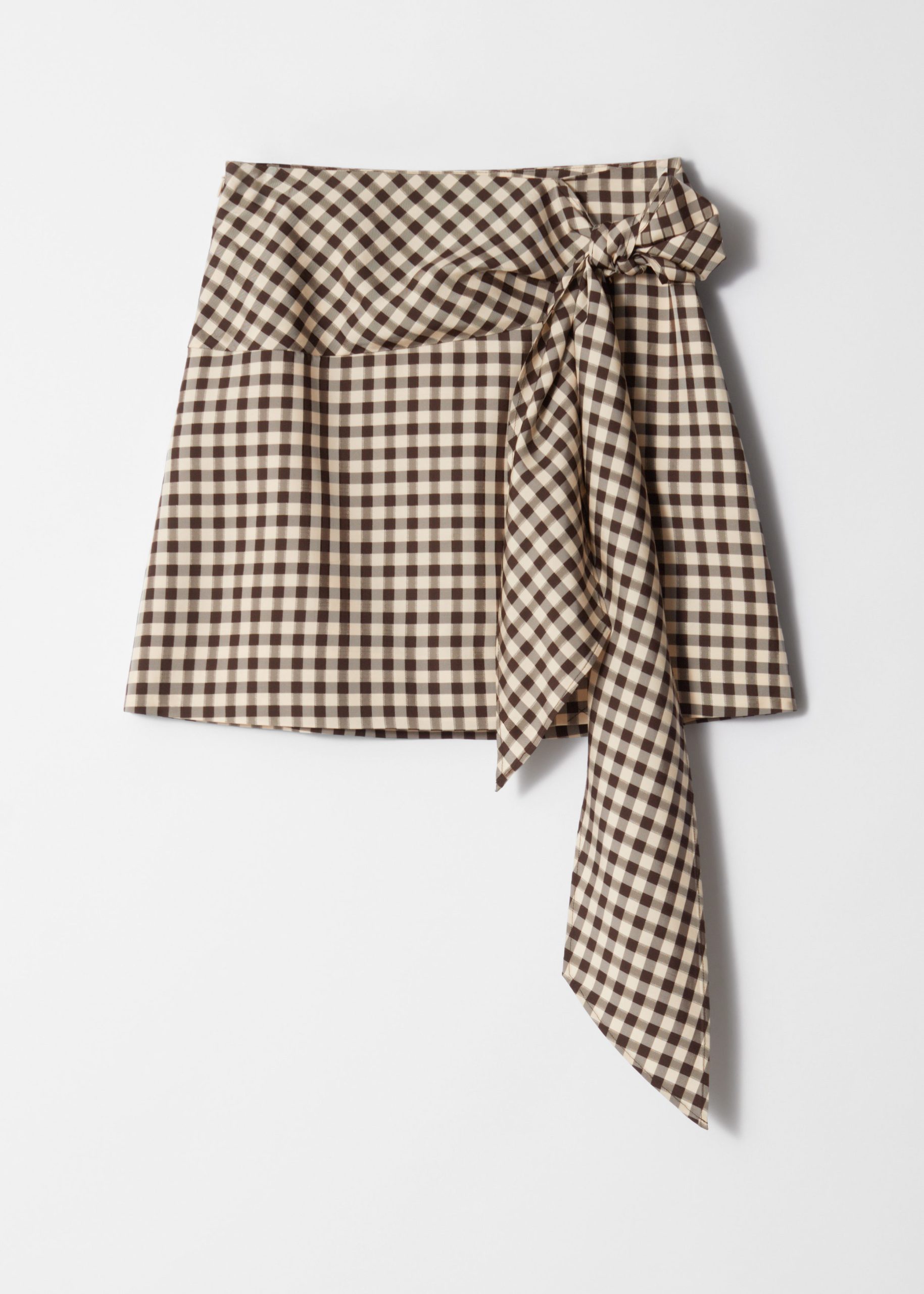 This mini skirt is tailored from a lightweight fabric in a brown and off-white checkered pattern. Designed in an A-line silhouette, it features a high waist and a fixed wrap tie-detail, finished with an invisible side-seam zipper. Part of a two-piece set, it pairs perfectly with the matching checkered blazer for a statement co-ord look.