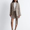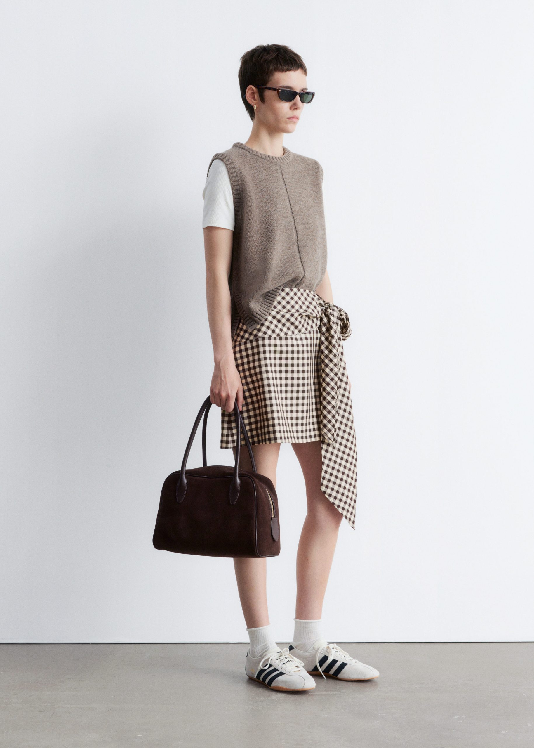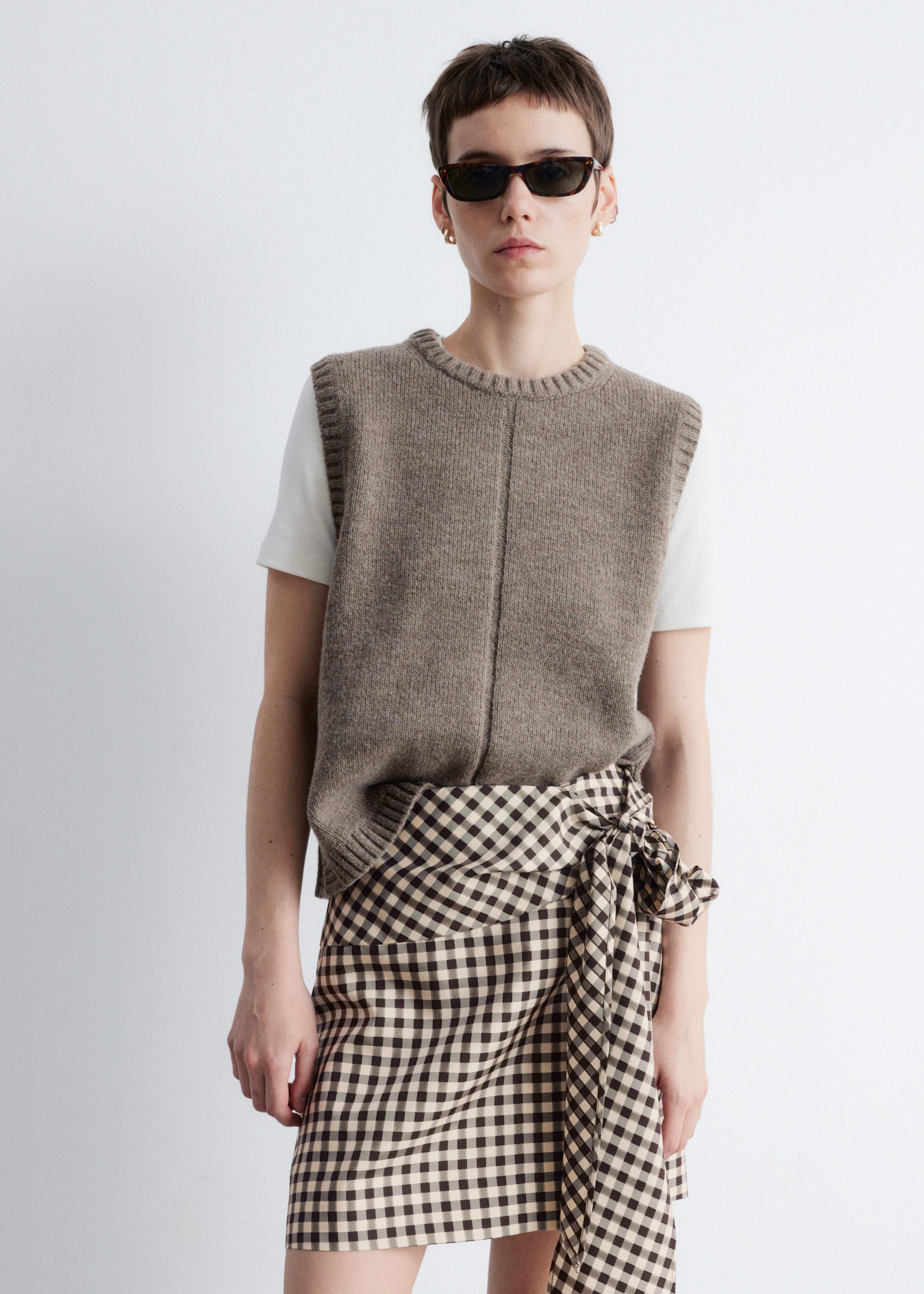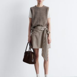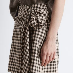 This mini skirt is tailored from a lightweight fabric in a brown and off-white checkered pattern. Designed in an A-line silhouette, it features a high waist and a fixed wrap tie-detail, finished with an invisible side-seam zipper. Part of a two-piece set, it pairs perfectly with the matching checkered blazer for a statement co-ord look.