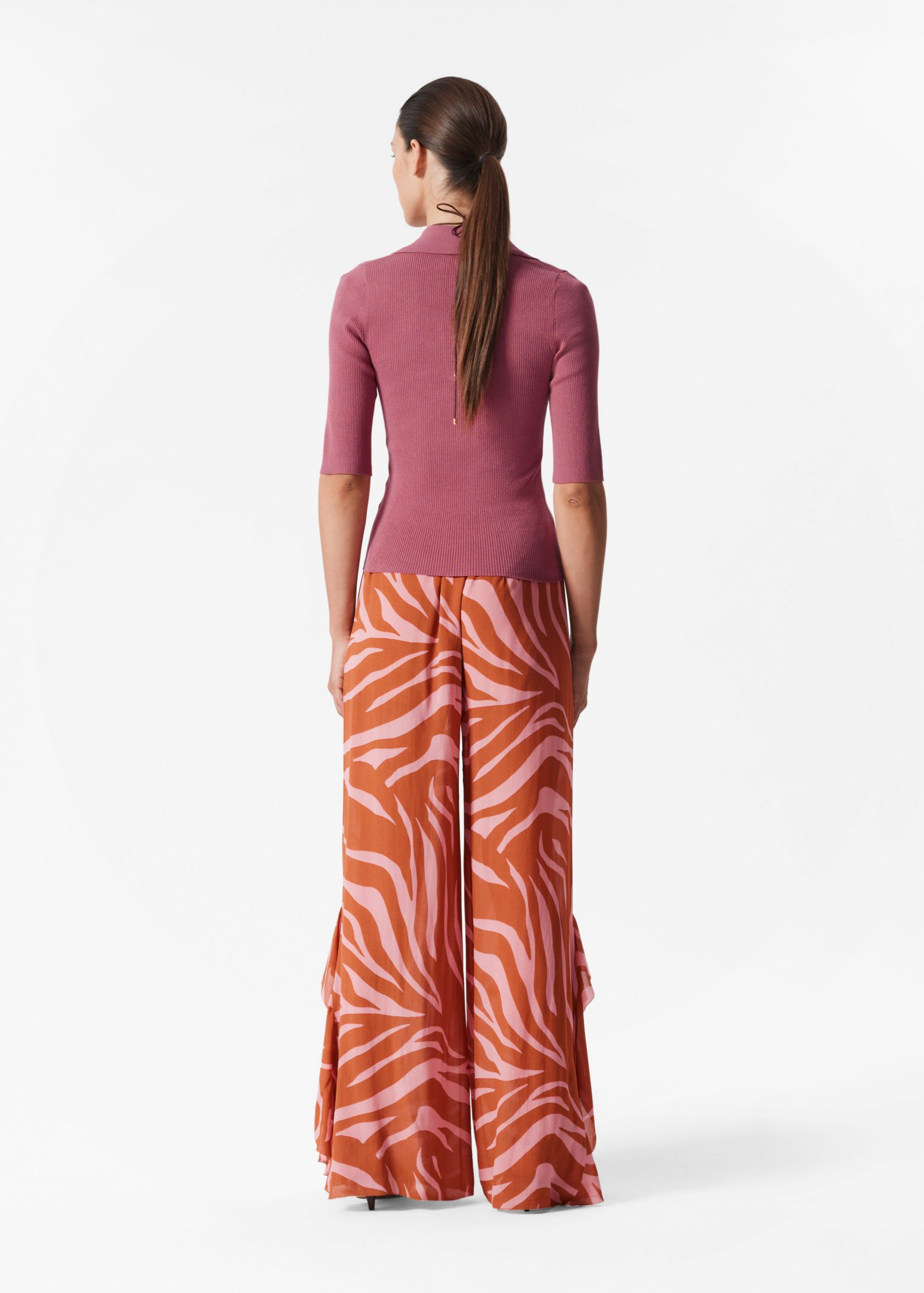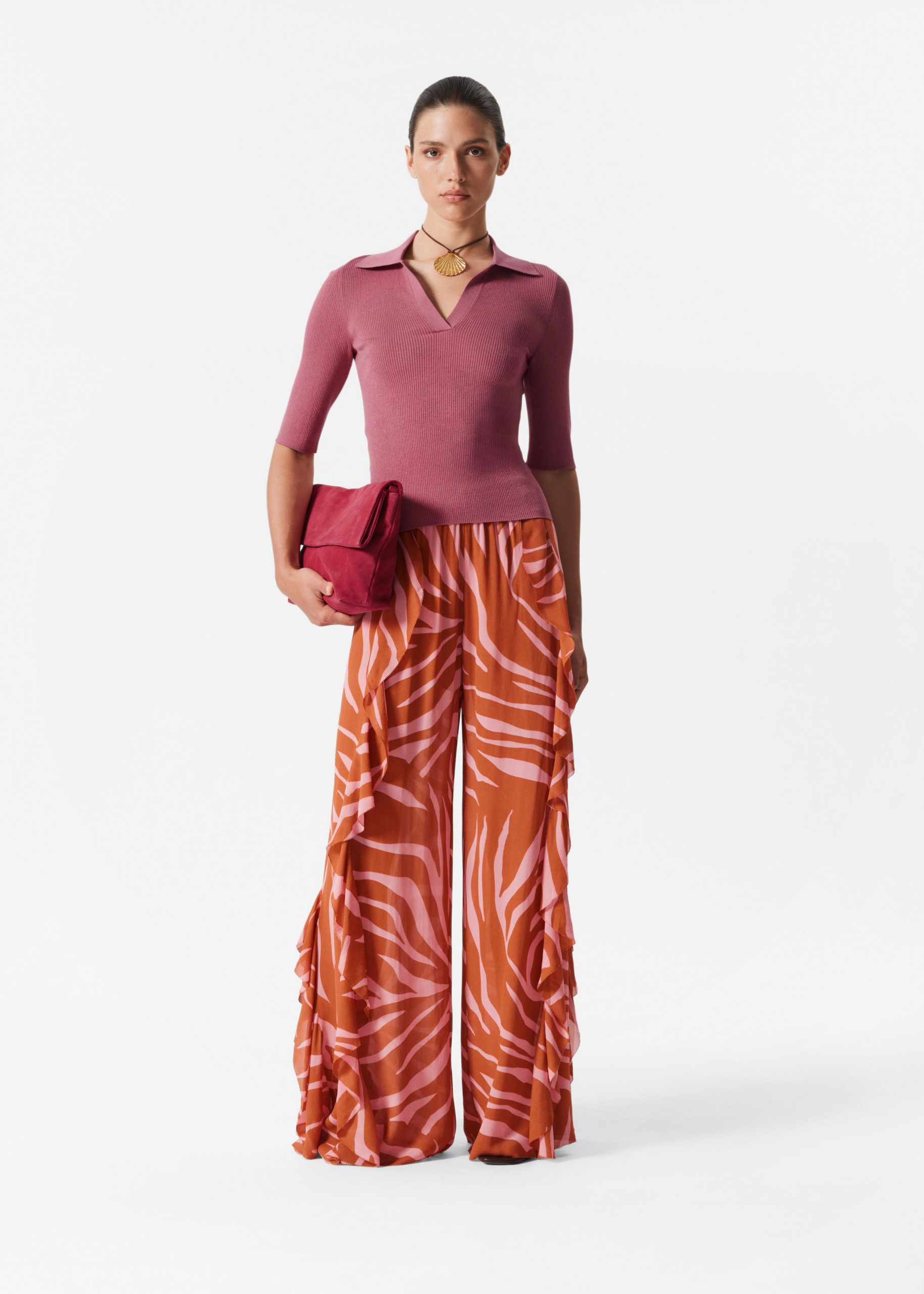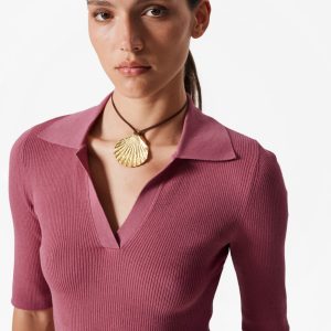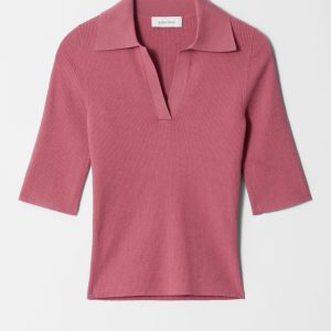 Slim short-sleeve knit top featuring a ribbed finish and a collared, v-cut neckline.