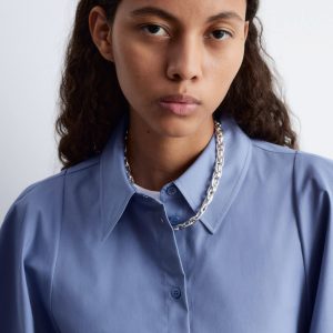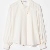 Short-sleeve blouse made from soft velvet with an extended pointed collar and keyhole detailing.