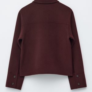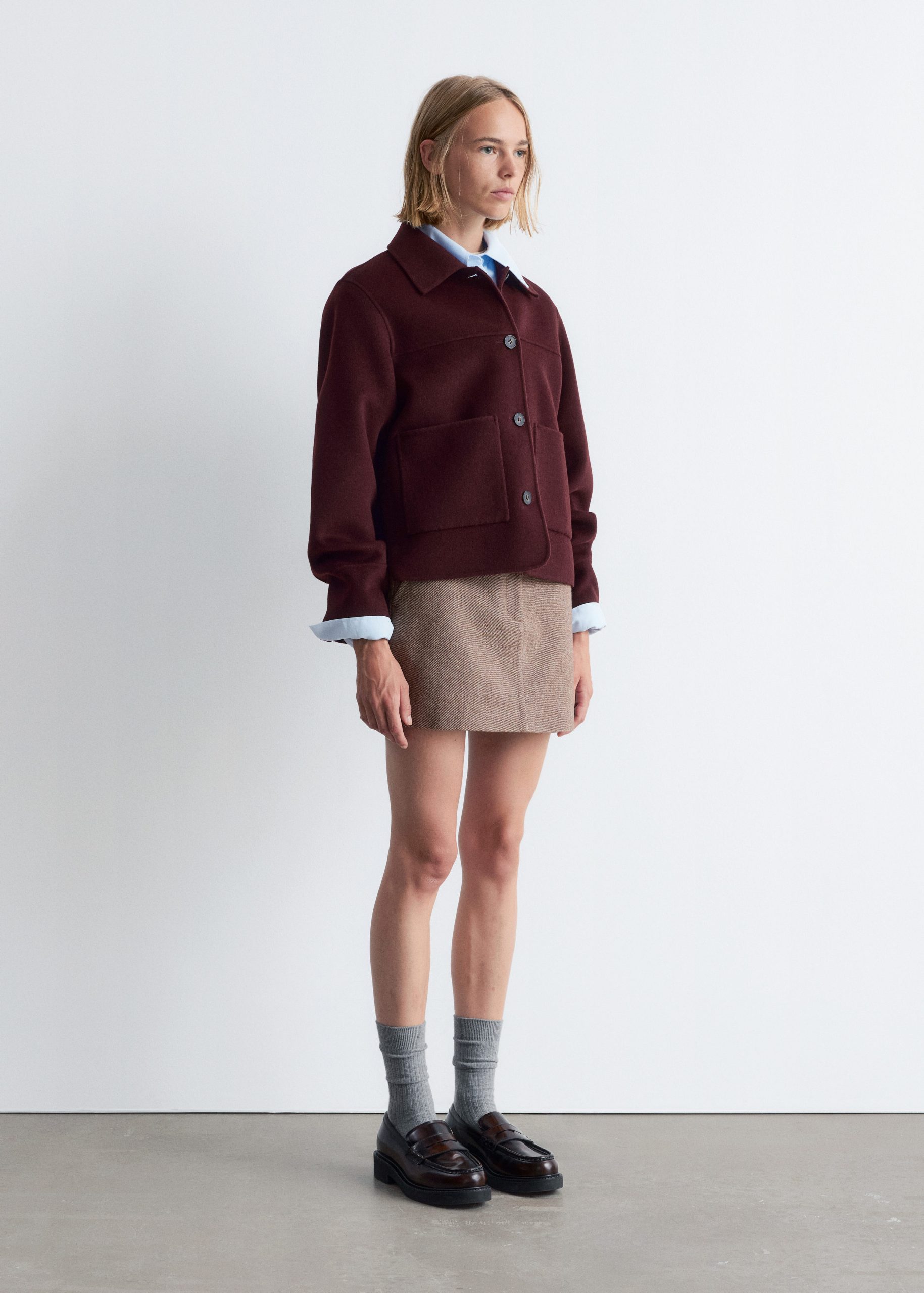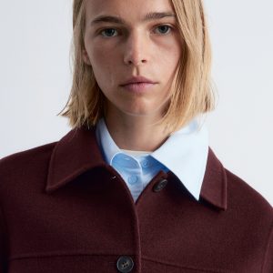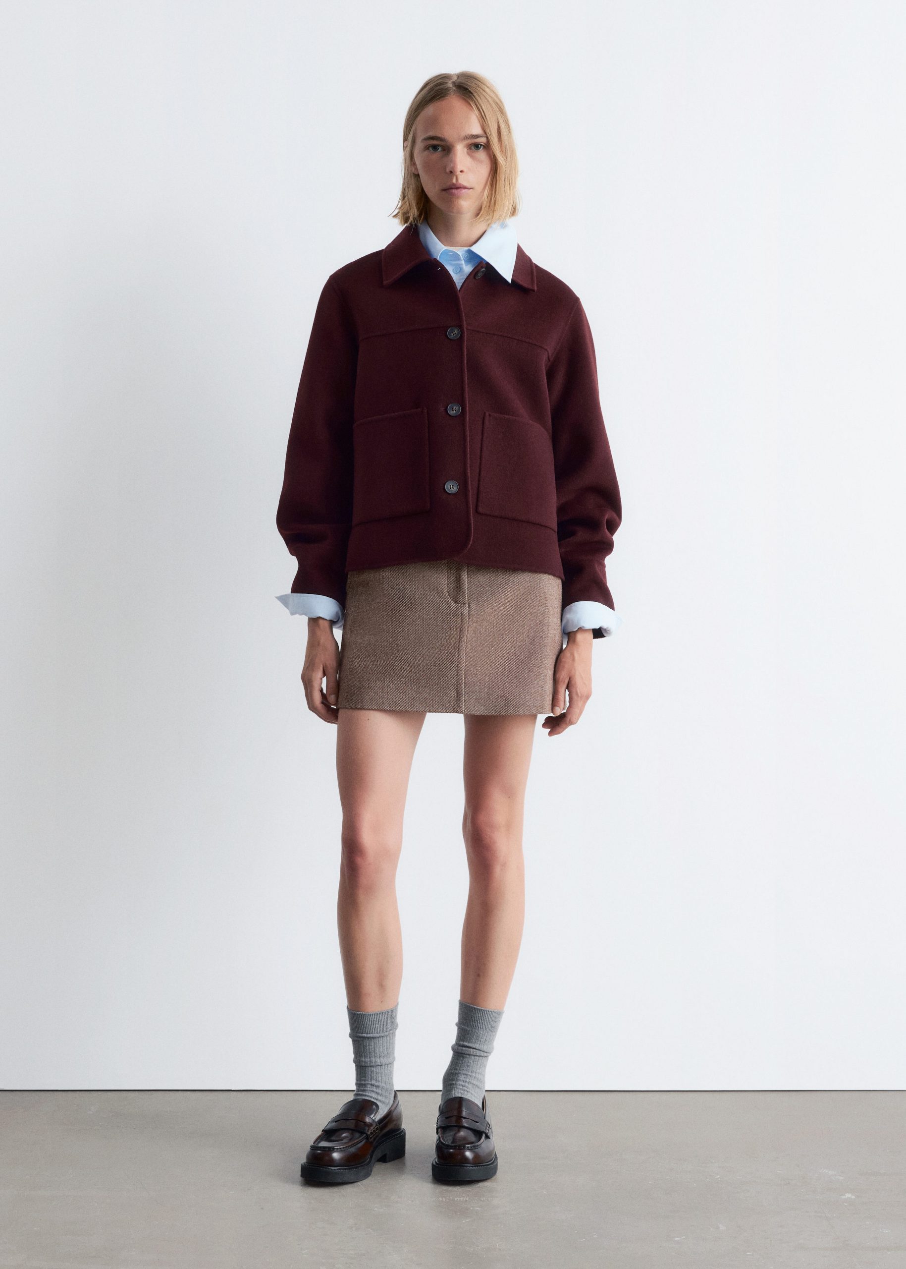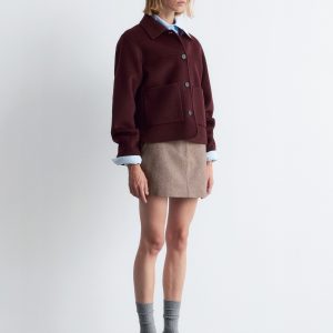 Collared wool-blend jacket featuring a classic collar, and large duo patch pockets in the front.