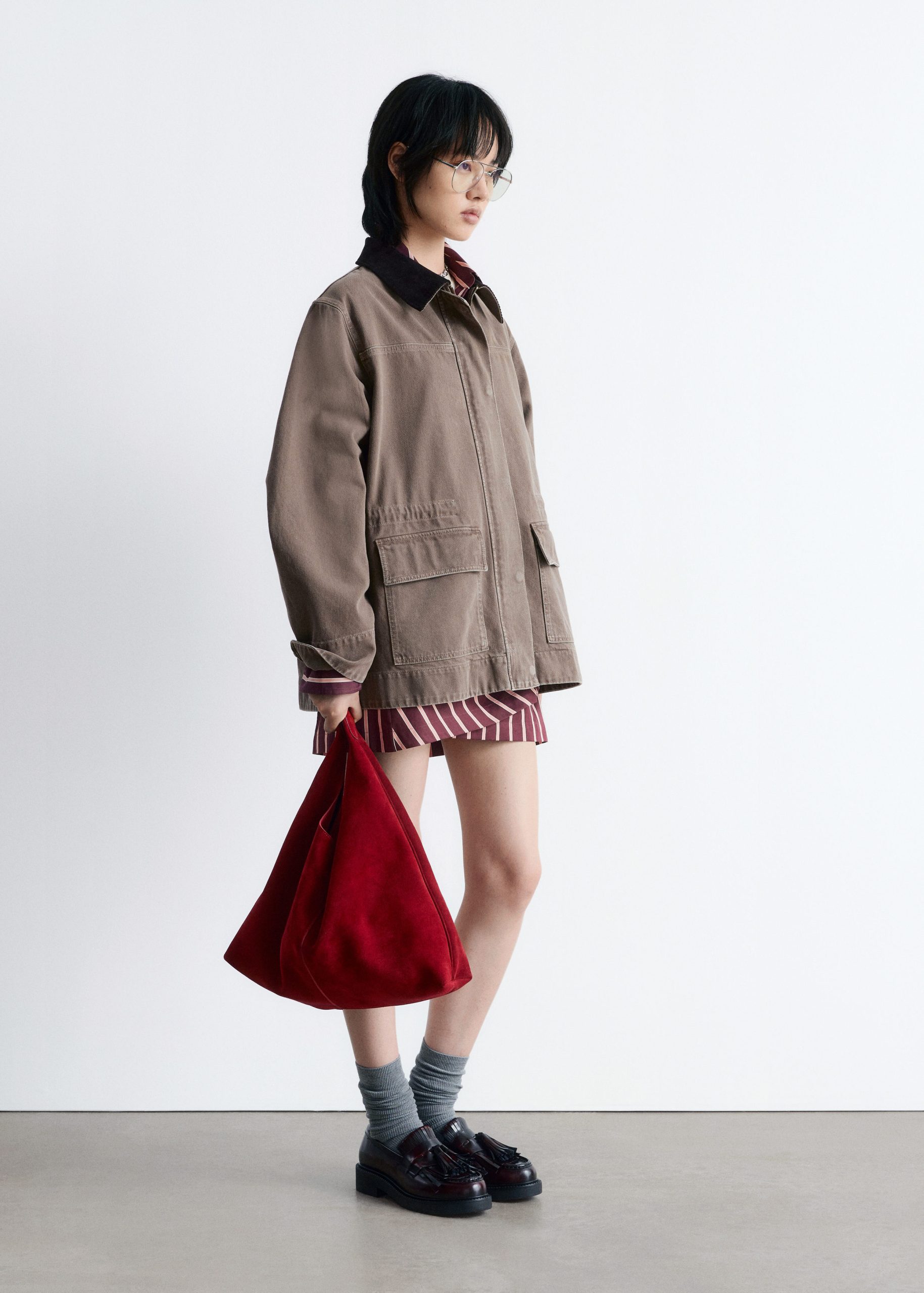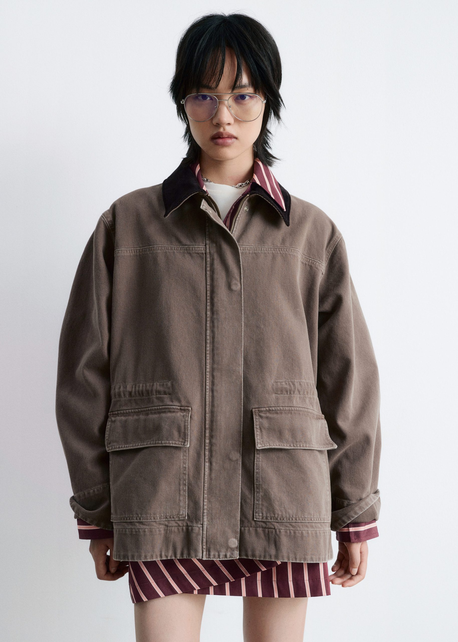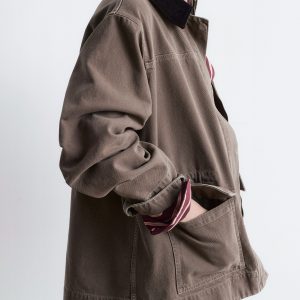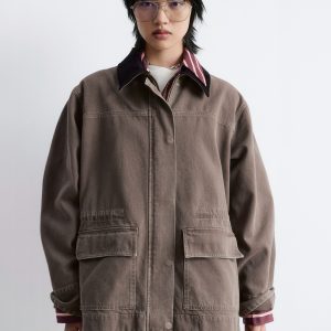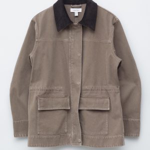 This field jacket is crafted from a rigid denim fabric made from 100% cotton. Cut in a loose silhouette, it features a corduroy collar in a contrasting colour, topstitched seams, a hidden placket with zip closure and press buttons, and two large flap pockets at the front.