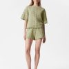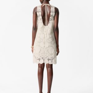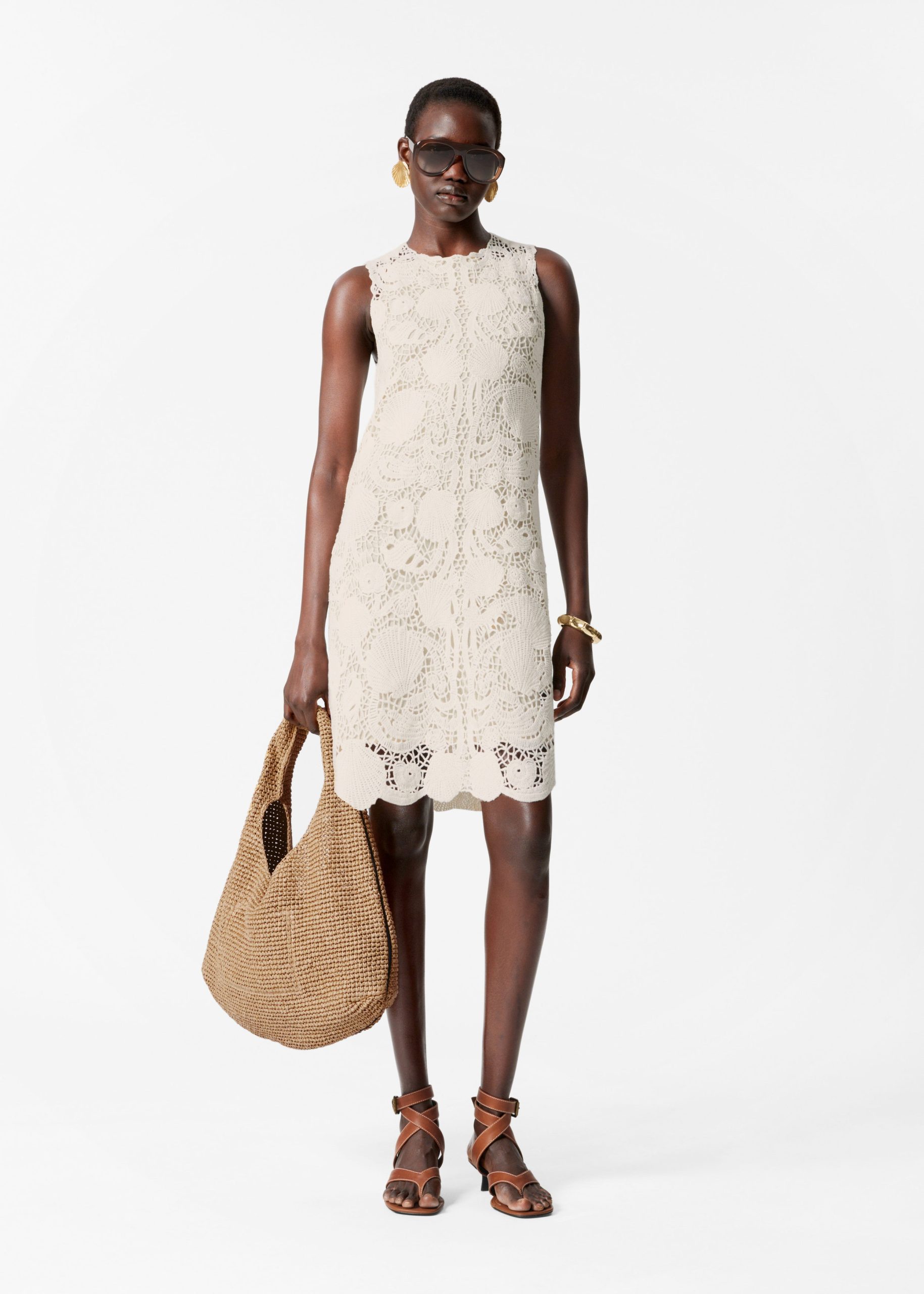 Showcasing modern craftmanship, this mini dress is made from pure cotton in a delicate pointelle-knit crochet, featuring intricate shell motifs. Designed in a sleeveless A-line silhouette, it features a high round neck and a scooped open back, finished with pearl-accented tie-bands at the neck. Lined with a woved slip dress underneath for added coverage.