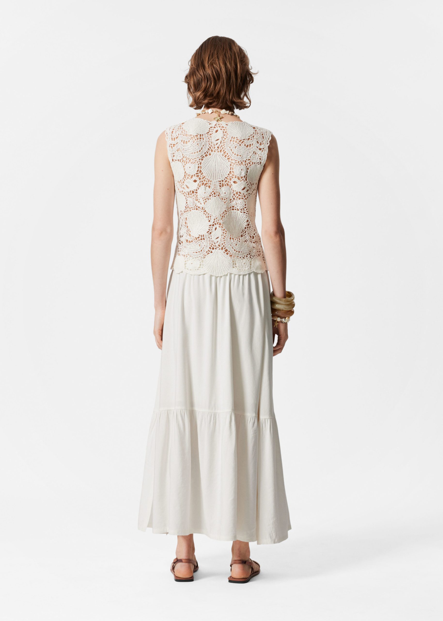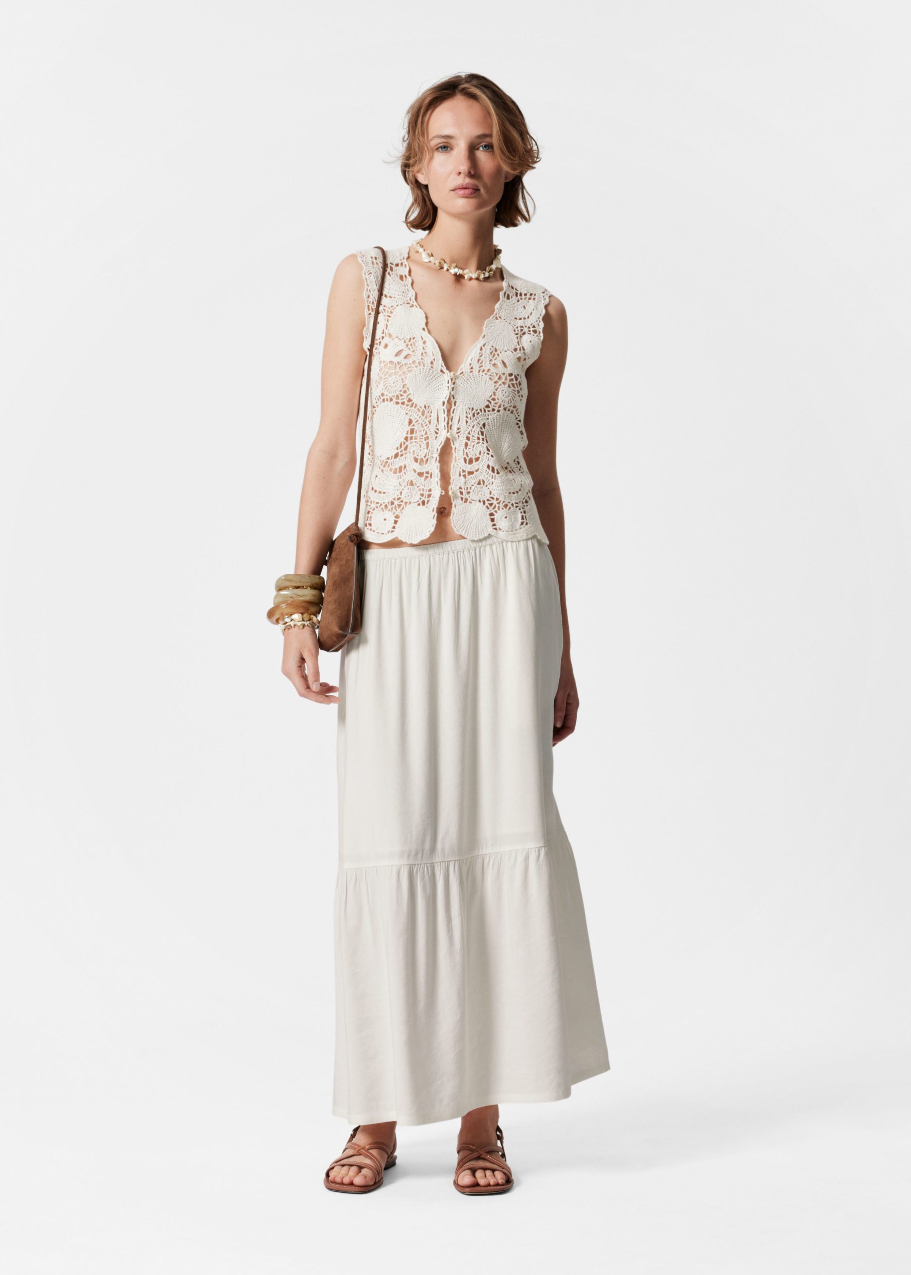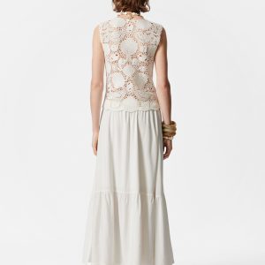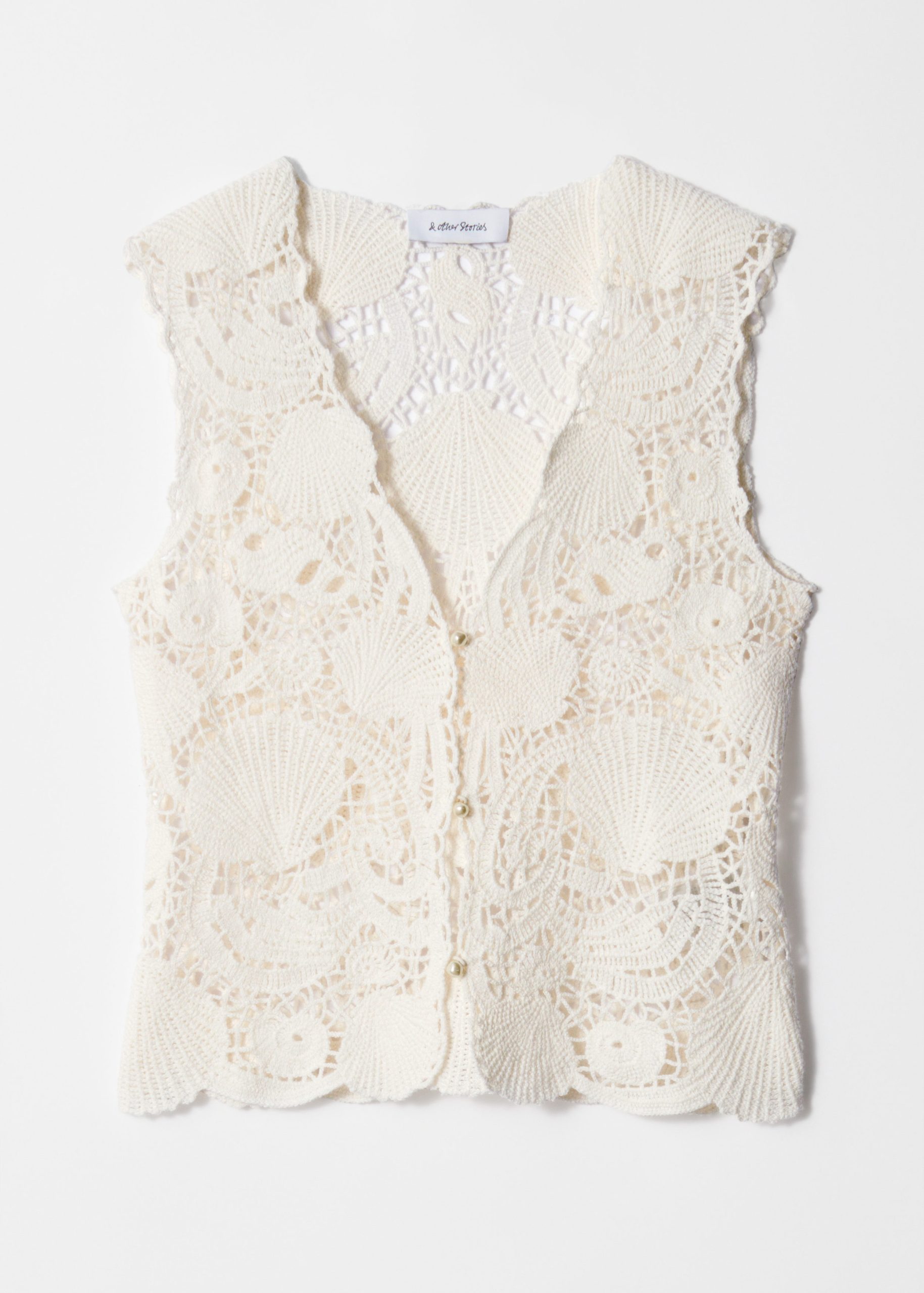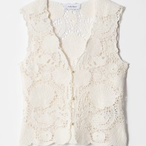 A modern take on 70’s boho, this sleeveless vest top is crafted from pure cotton in a pointelle-knit crochet design featuring shell motifs, offering an artisanal feel to your wardrobe. Traced with delicate pearl buttons down the front. Pair with a flowy maxi skirt or denim shorts.Â