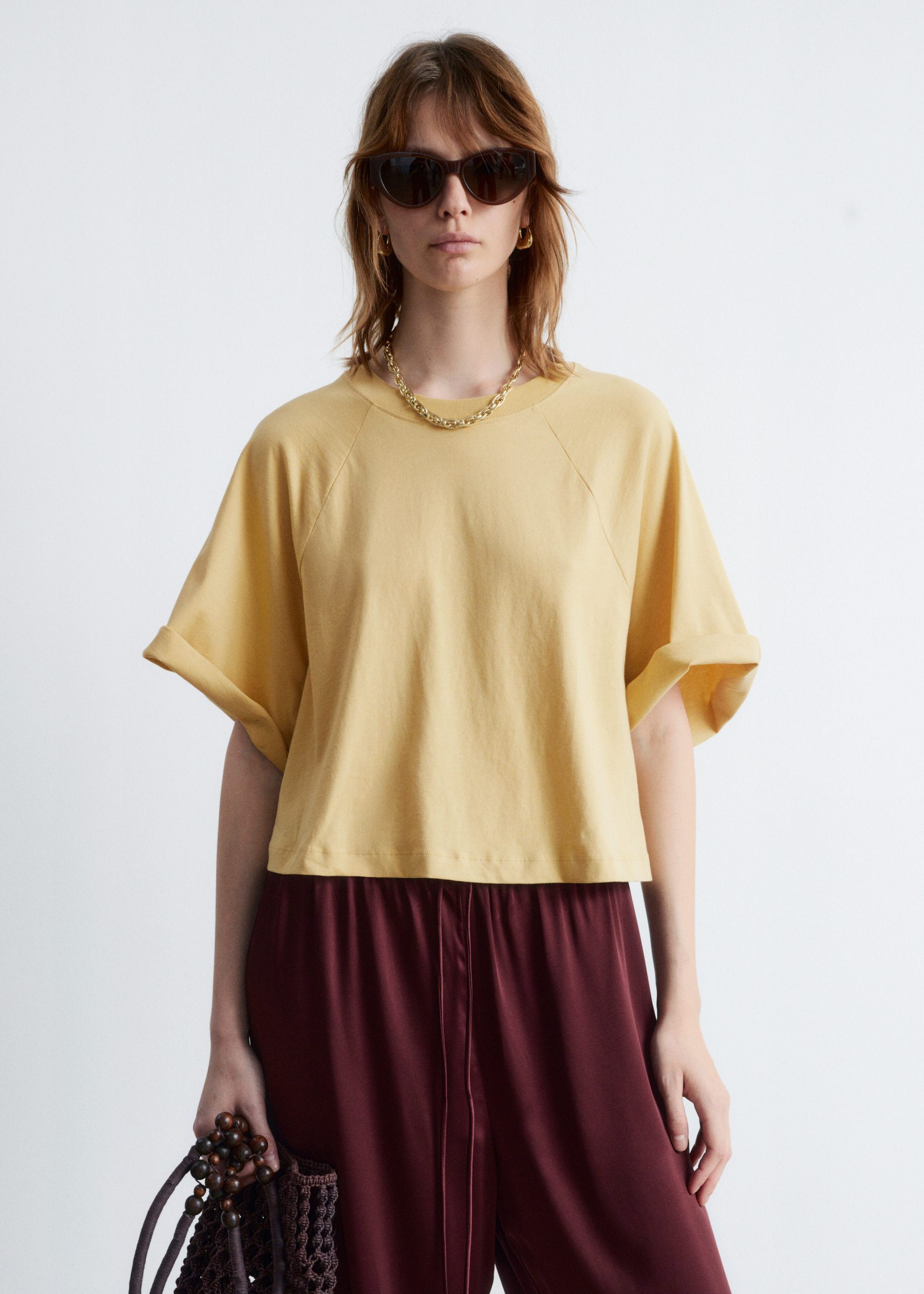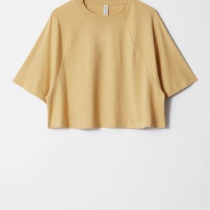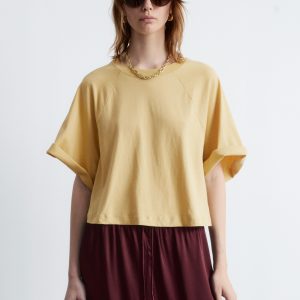 The cornerstone of every capsule wardrobe, this t-shirt is crafted from a soft and stretchy jersey cotton fabric. Cut in a cropped, wide silhouette, it features a classic round neck and three-quarter raglan sleeves. Pair it with jeans, tailored trousers, or a mini skirt.Â