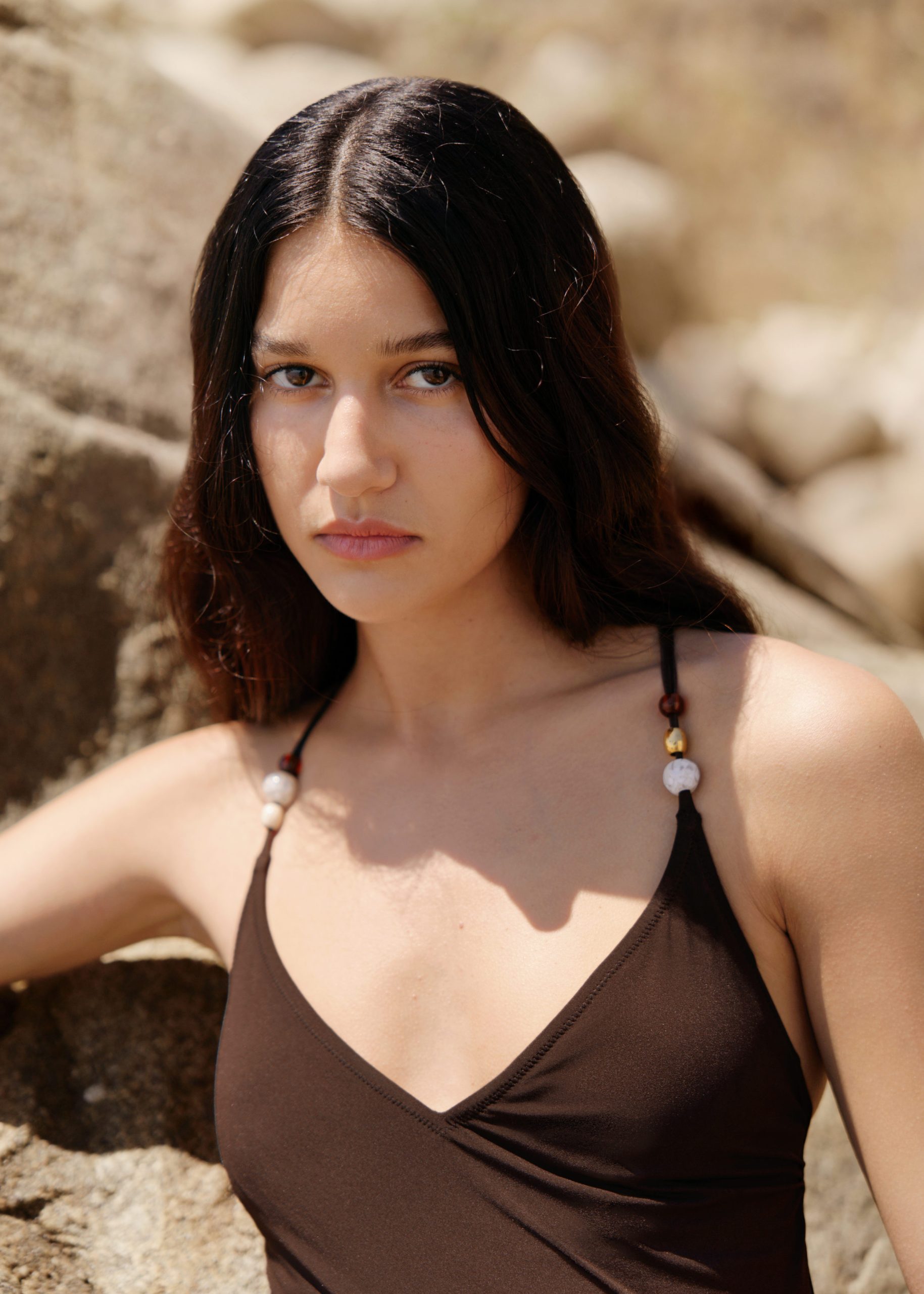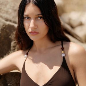 V-neck swimsuit designed with a classic cross back, featuring thin adjustable straps adorned with decorative beads. Finished with a self-tie closure at the back, and light padding for added support.