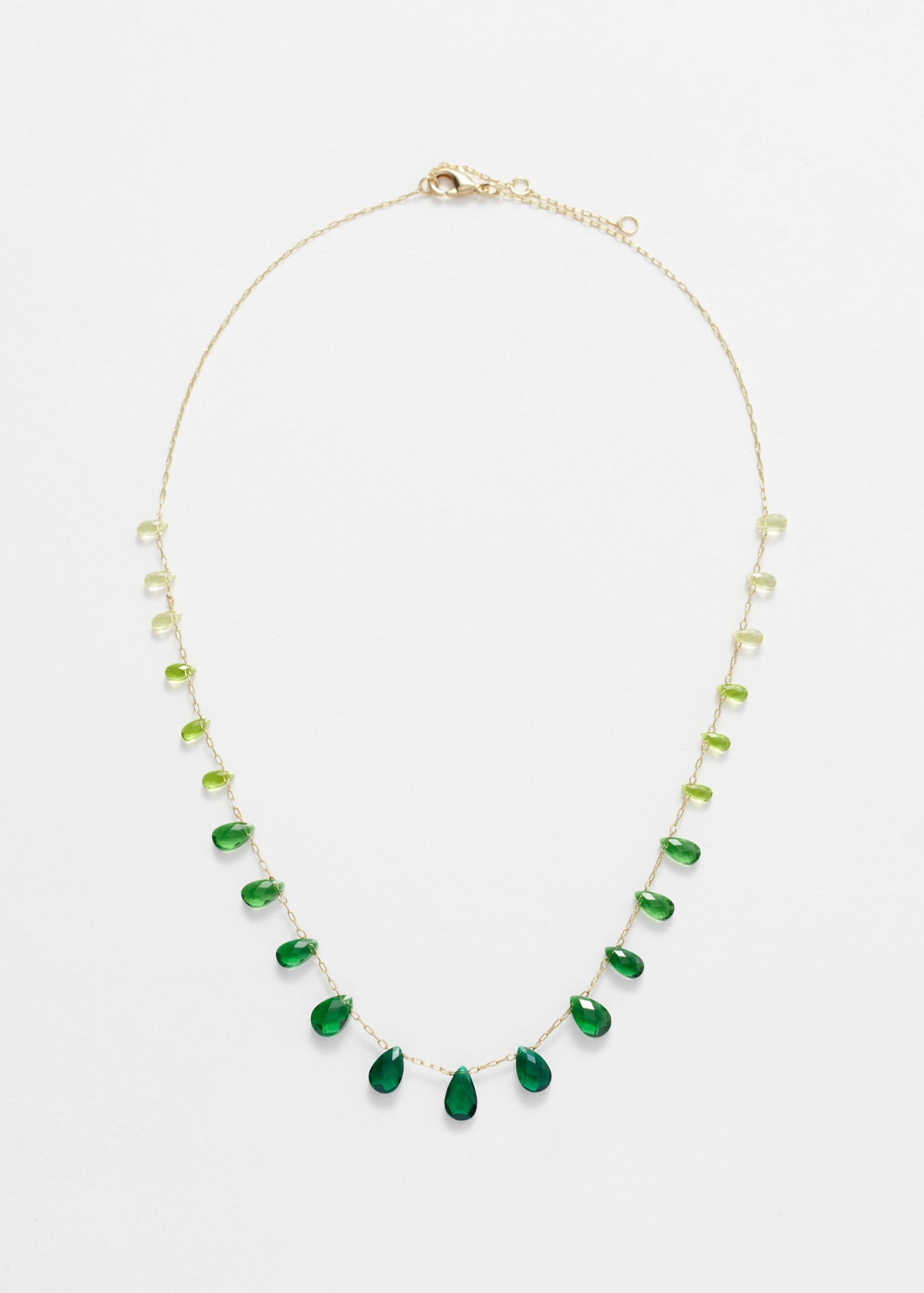 This delicate paperclip chain necklace is crafted from brass with a slightly hammered finish. It features faceted glass crystals that gradually increase in size and colour intensity towards the front, creating an appealing sense of depth. Finished with an adjustable length and a trigger clasp.