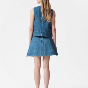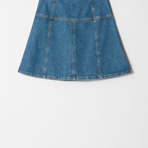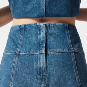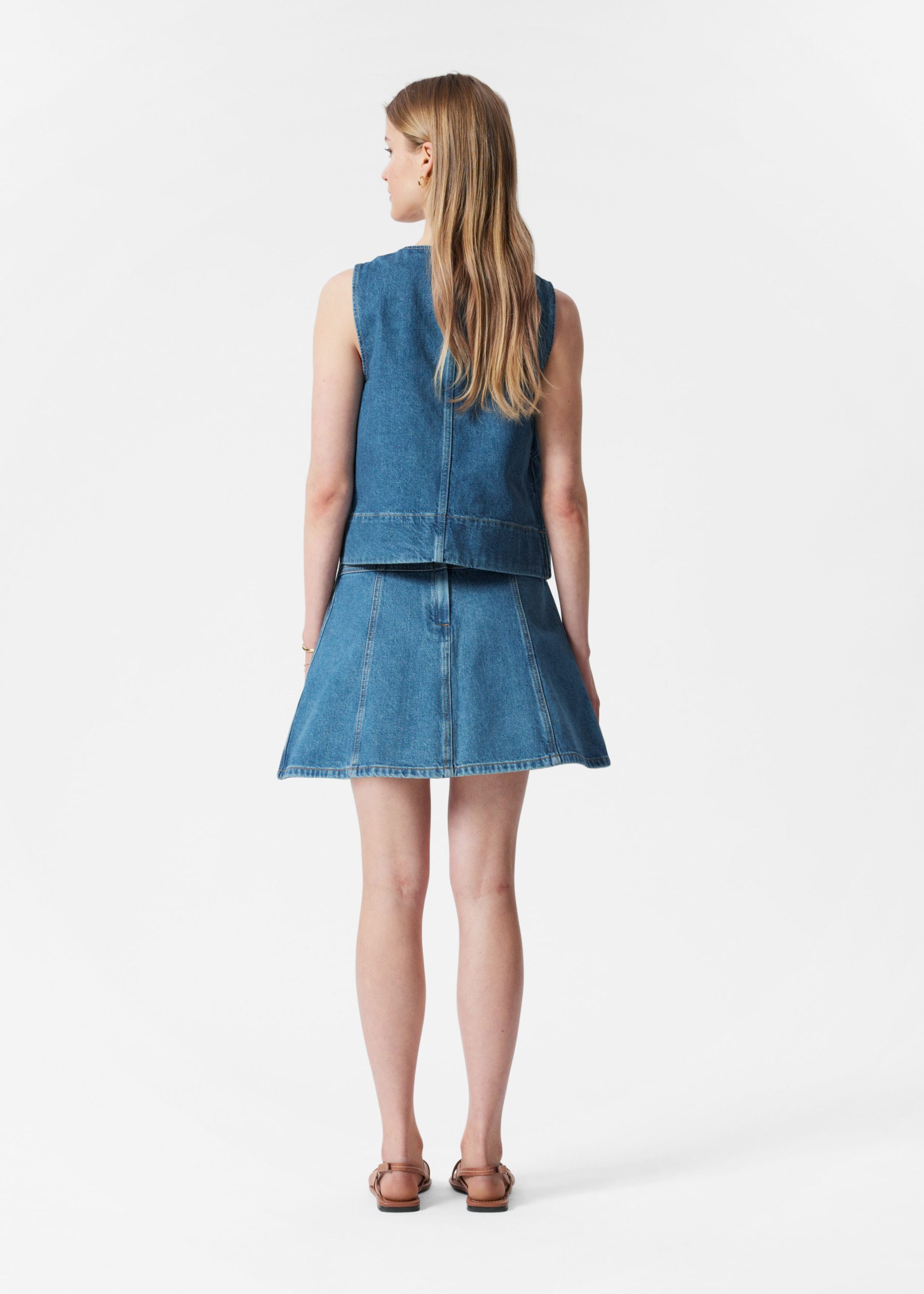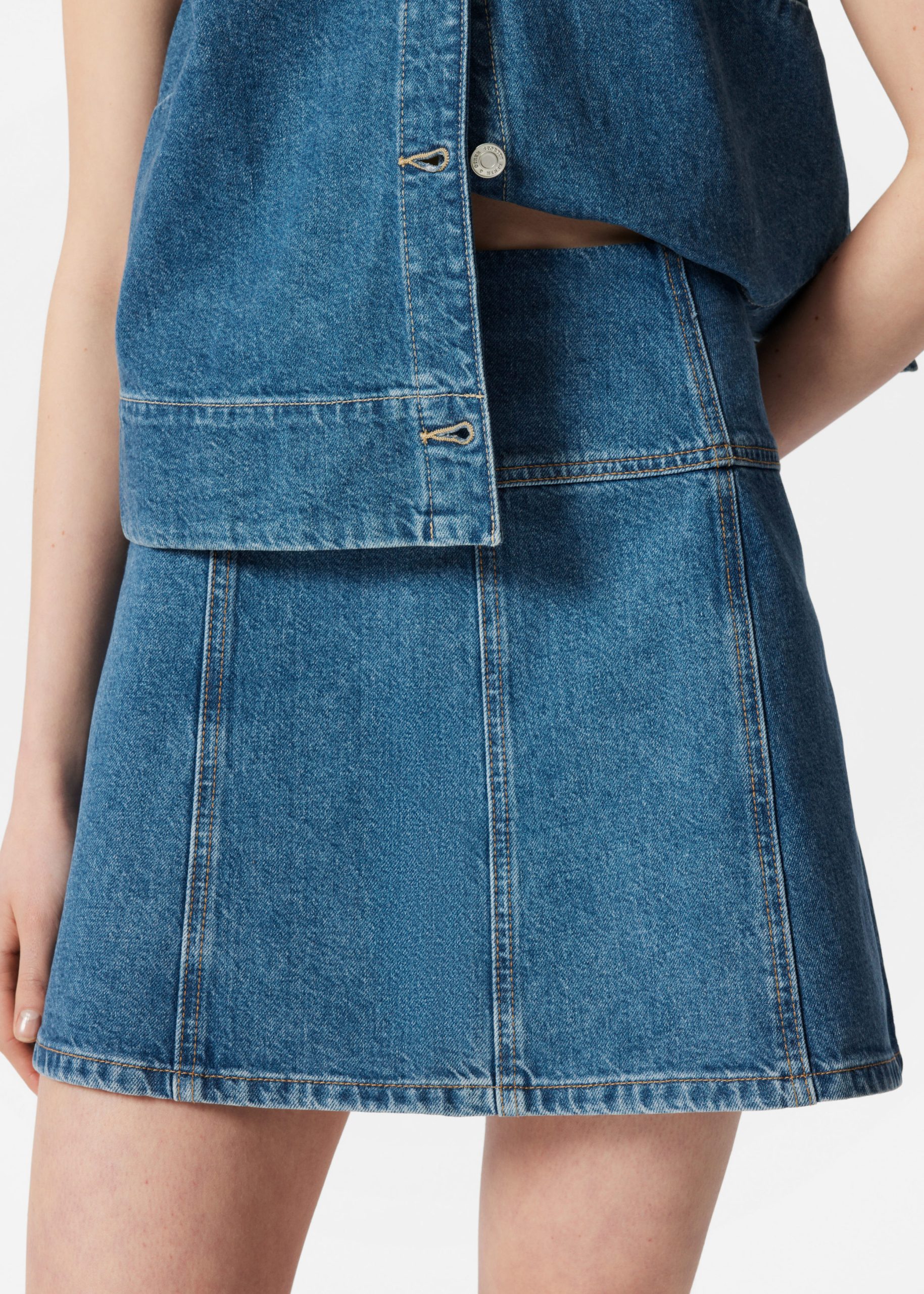High-waist mini skirt crafted from a sturdy denim fabric. Cut in an A-line silhouette with a light flare at the hem, featuring all-over topstitched seams. Finished with a concealed zipper and a hidden internal button.