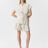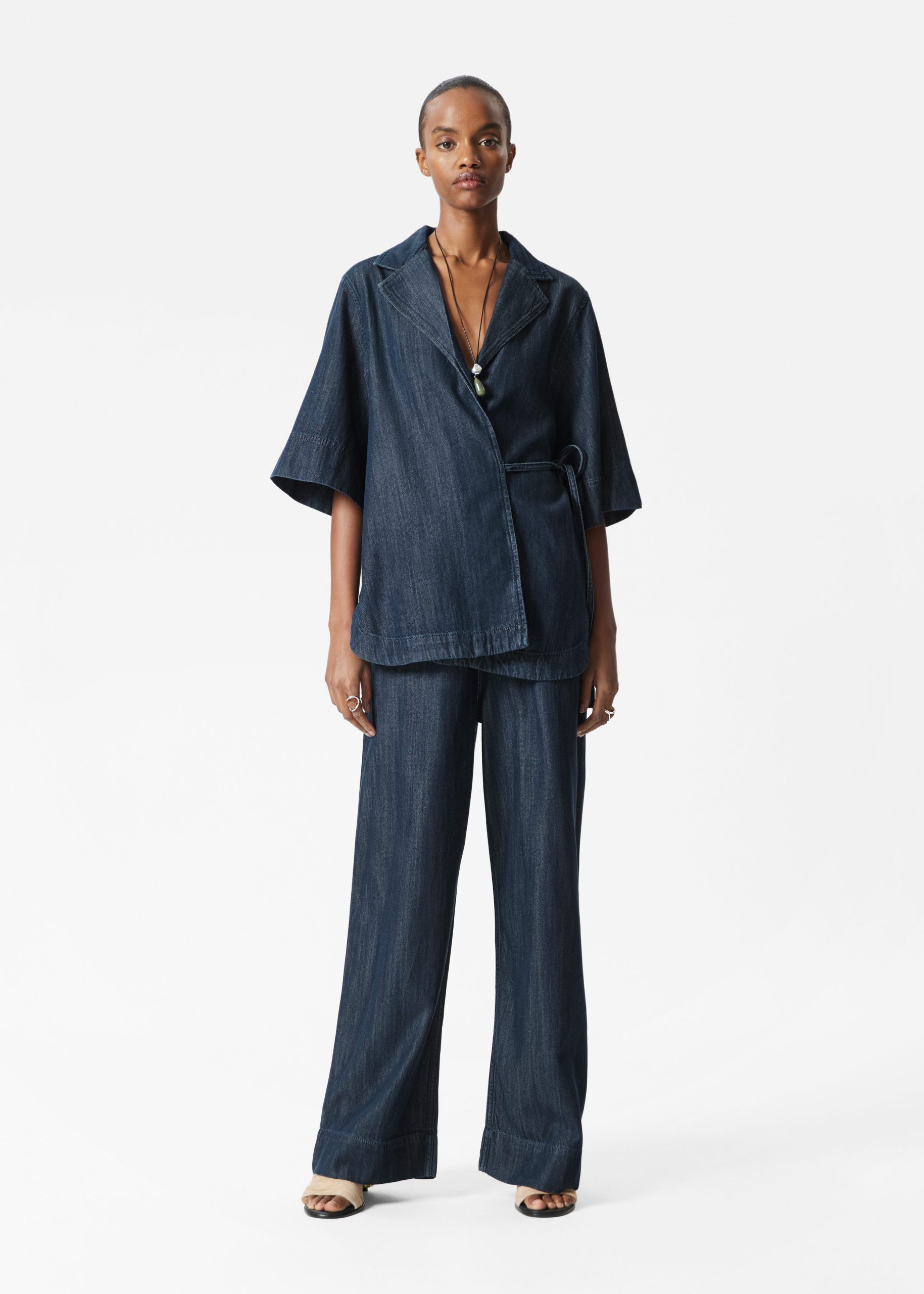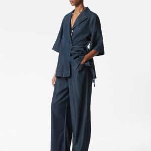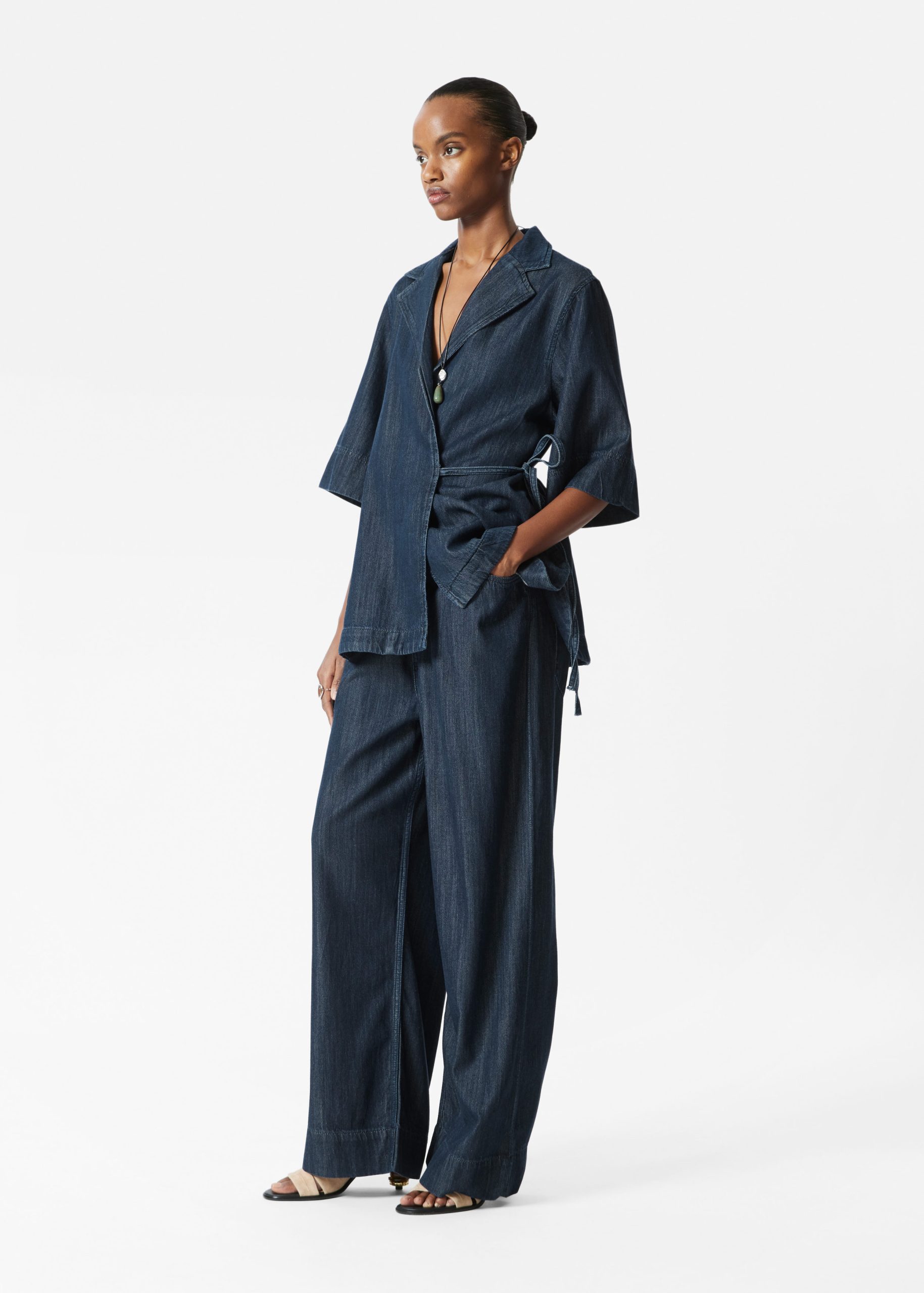 Denim shirt designed with a wrapped silhouette. Featuring a classic collar, three-quarter sleeves with wide cuffs, and a tie-detail at the waist.Â