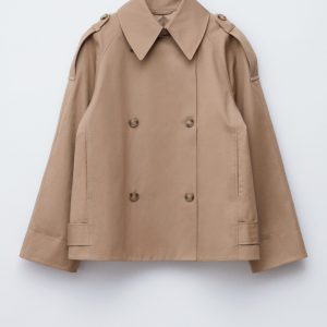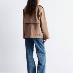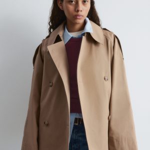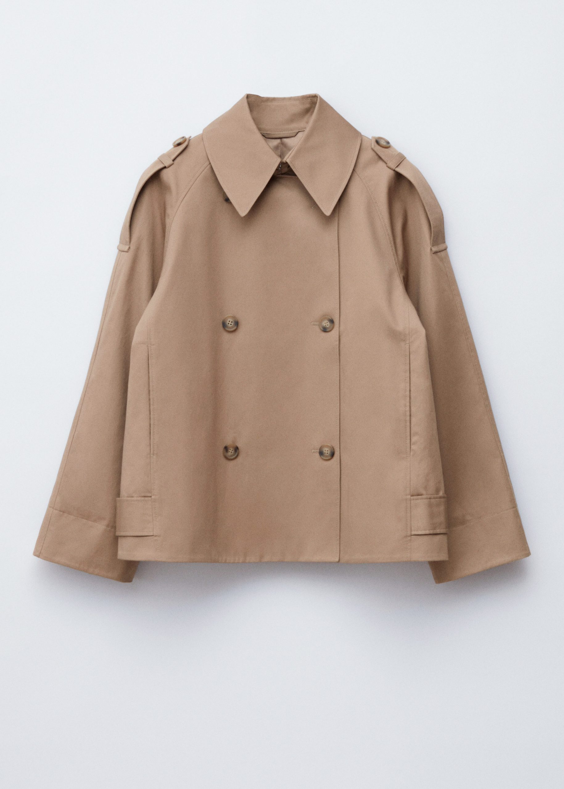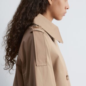 A modern take on the classic trench. This jacket is cut from structured cotton twill in a relaxed A-line shape. It features a double-breasted front, a pointed collar with hook-and-bar fastening, and ranglan sleeves with shoulder epaulettes. Finished with buttoned side tabs and a classic back yoke.