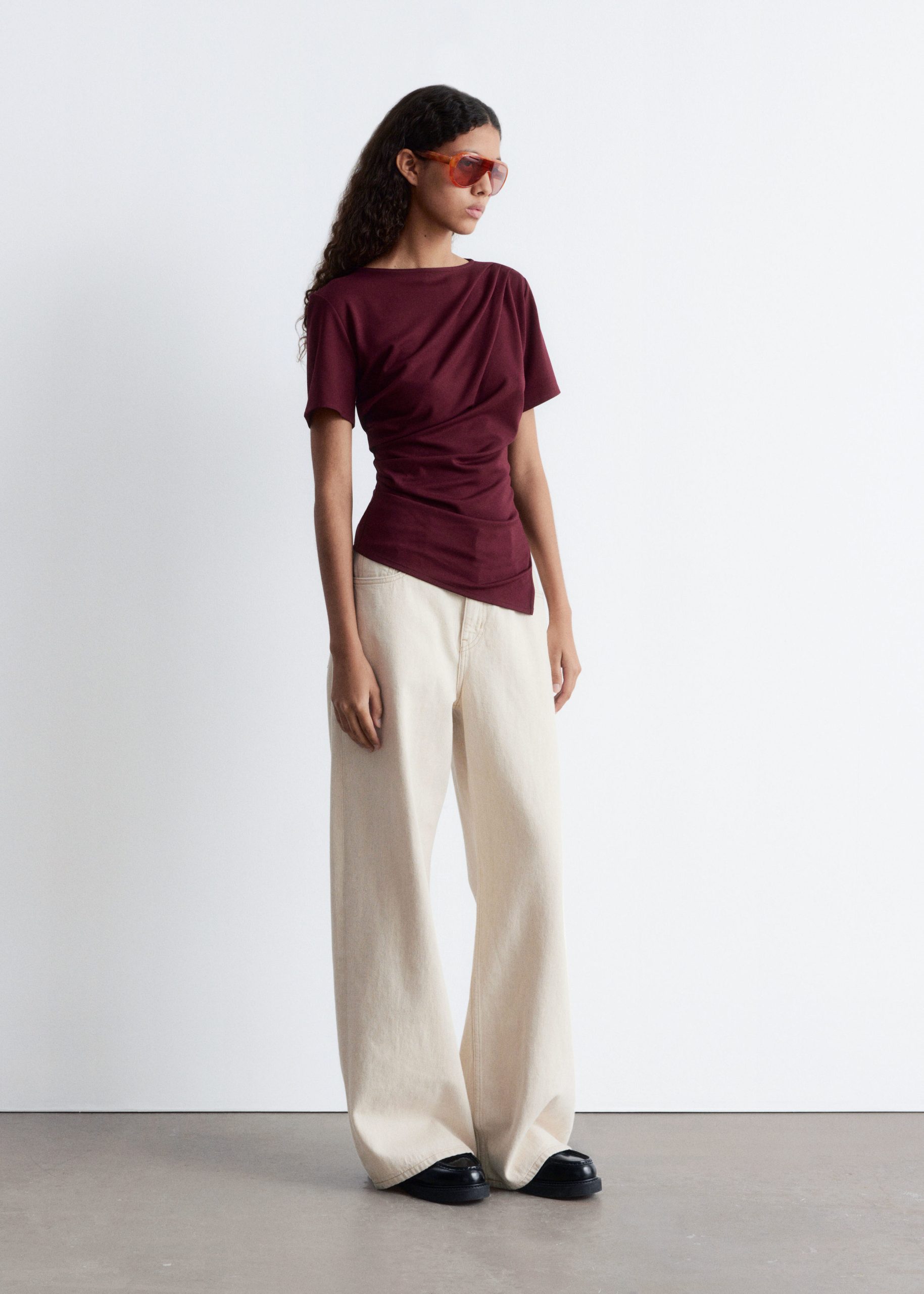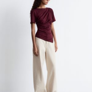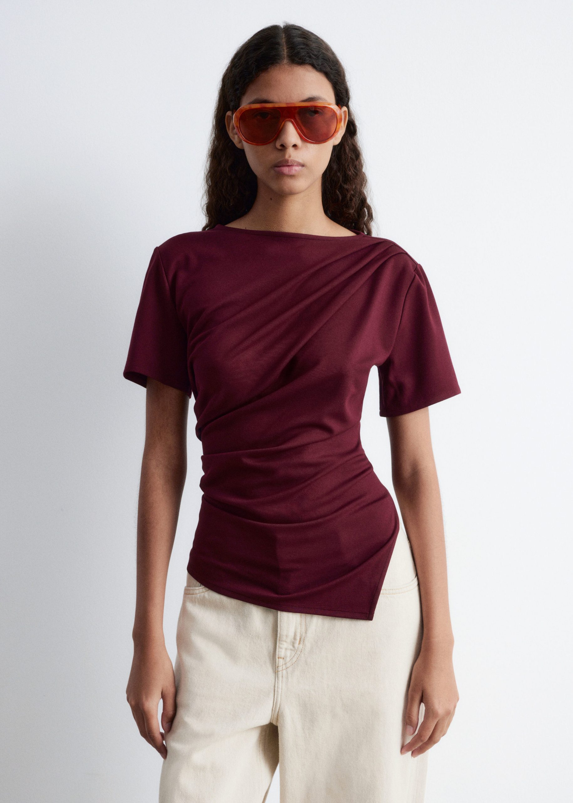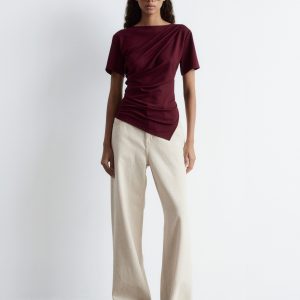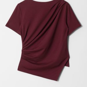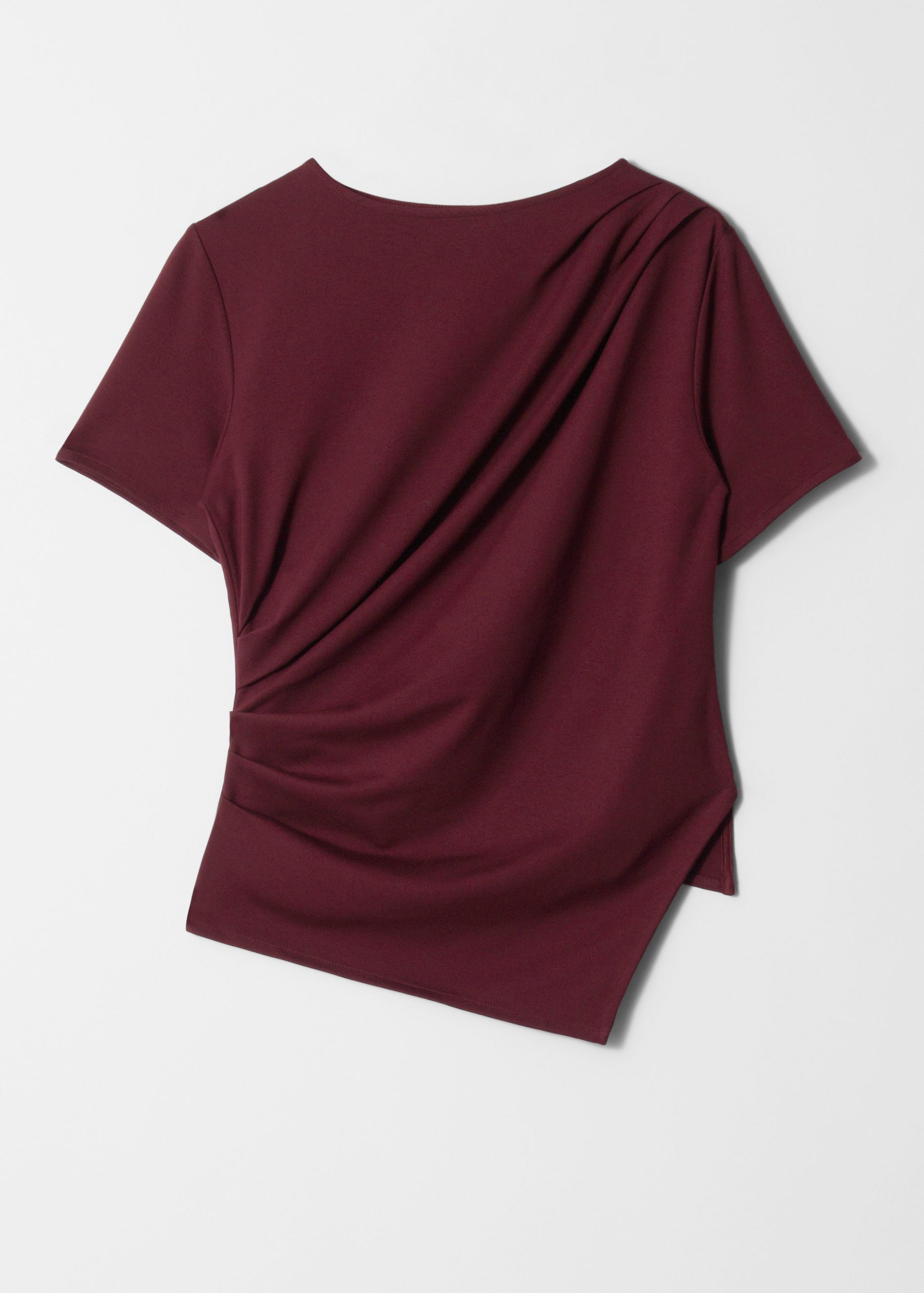 Draped t-shirt featuring a round neck, short sleeves, and an asymmetric hemline.