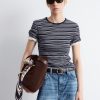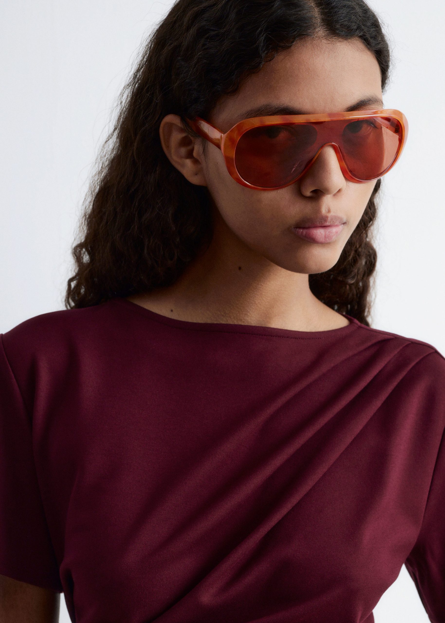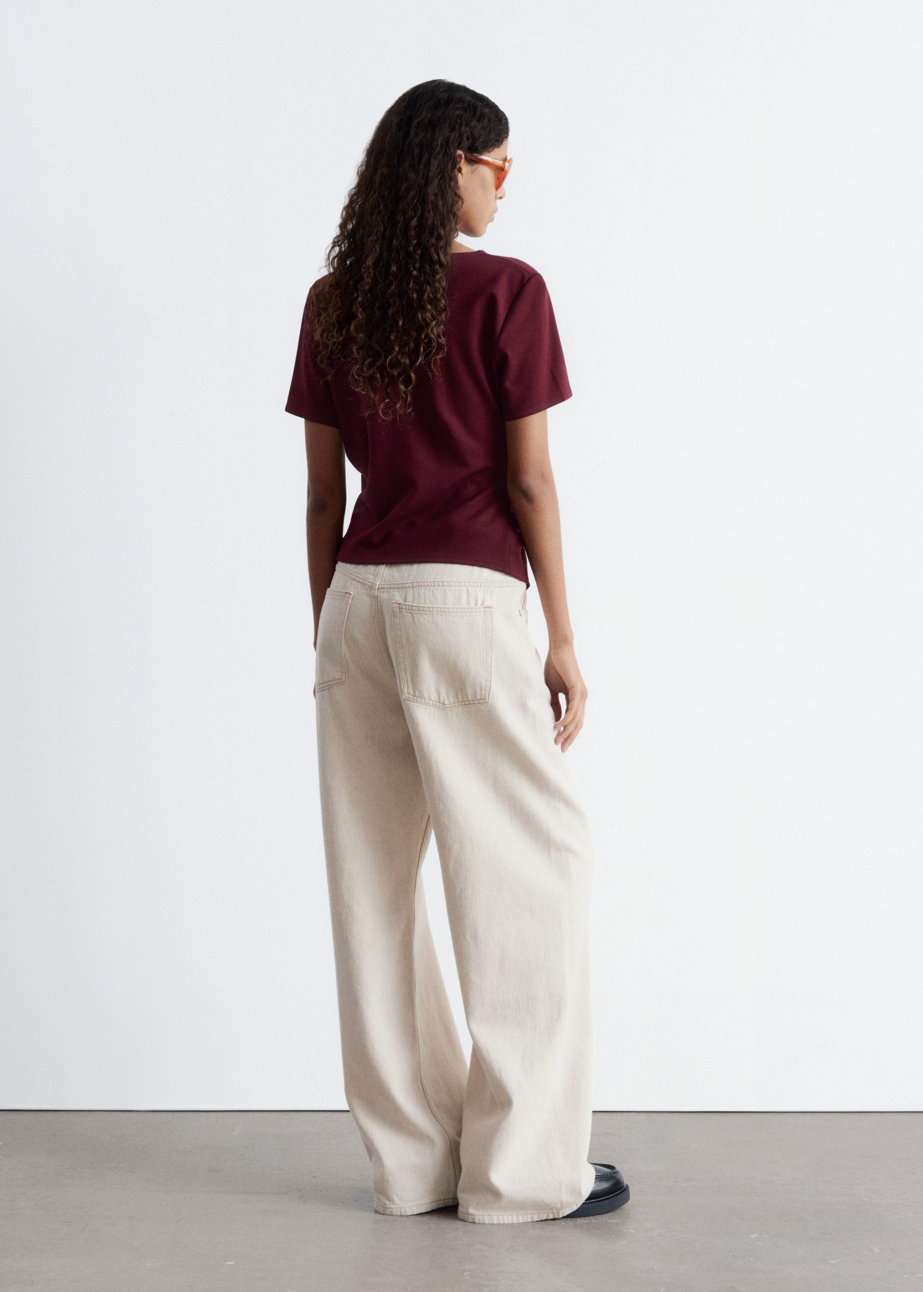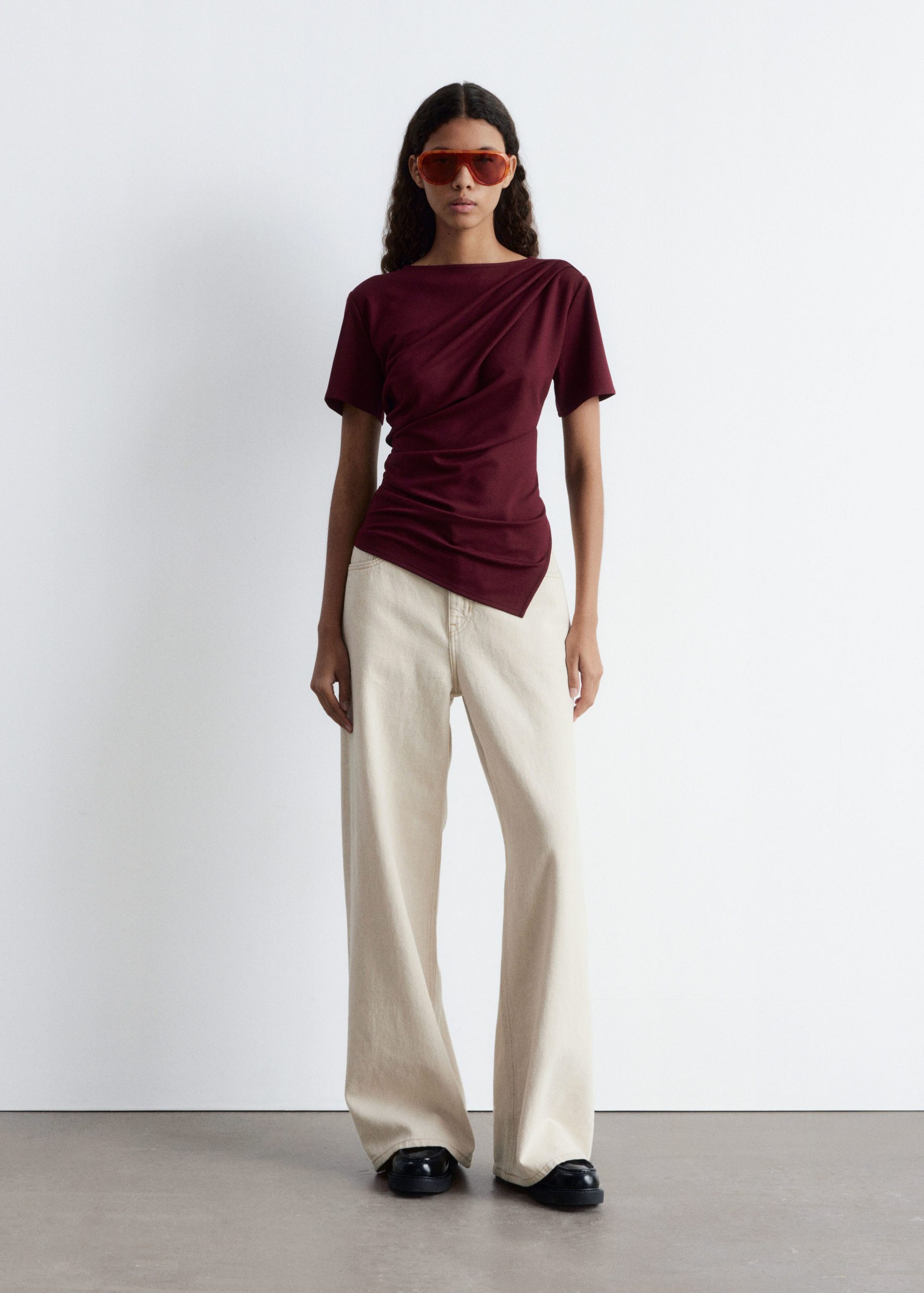 Draped t-shirt featuring a round neck, short sleeves, and an asymmetric hemline.