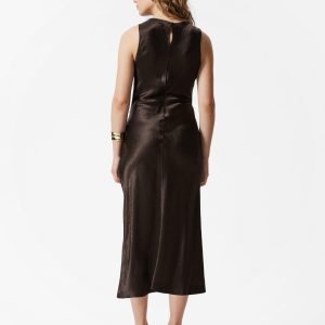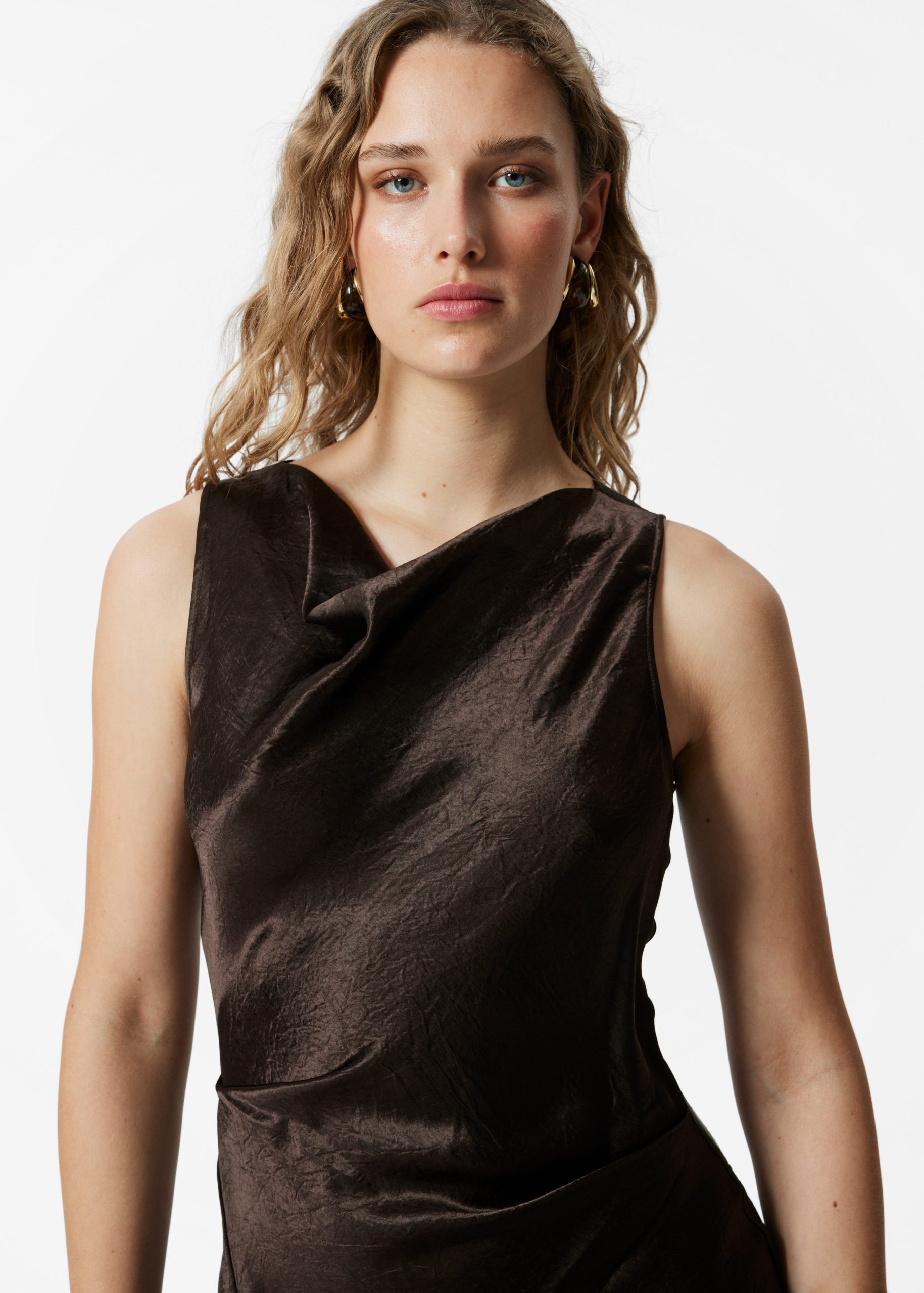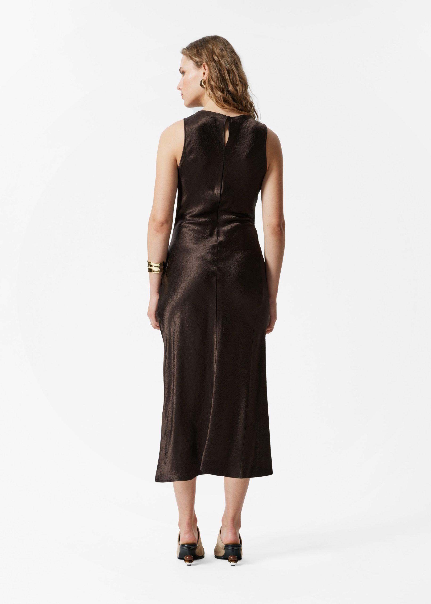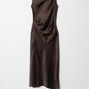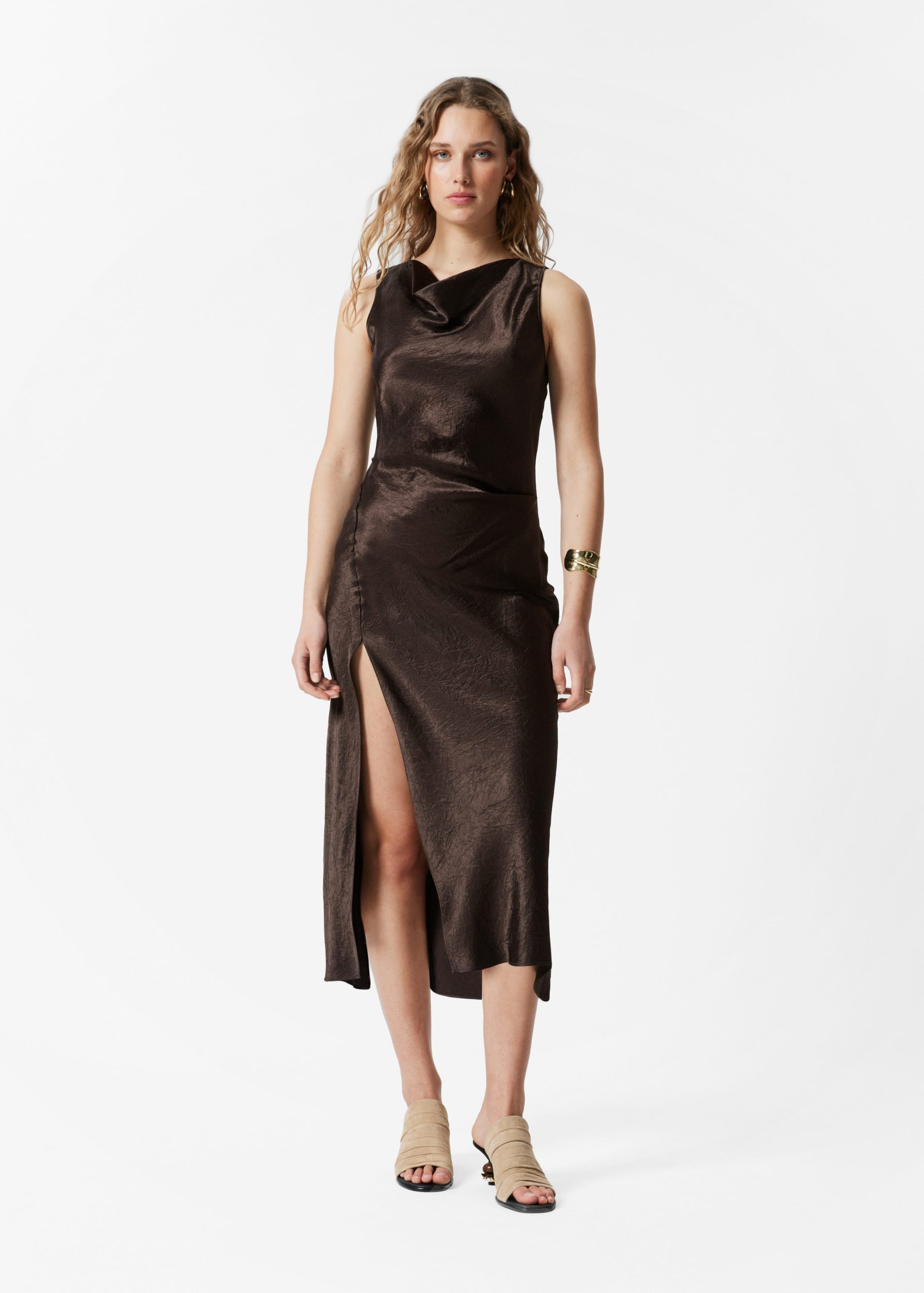 Sleeveless midi dress crafted from a silky satin fabric. Designed with a classic cowl neck, and a draped, figure-hugging silhouette featuring an asymmetric hemline with a decorative front slit. Finished with a keyhole button closure at the back.