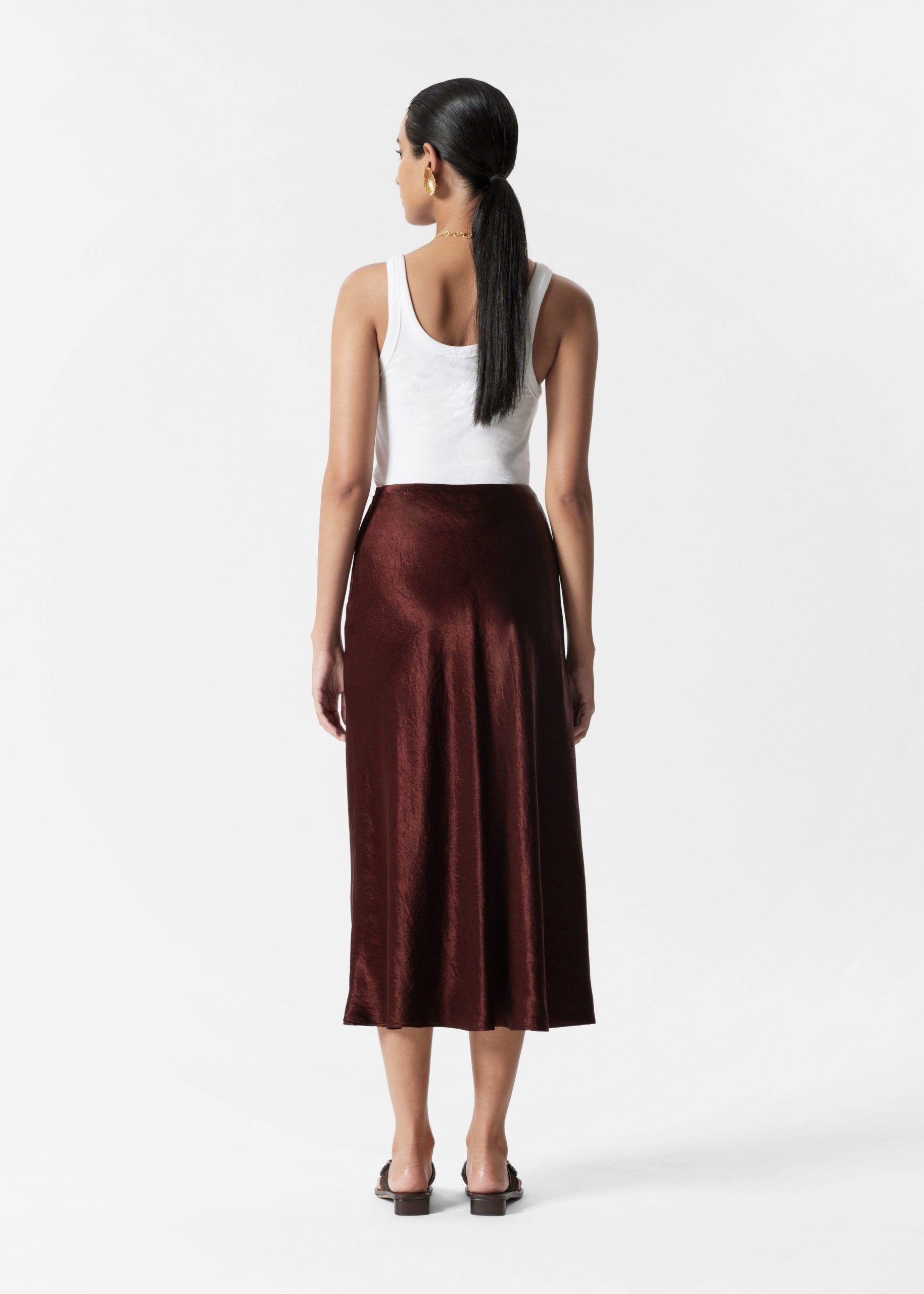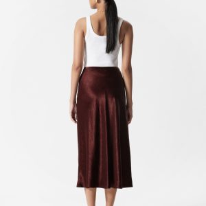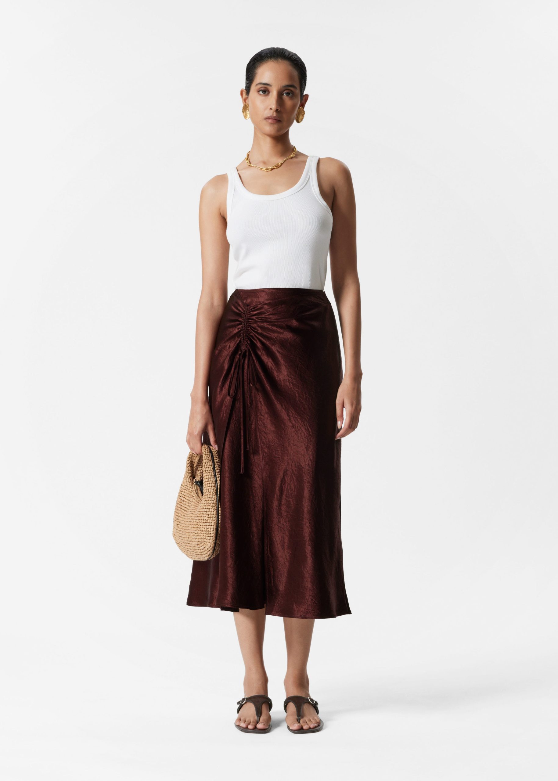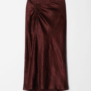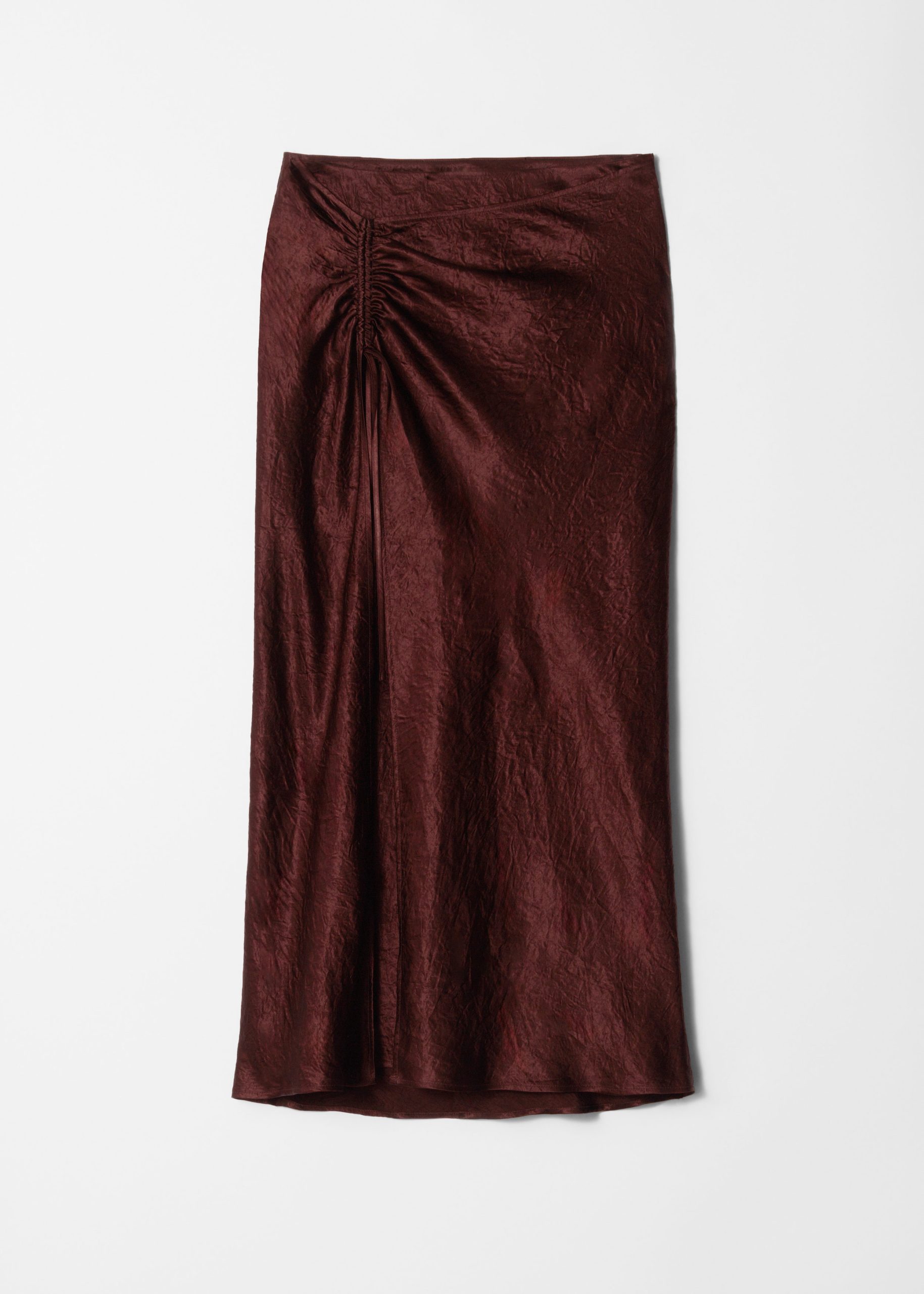 This slip skirt is crafted from a lustrous satin fabric with a crinkled texture for a modern, tactile finish. Cut in a fluid silhouette, it features a high waist with a wrapover design that transitions into a subtle front slit. Accented by an adjustable drawstring detail, creating soft ruching that lend movement and dimension. Finished with a concealed side seam zipper.