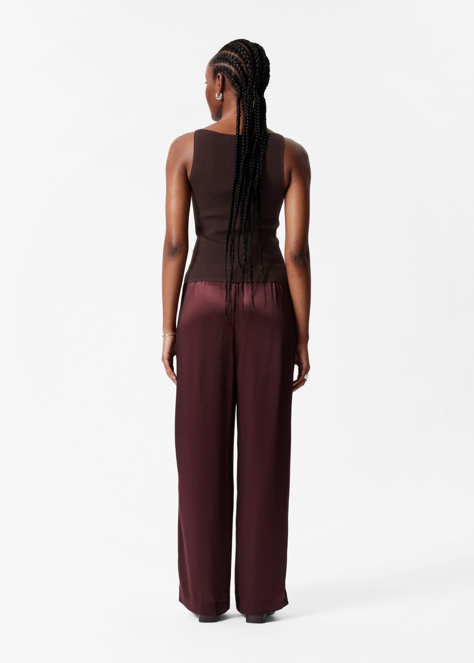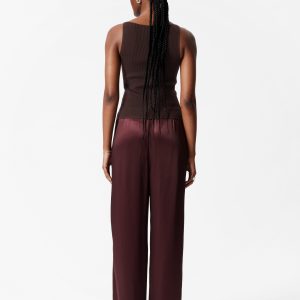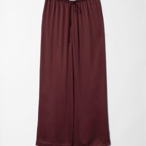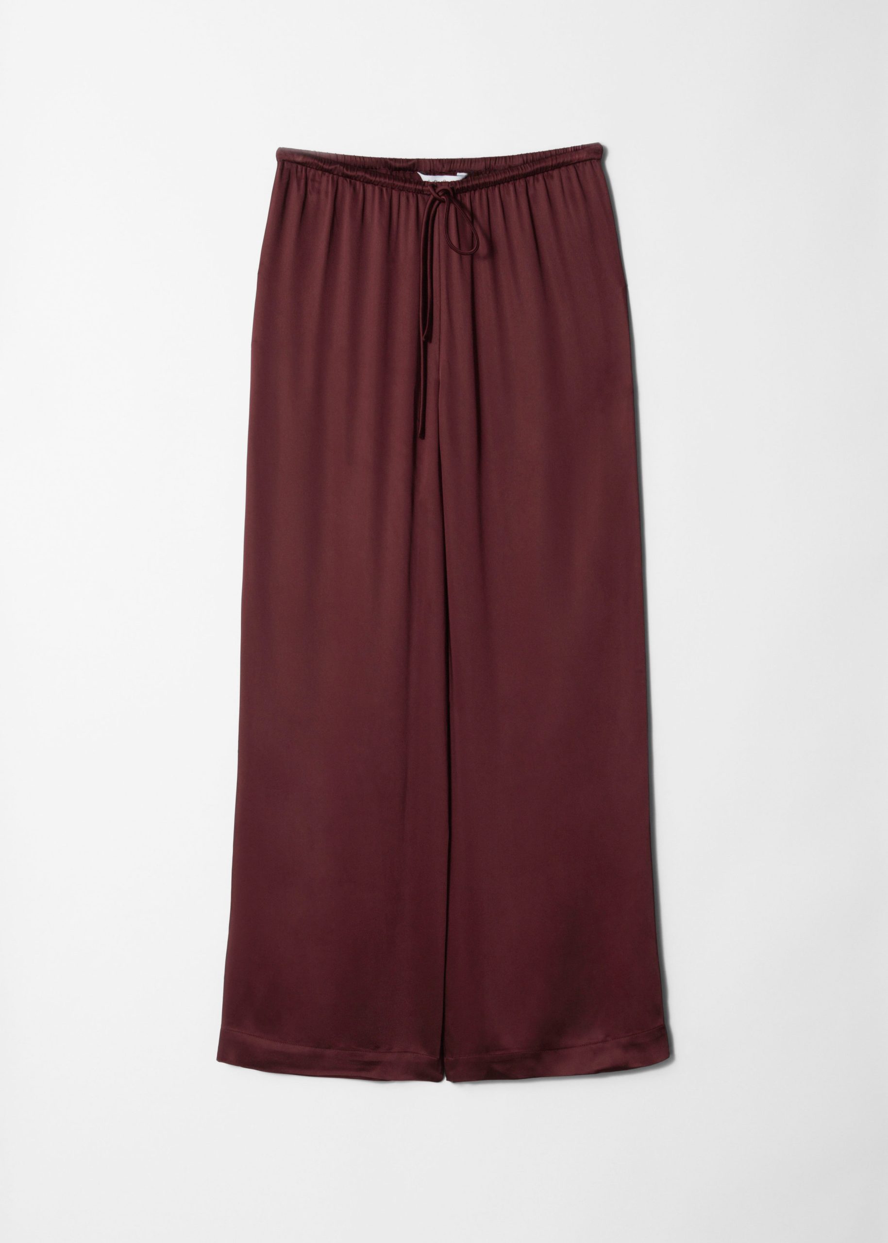 Satin trousers designed in an elevated pyjama-like style. Featuring long, straight legs, and an elastic drawstring waist for a comfortable pull-on effect.