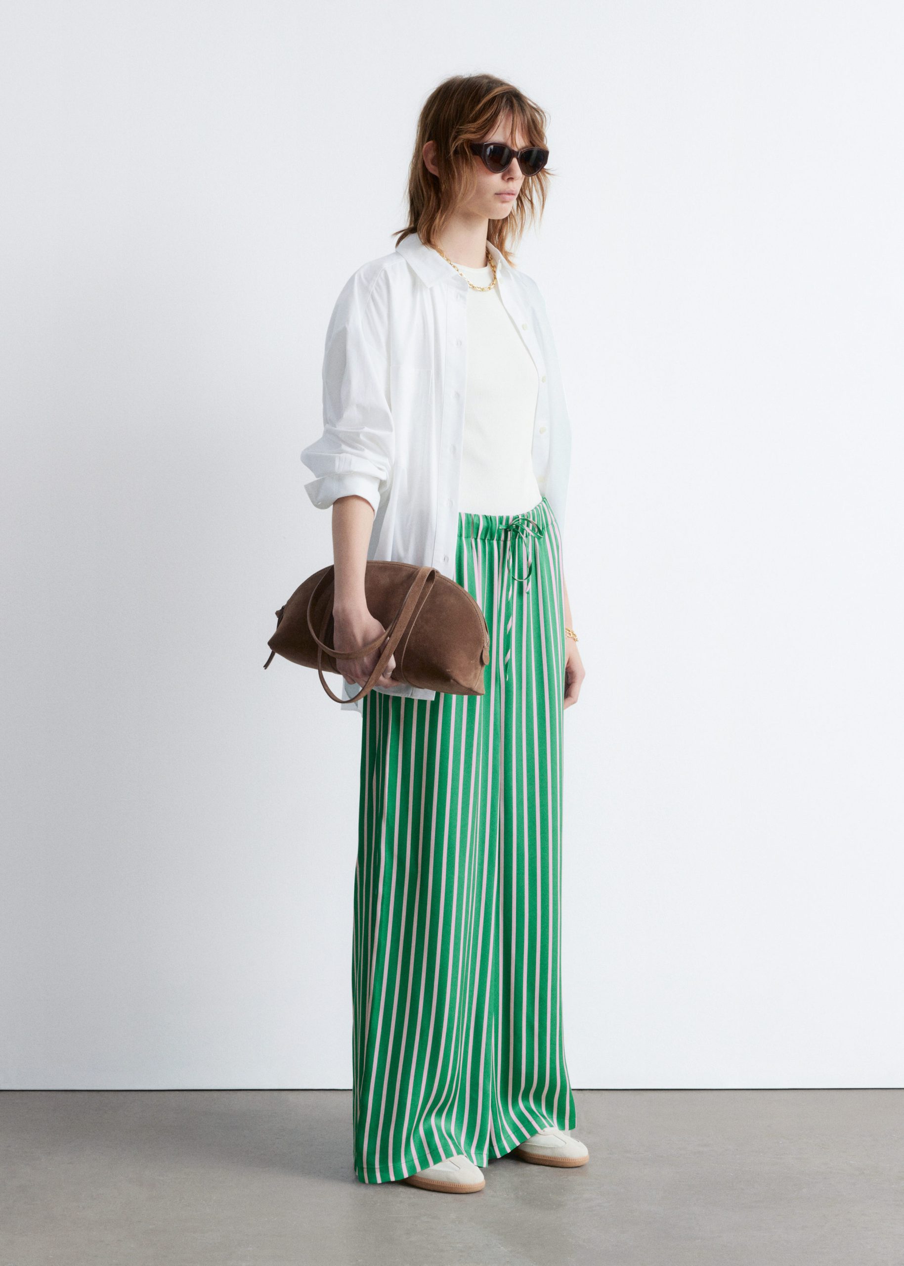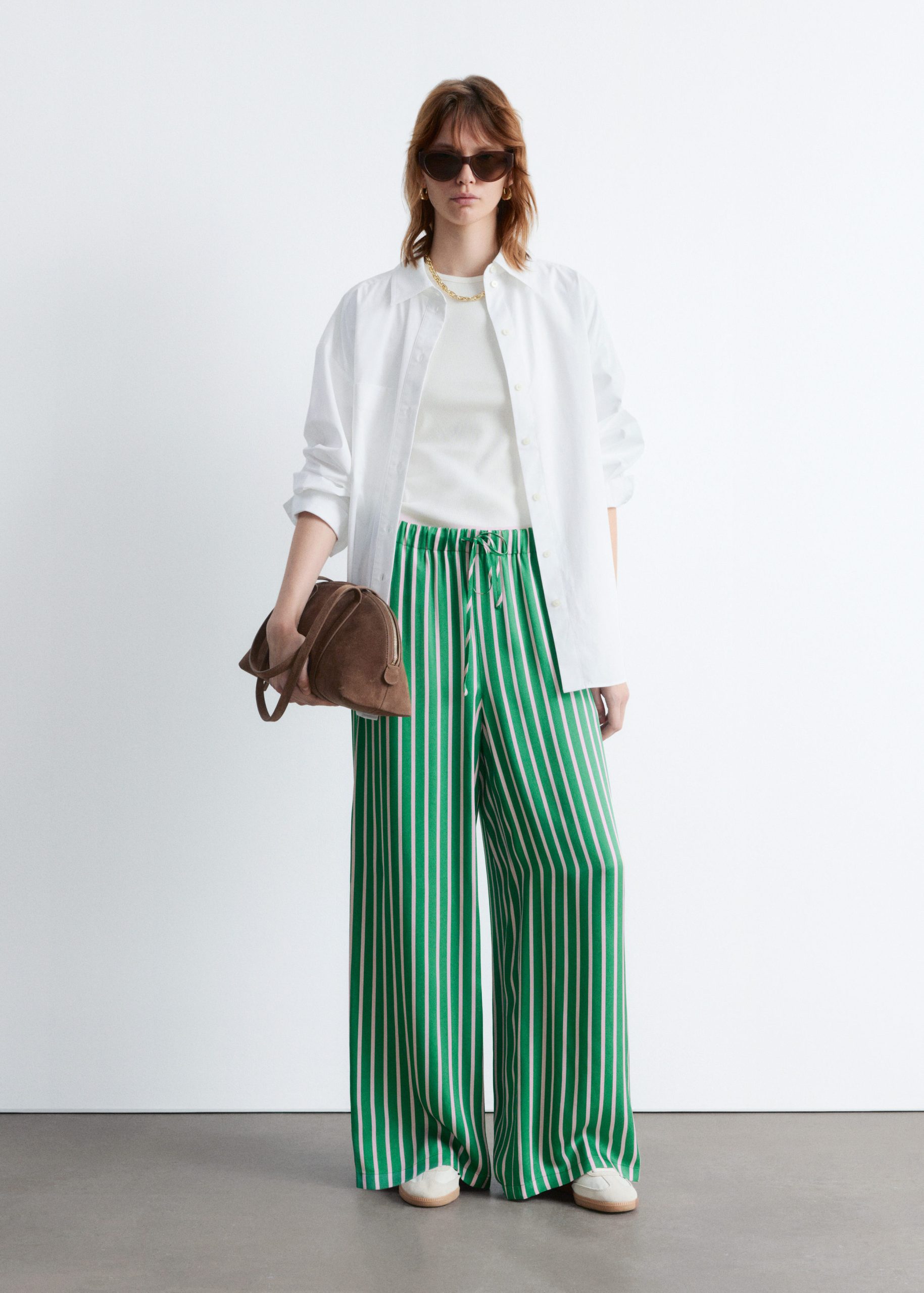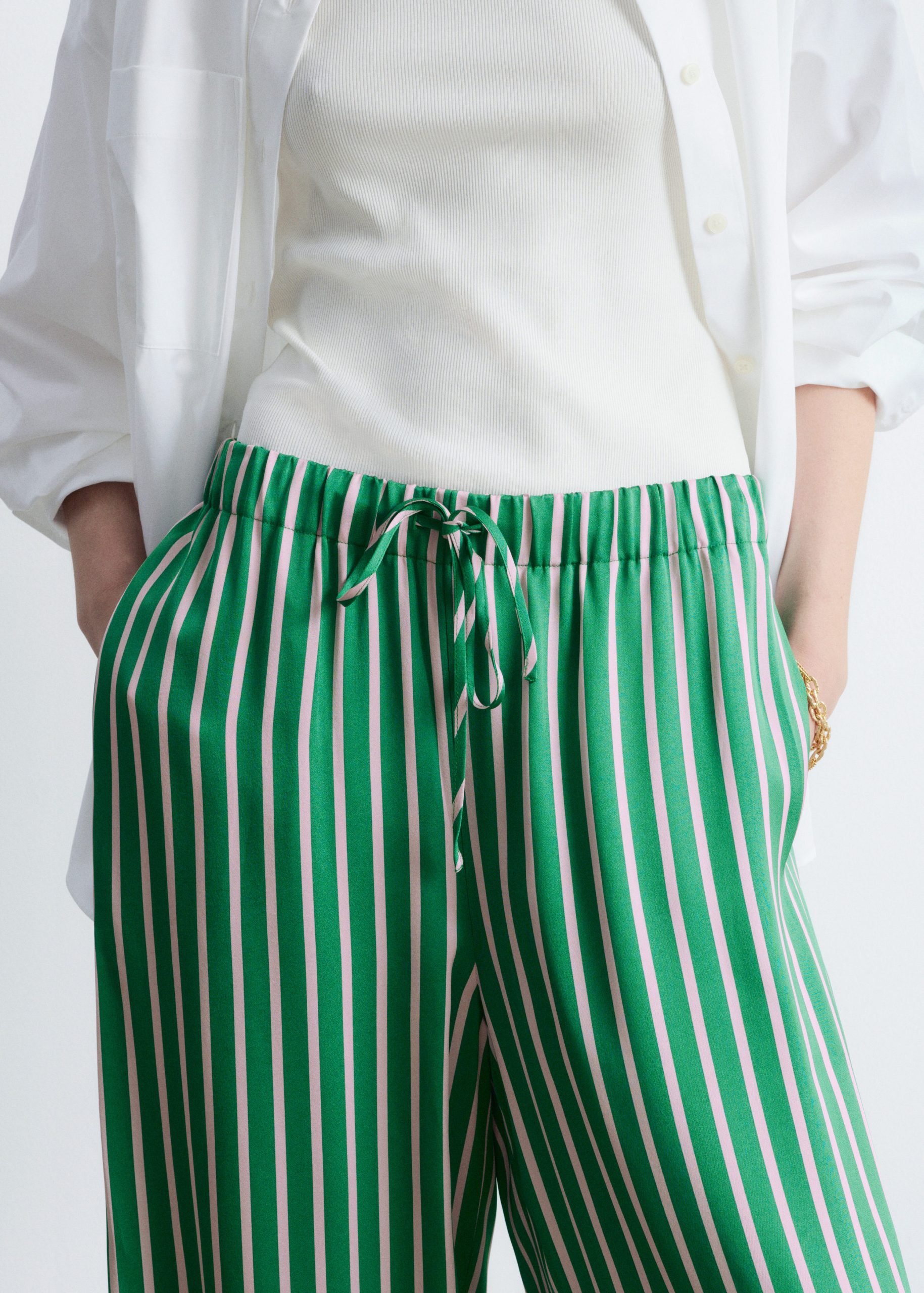 These trousers are crafted from a lightweight satin fabric offering a soft-to-skin feel. Designed in a loose silhouette, they feature an elastic drawstring waist with thin, adjustable tie-bands for a comfortable pull-on fit. Finished with subtle side seam pockets.Â