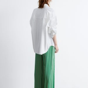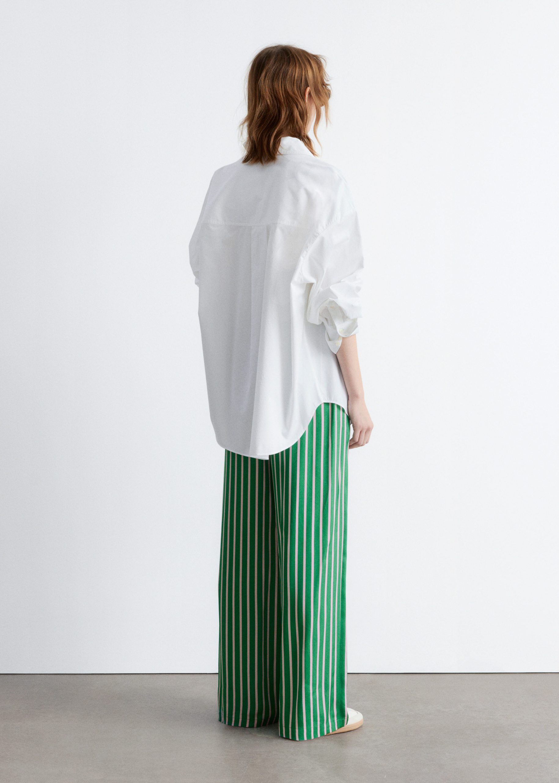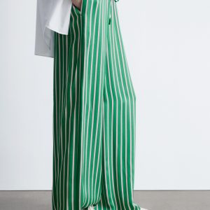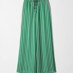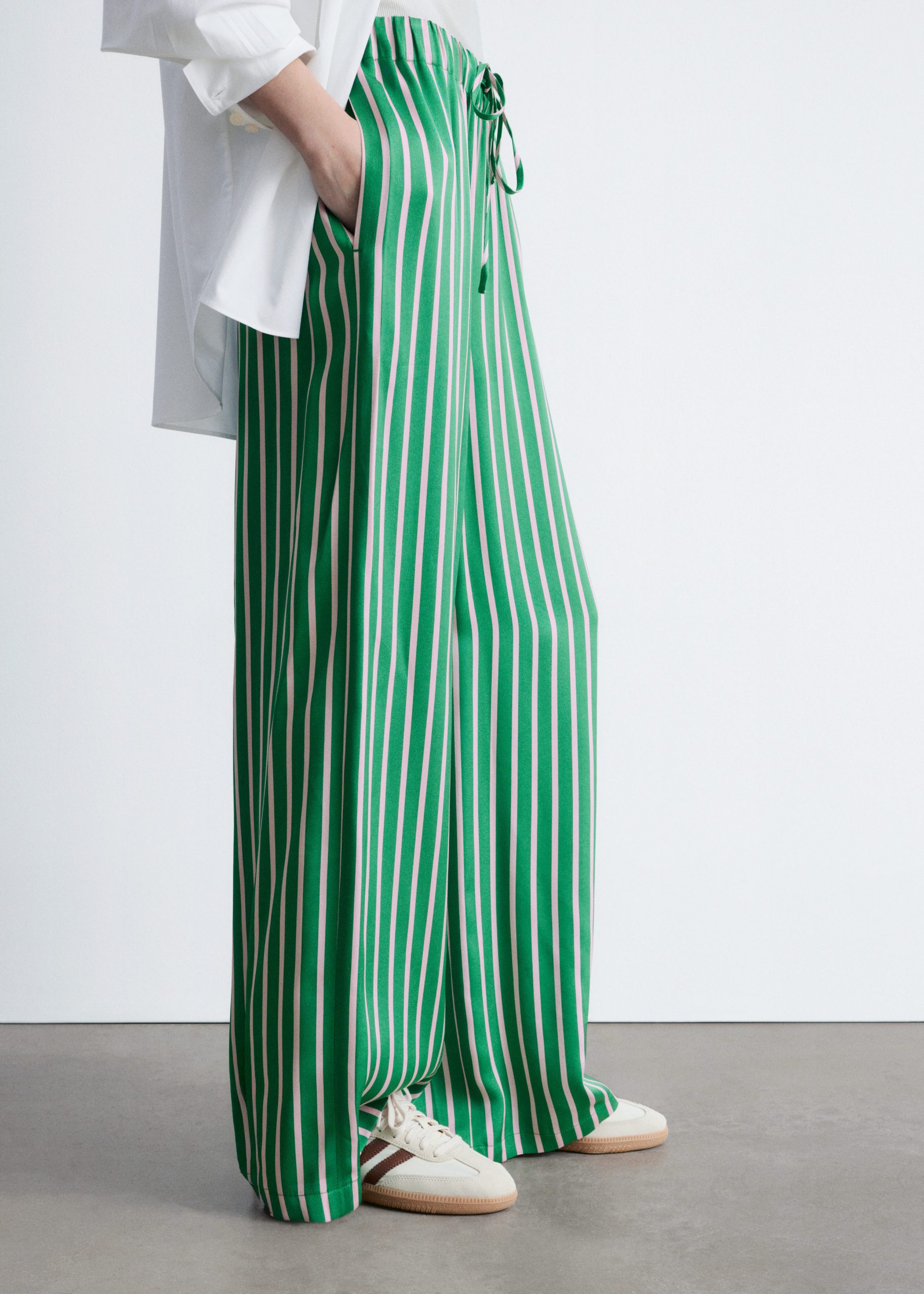 These trousers are crafted from a lightweight satin fabric offering a soft-to-skin feel. Designed in a loose silhouette, they feature an elastic drawstring waist with thin, adjustable tie-bands for a comfortable pull-on fit. Finished with subtle side seam pockets.Â