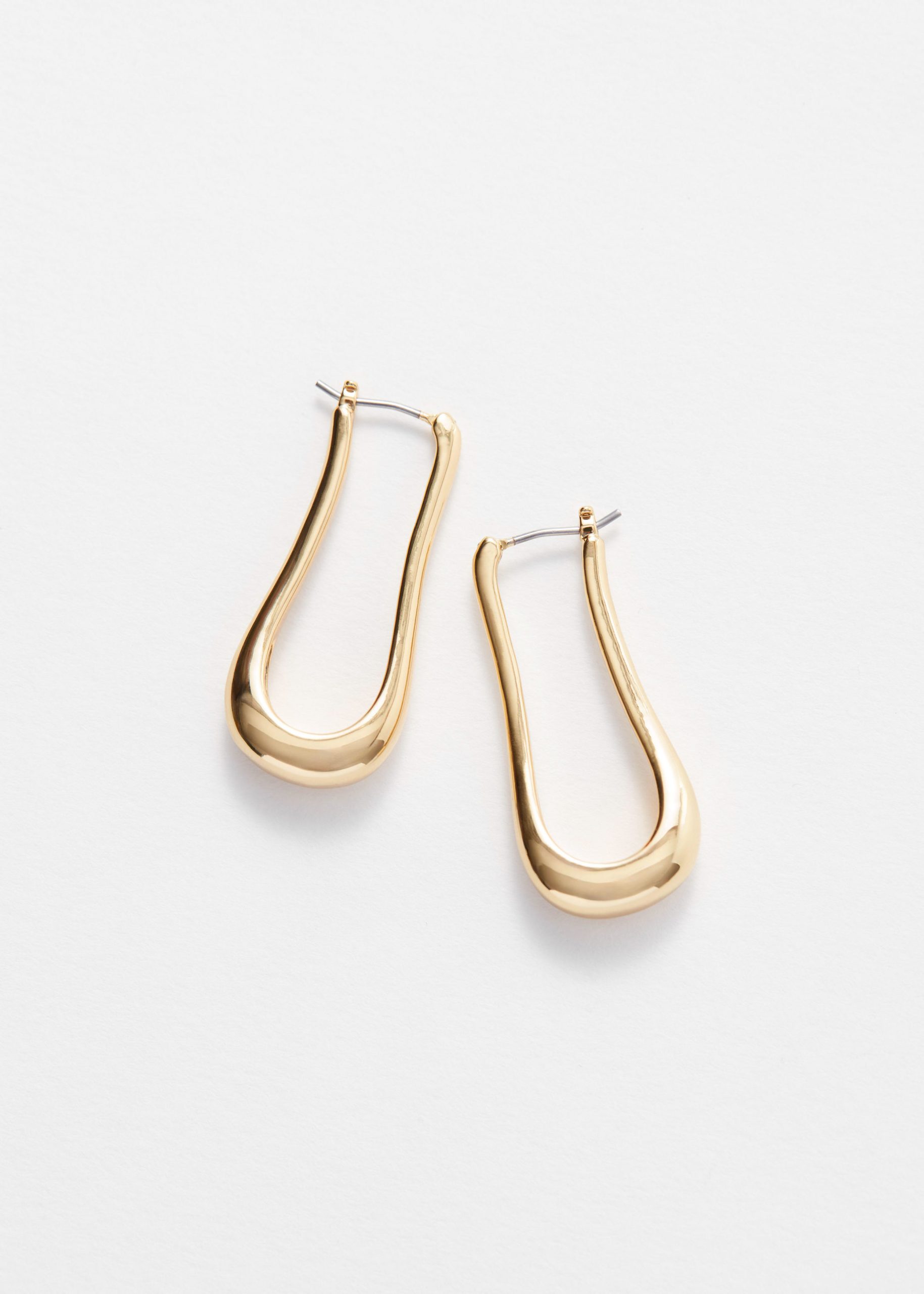Crafted from polished brass, these bell hoop earrings feature an elongated design that gradually widens towards the bottom, creating a bold and unique silhouette.