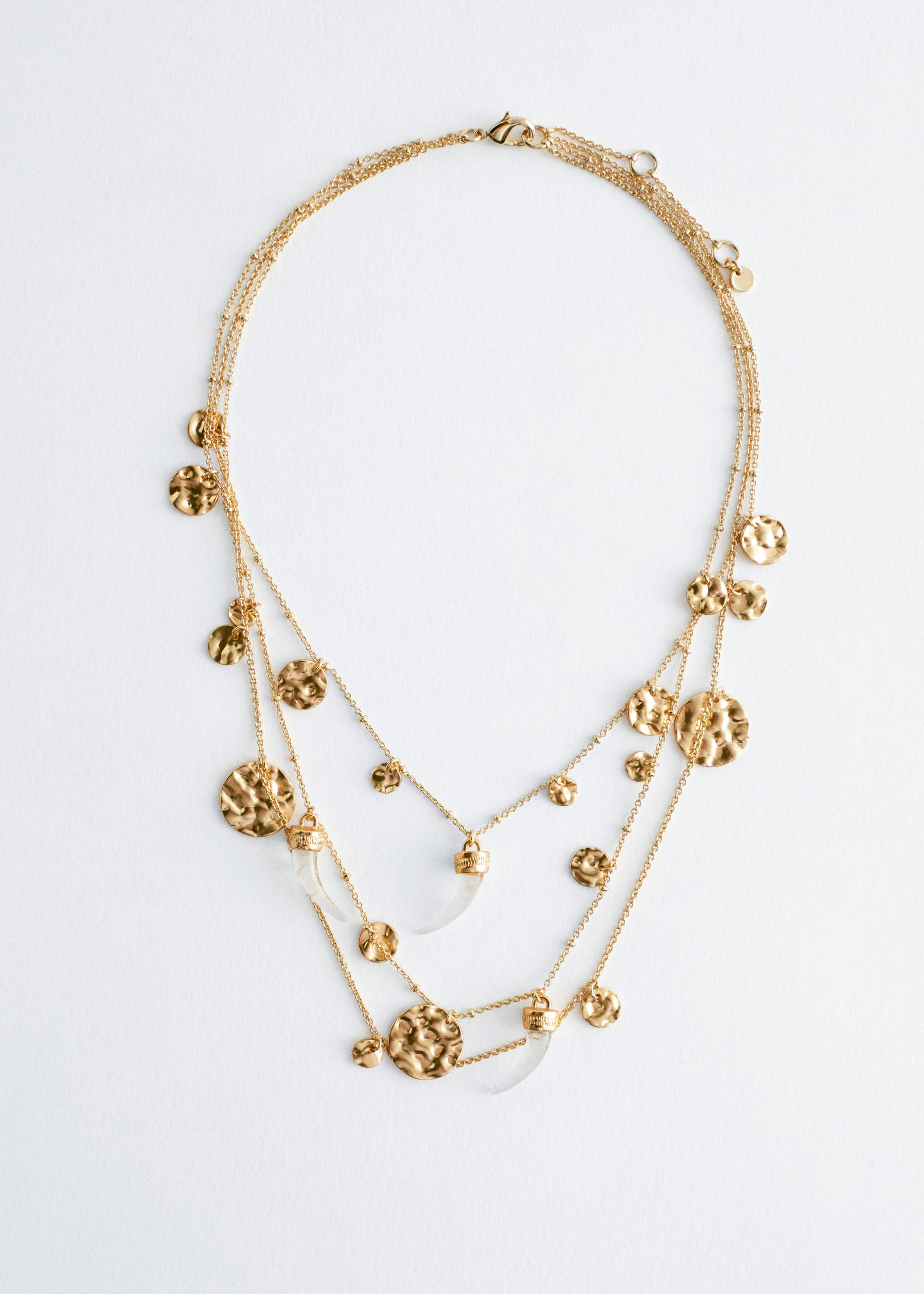 This layered necklace features three delicate strands, each adorned with various embellishments—mini donut beads, hammered plate charms, and shark tooth-shaped charms. Finished with an adjustable length and a trigger clasp.