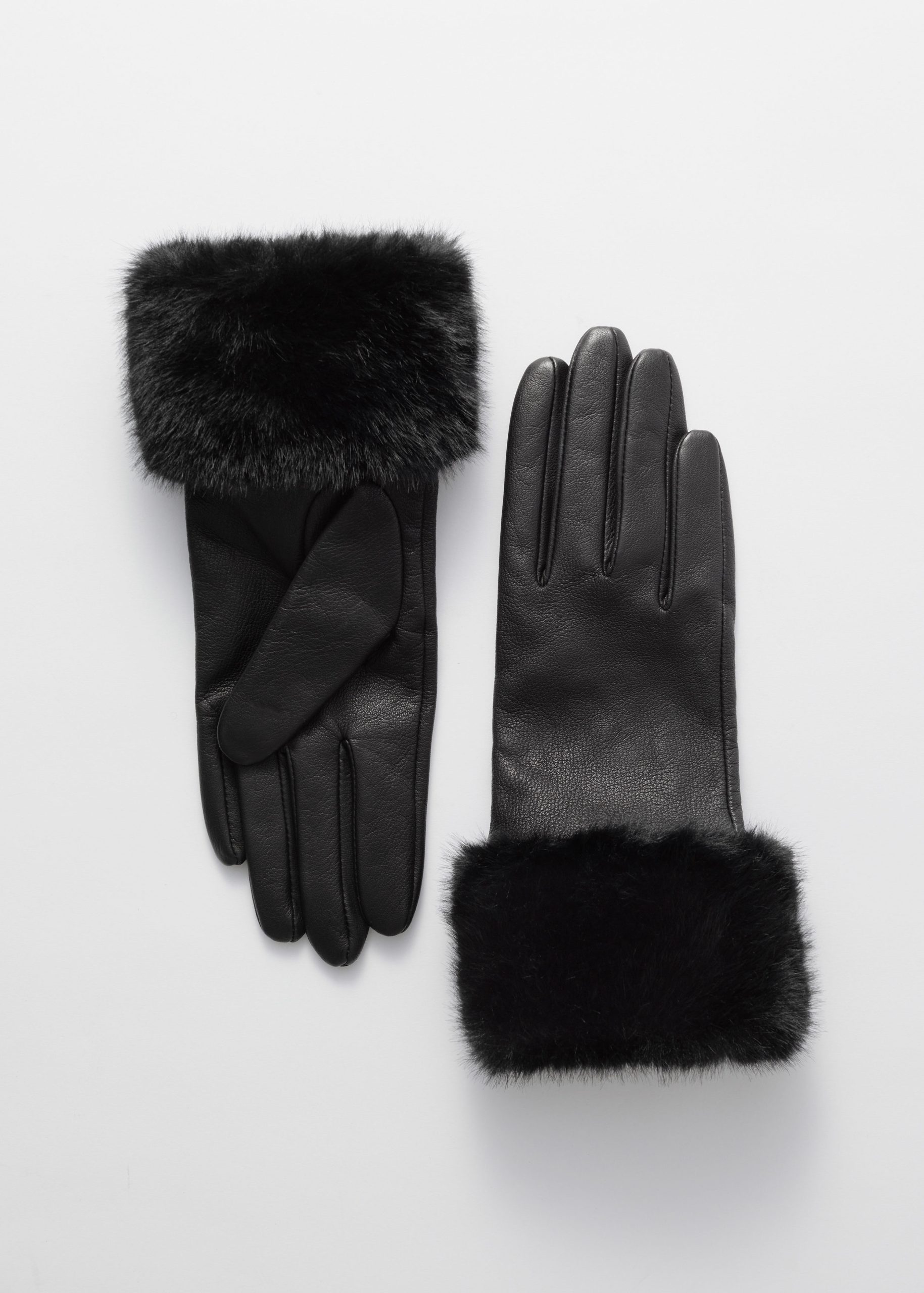 These gloves are a chic way to keep warm. They’re crafted from sleek black leather and trimmed with fluffy faux fur cuffs.