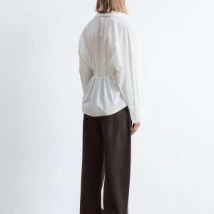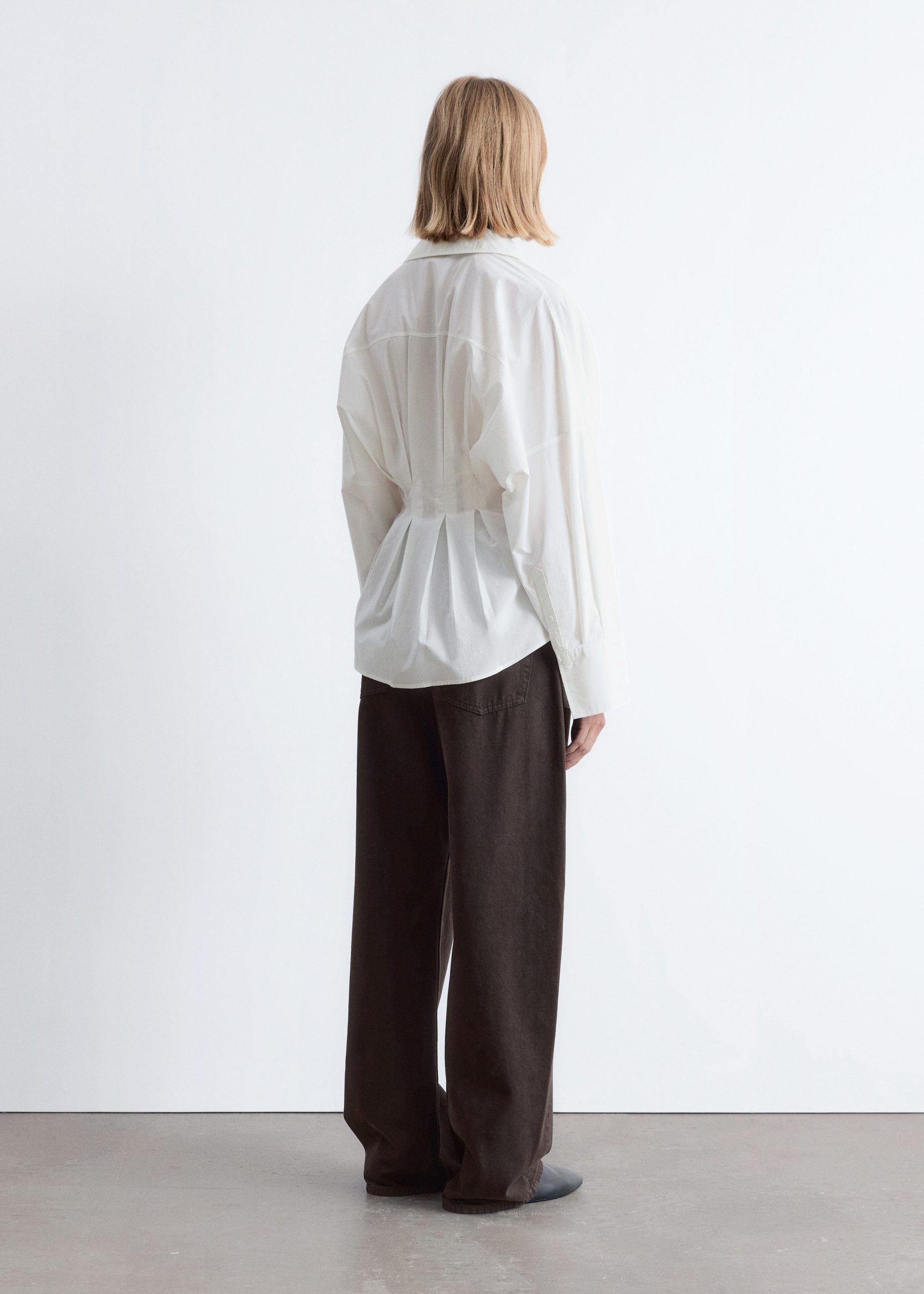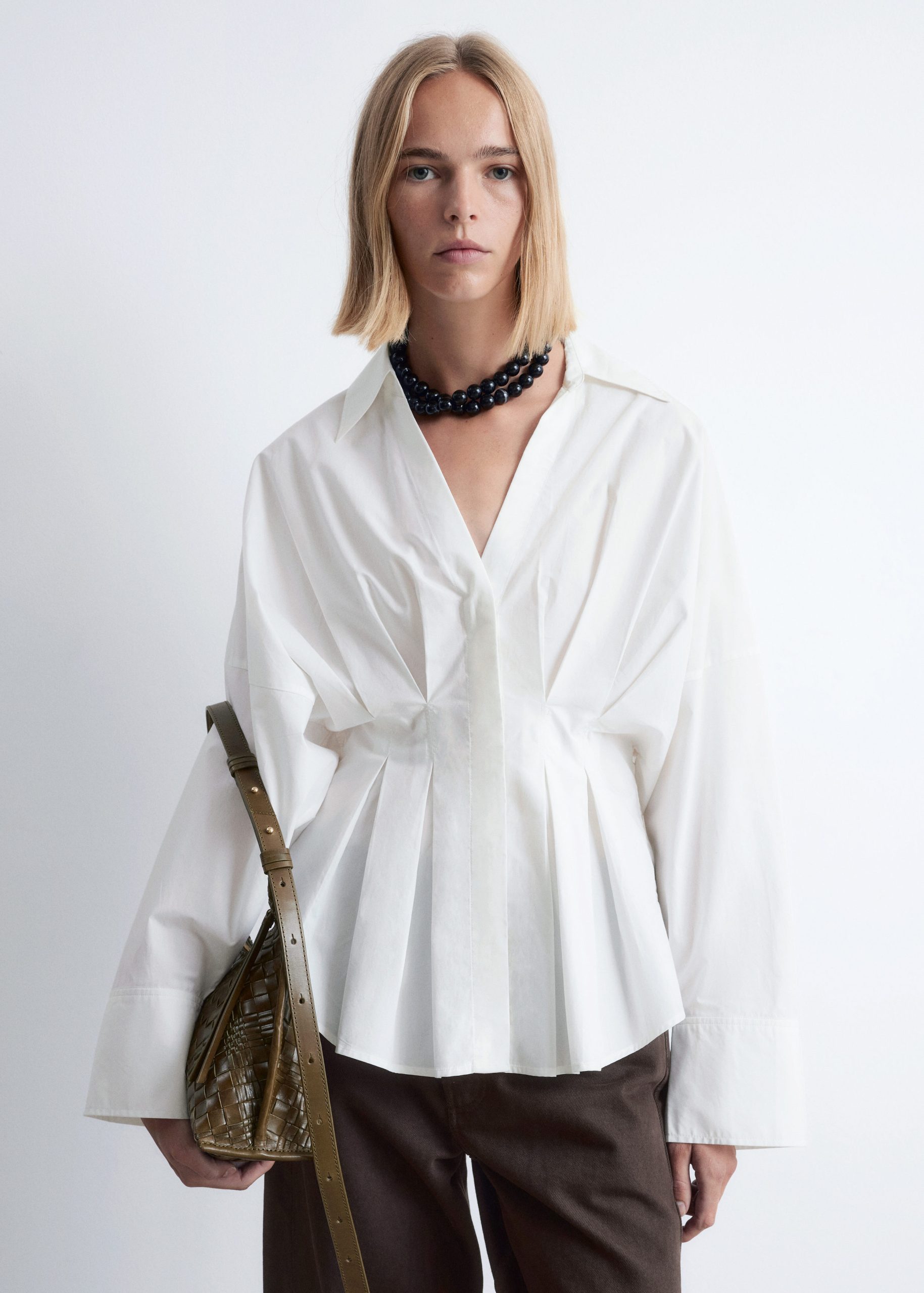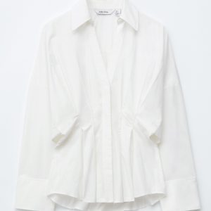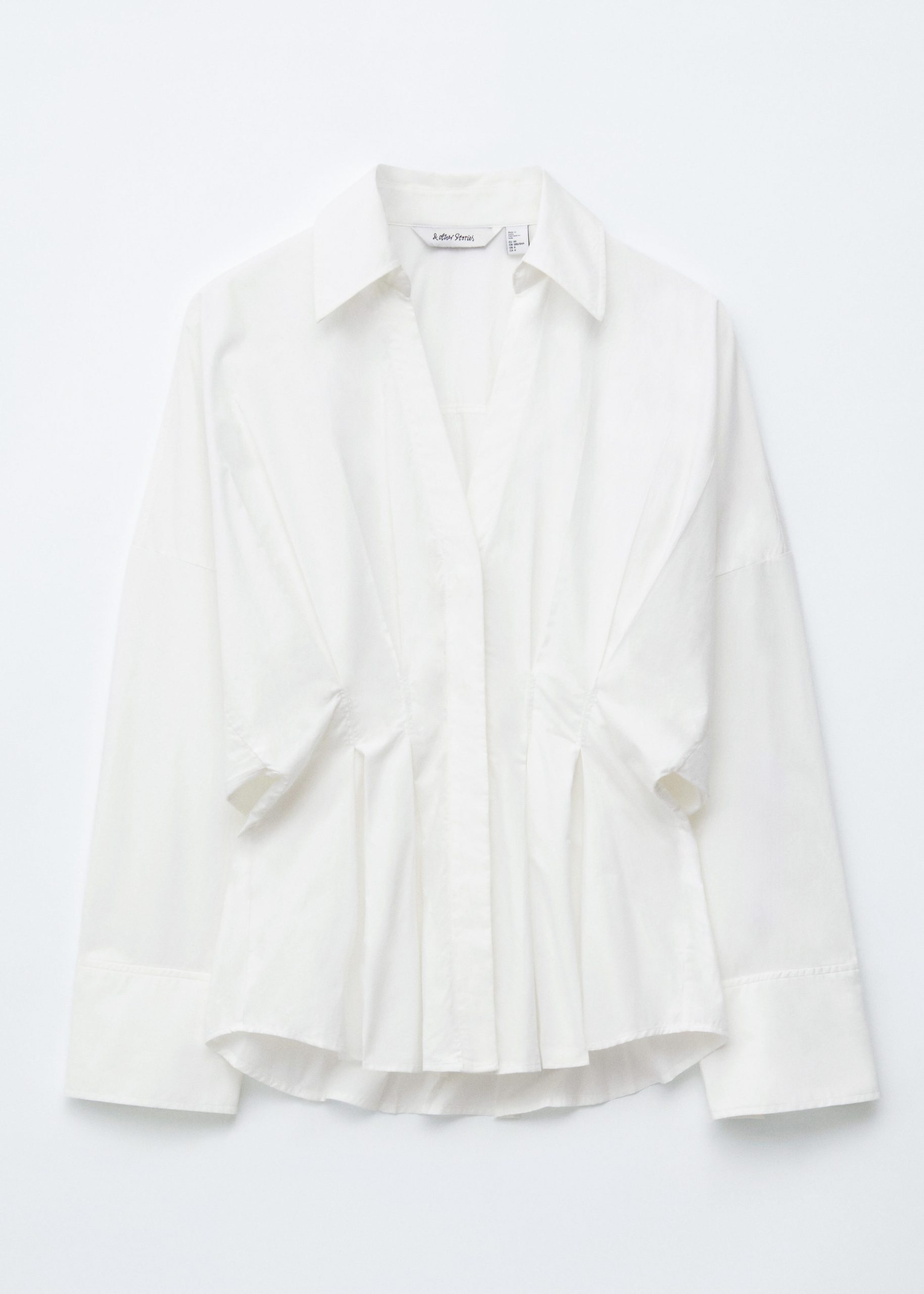 This shirt is made from 100% pure cotton and has a crisp, lightweight feel. Designed in a sculptural silhouette, featuring a fitted waist with pleat details and long, voluminous sleeves with buttoned cuffs. Finished with an open collar and a hidden placket with concealed buttons.