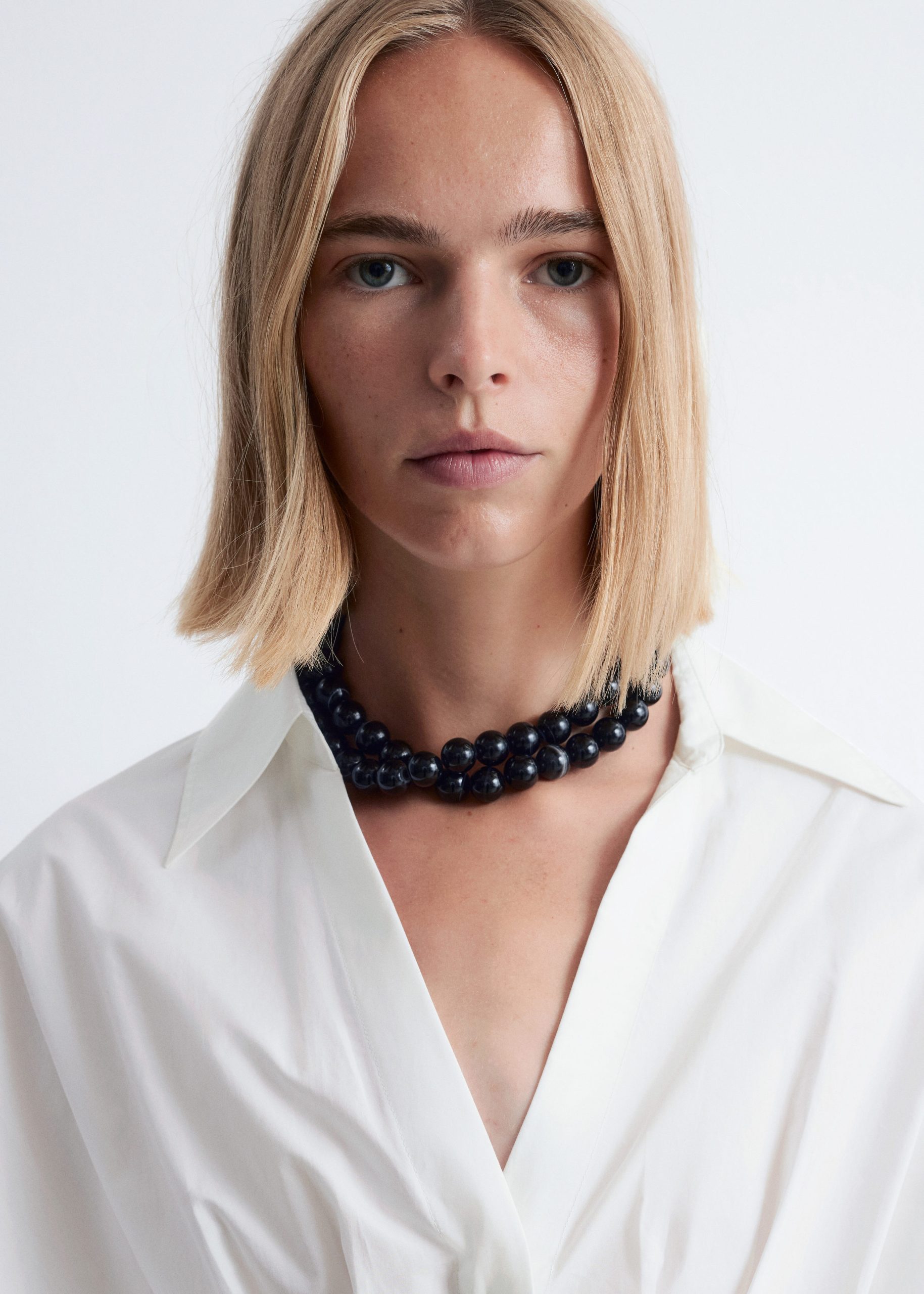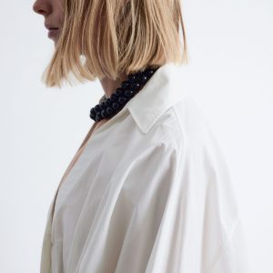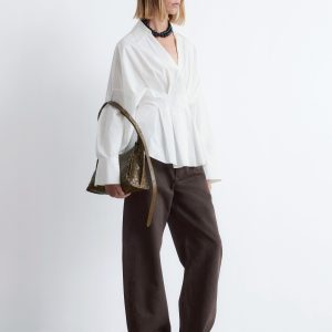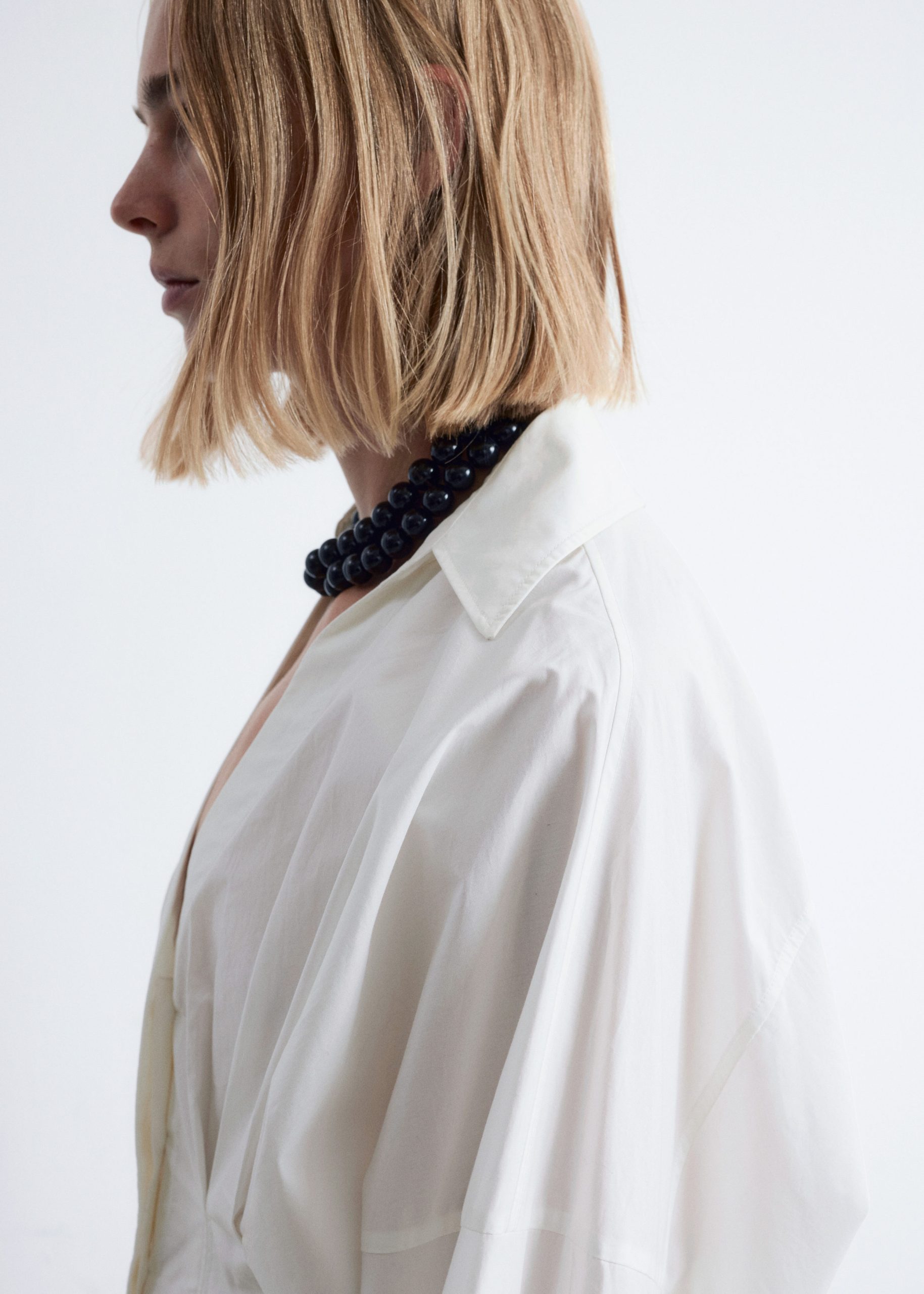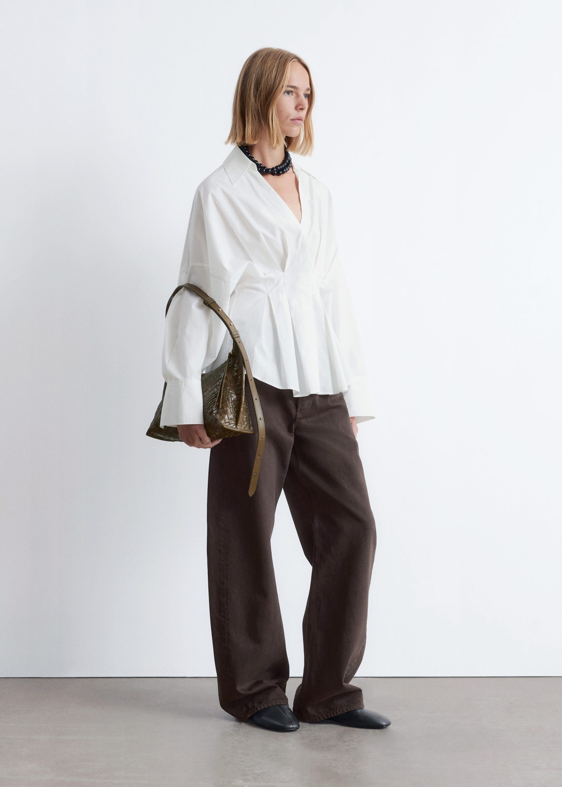 This shirt is made from 100% pure cotton and has a crisp, lightweight feel. Designed in a sculptural silhouette, featuring a fitted waist with pleat details and long, voluminous sleeves with buttoned cuffs. Finished with an open collar and a hidden placket with concealed buttons.
