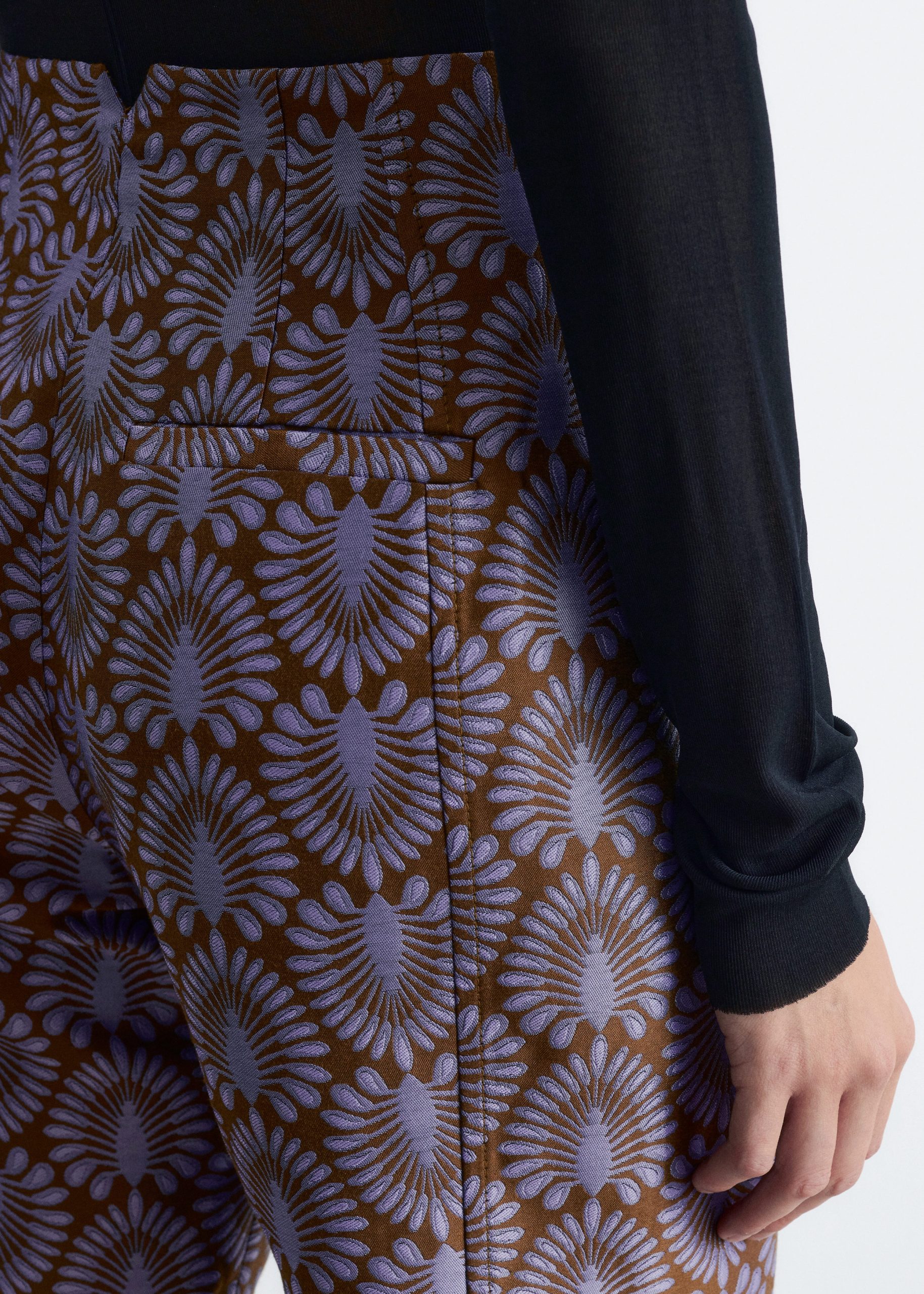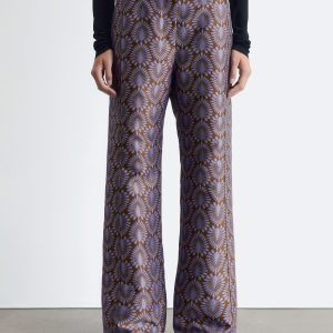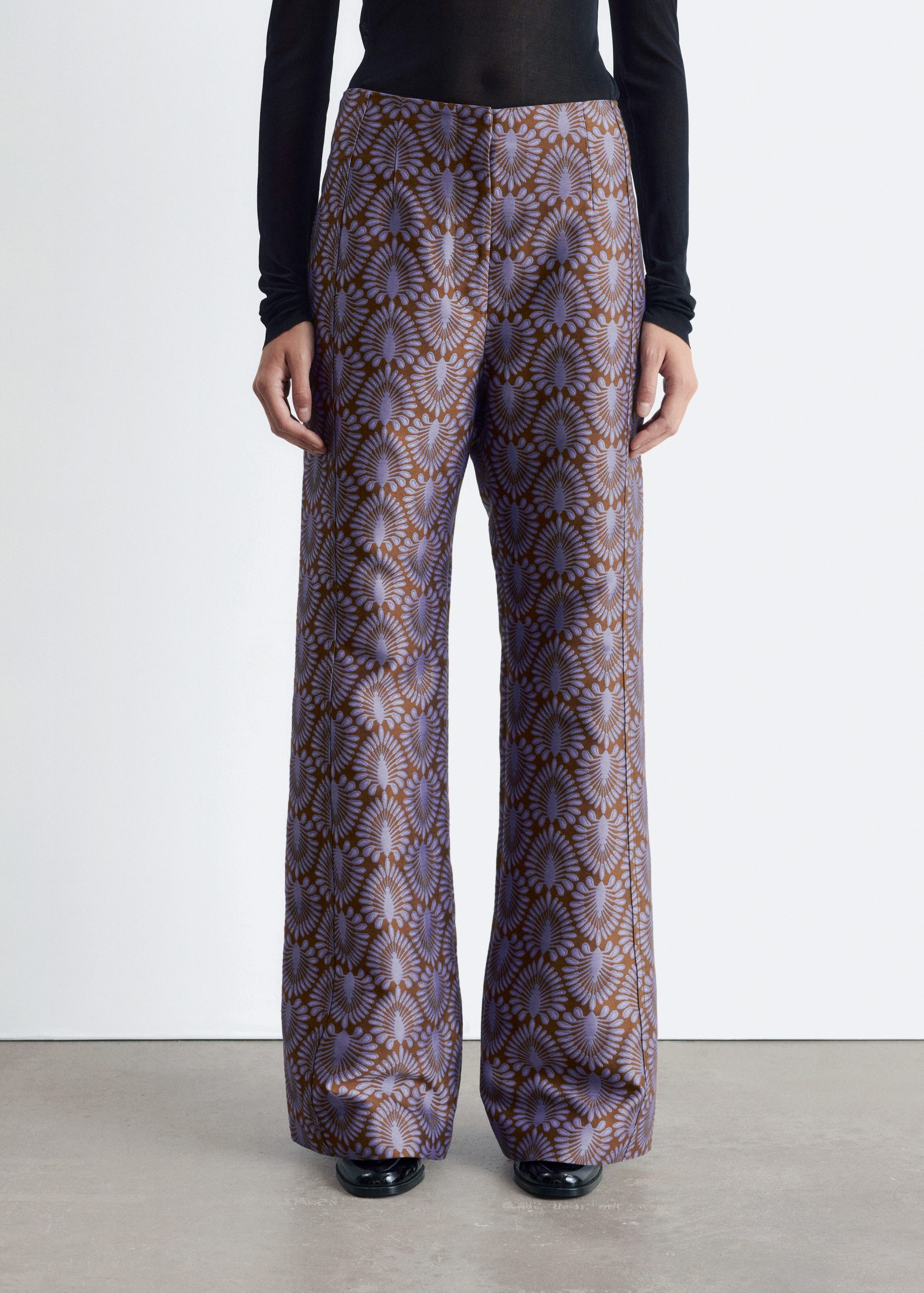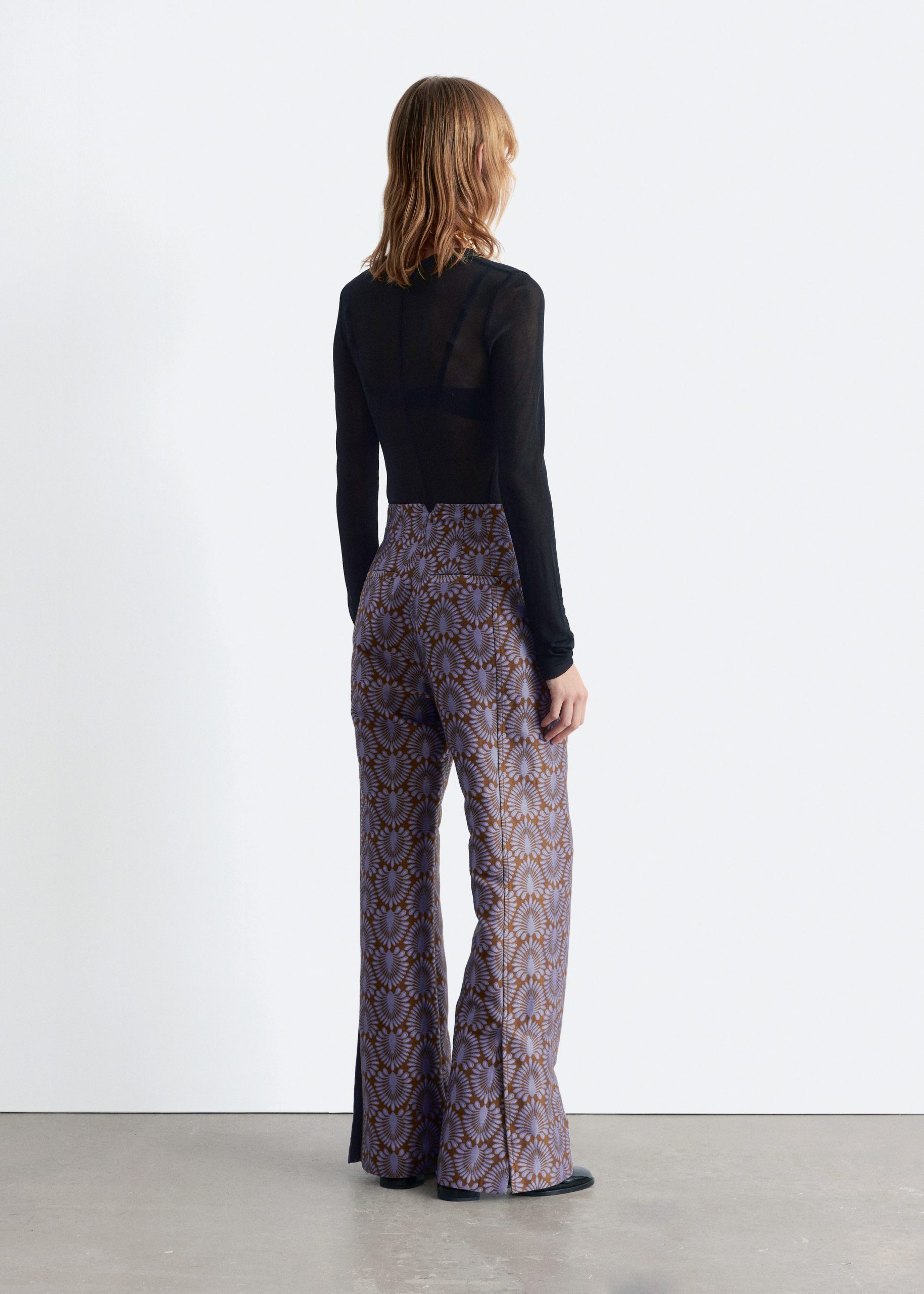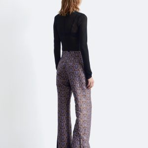 These trousers are crafted from satin twill with an all-over jacquard pattern. Tailored with extra-long, flared legs and subtle vents at the hem. They feature a regular waist with a v-cut detail at the back, a zip fly with hook-and-eye closure, and two welt pockets at the back.