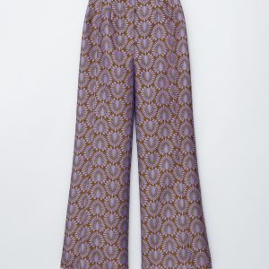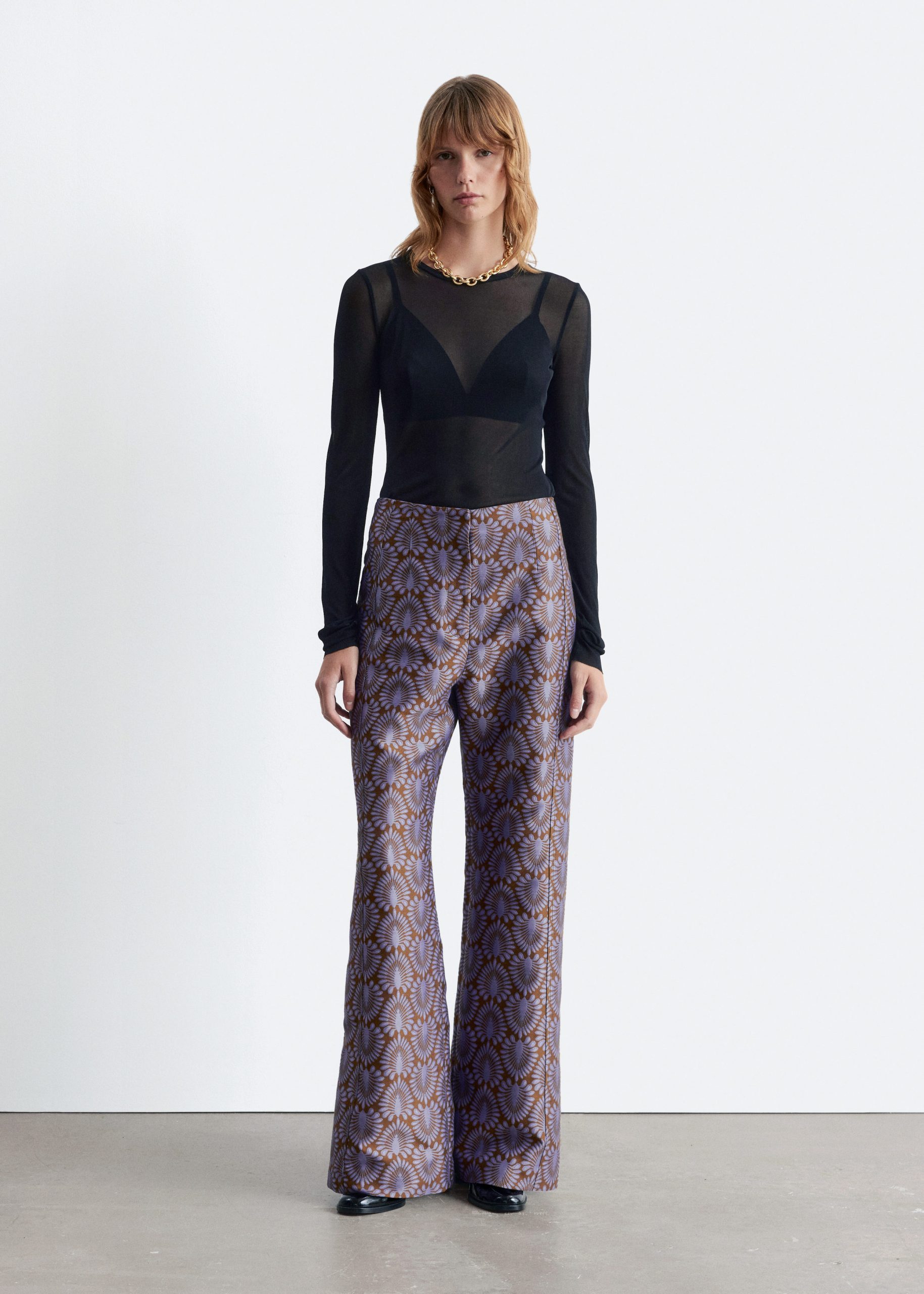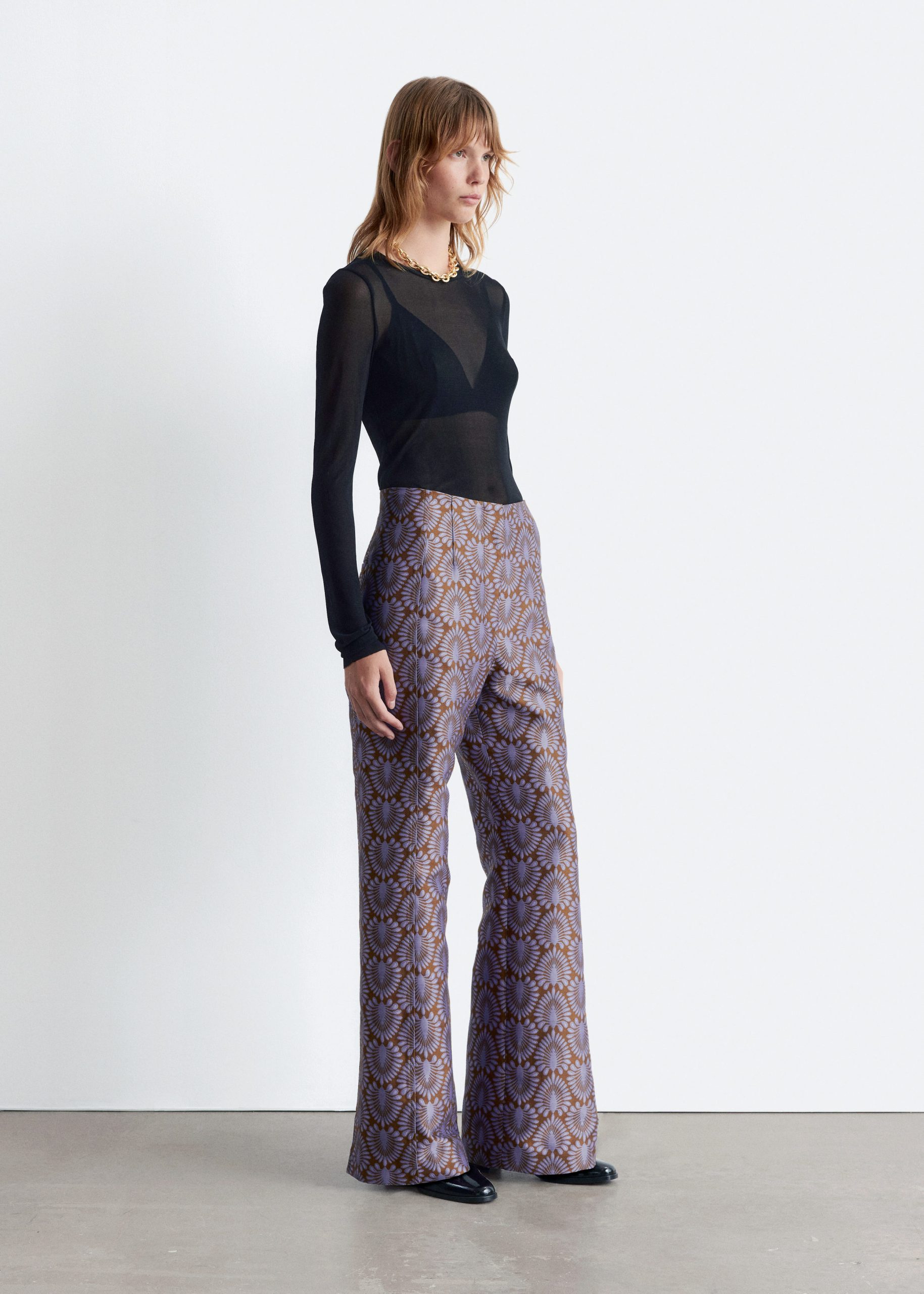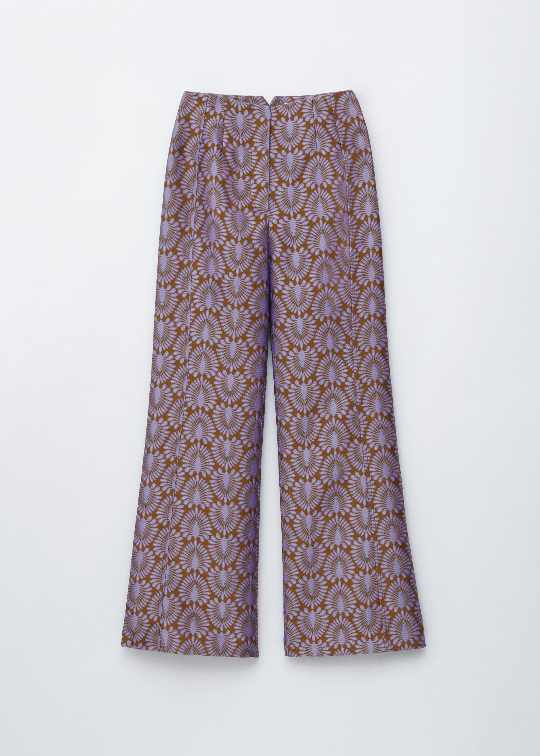 These trousers are crafted from satin twill with an all-over jacquard pattern. Tailored with extra-long, flared legs and subtle vents at the hem. They feature a regular waist with a v-cut detail at the back, a zip fly with hook-and-eye closure, and two welt pockets at the back.