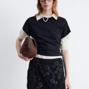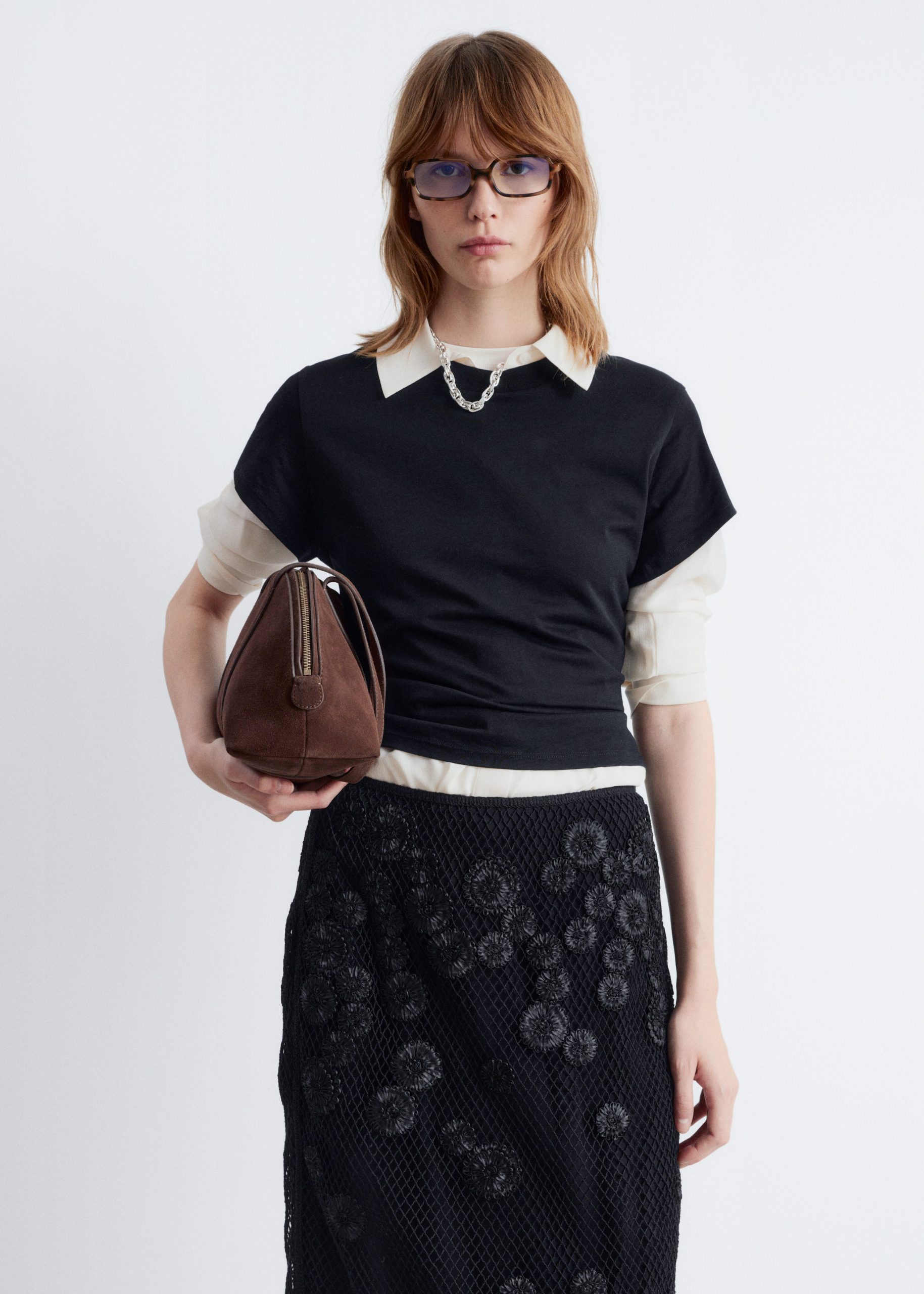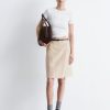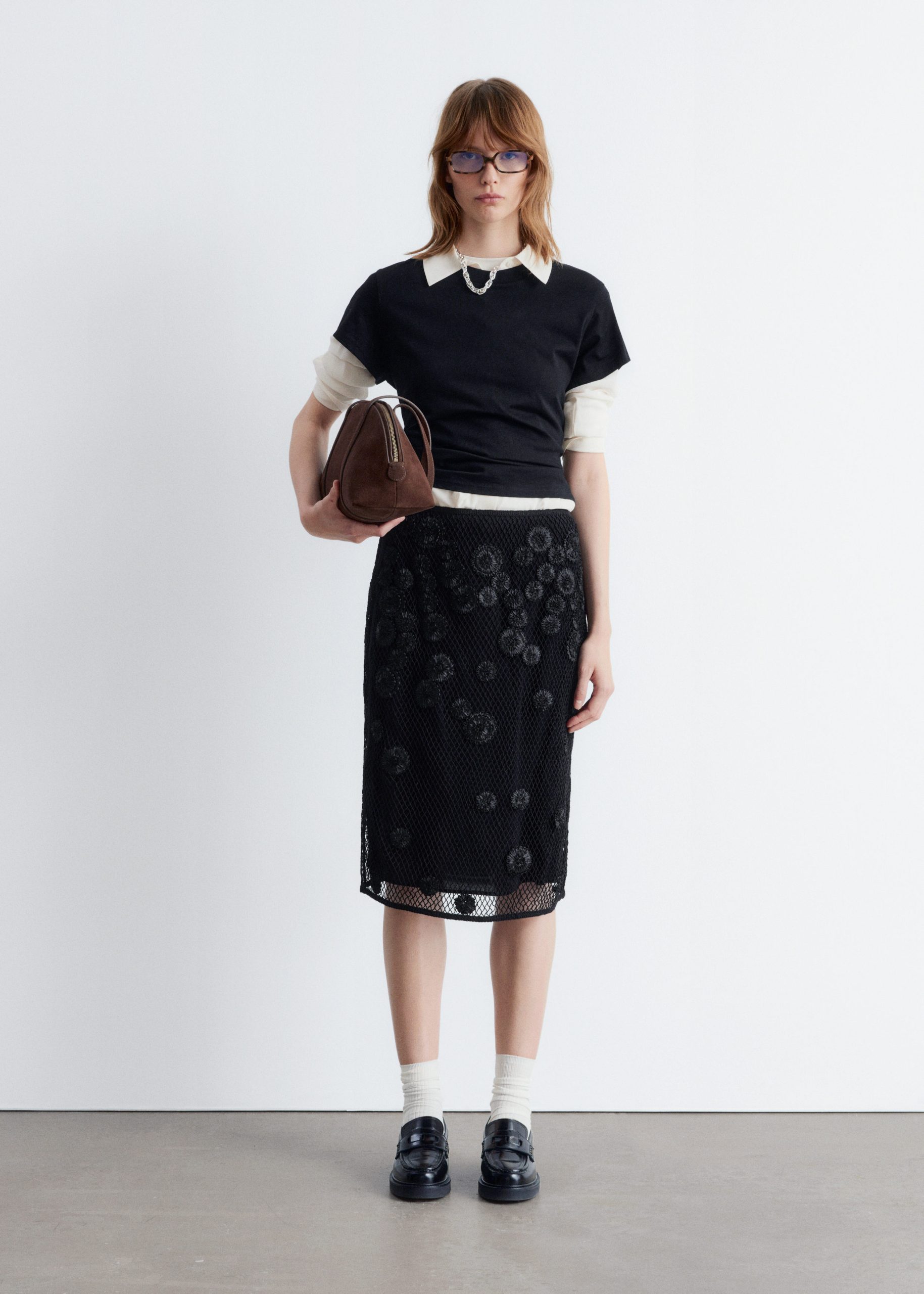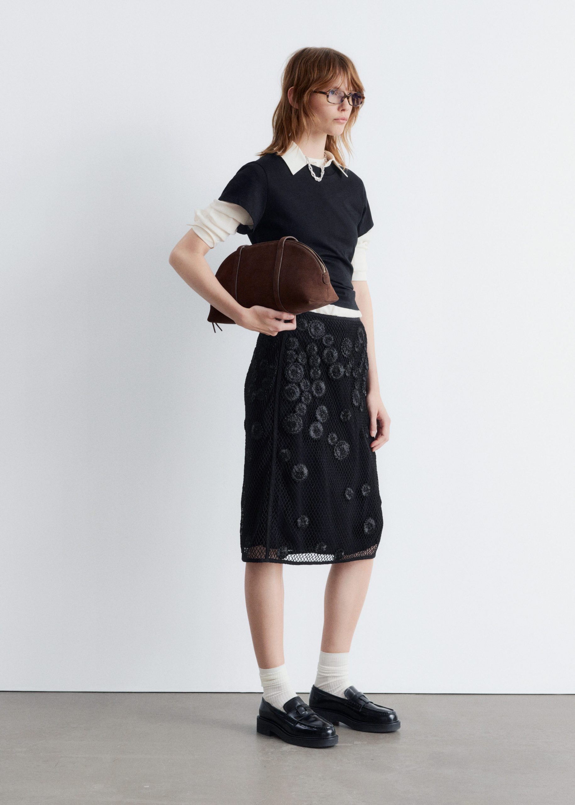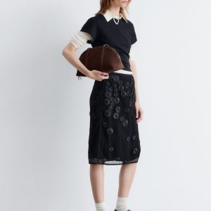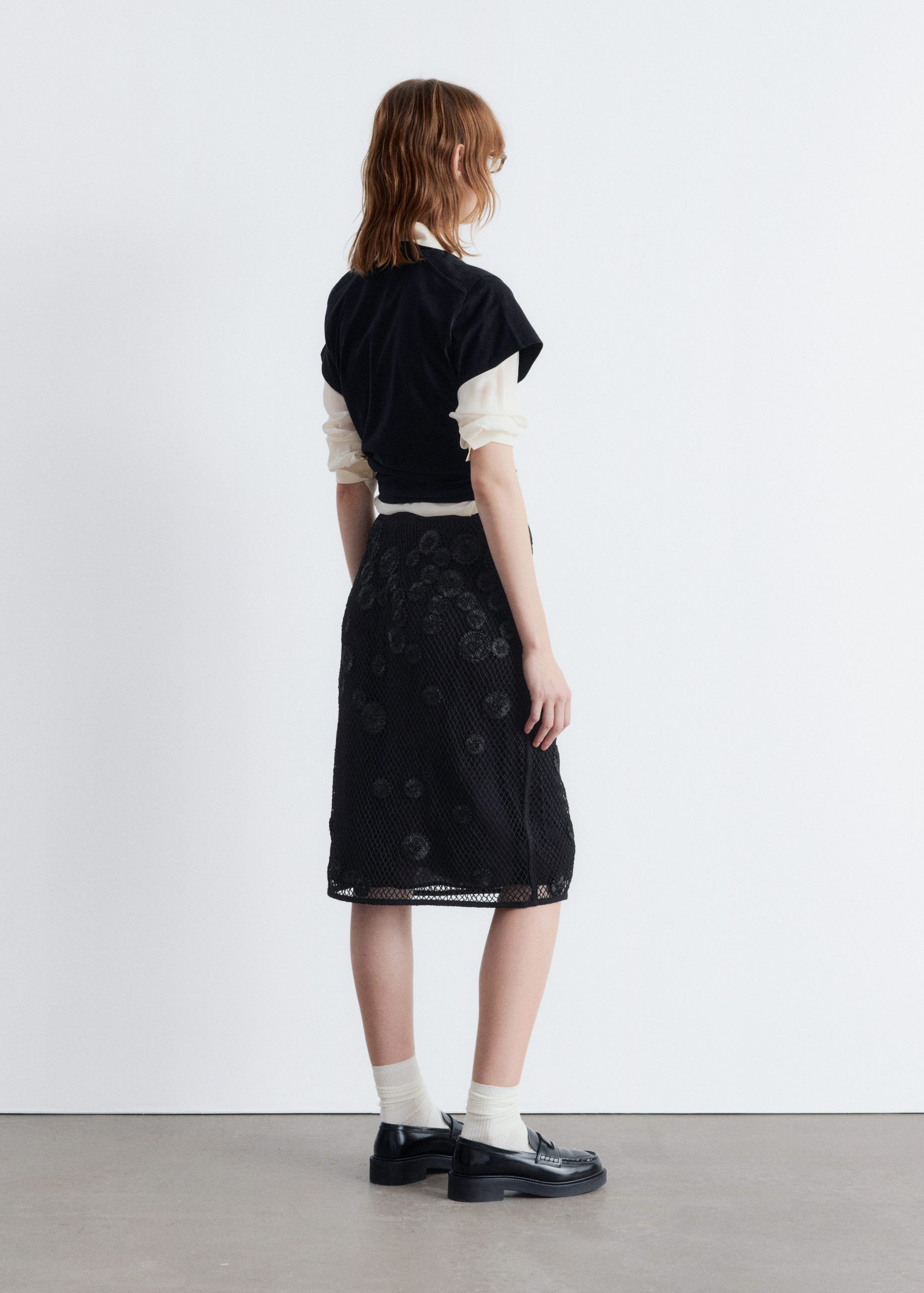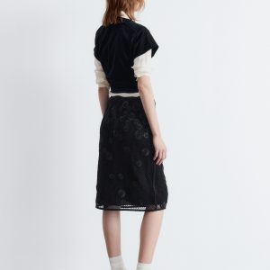 This midi skirt is crafted from lightweight cotton and overlaid with an open-structure mesh, detailed with a floral appliqué pattern for added texture. Designed in a classic pencil skirt silhouette, it features a regular waist and a concealed side zipper. Pair it with a simple tank top or t-shirt.
