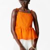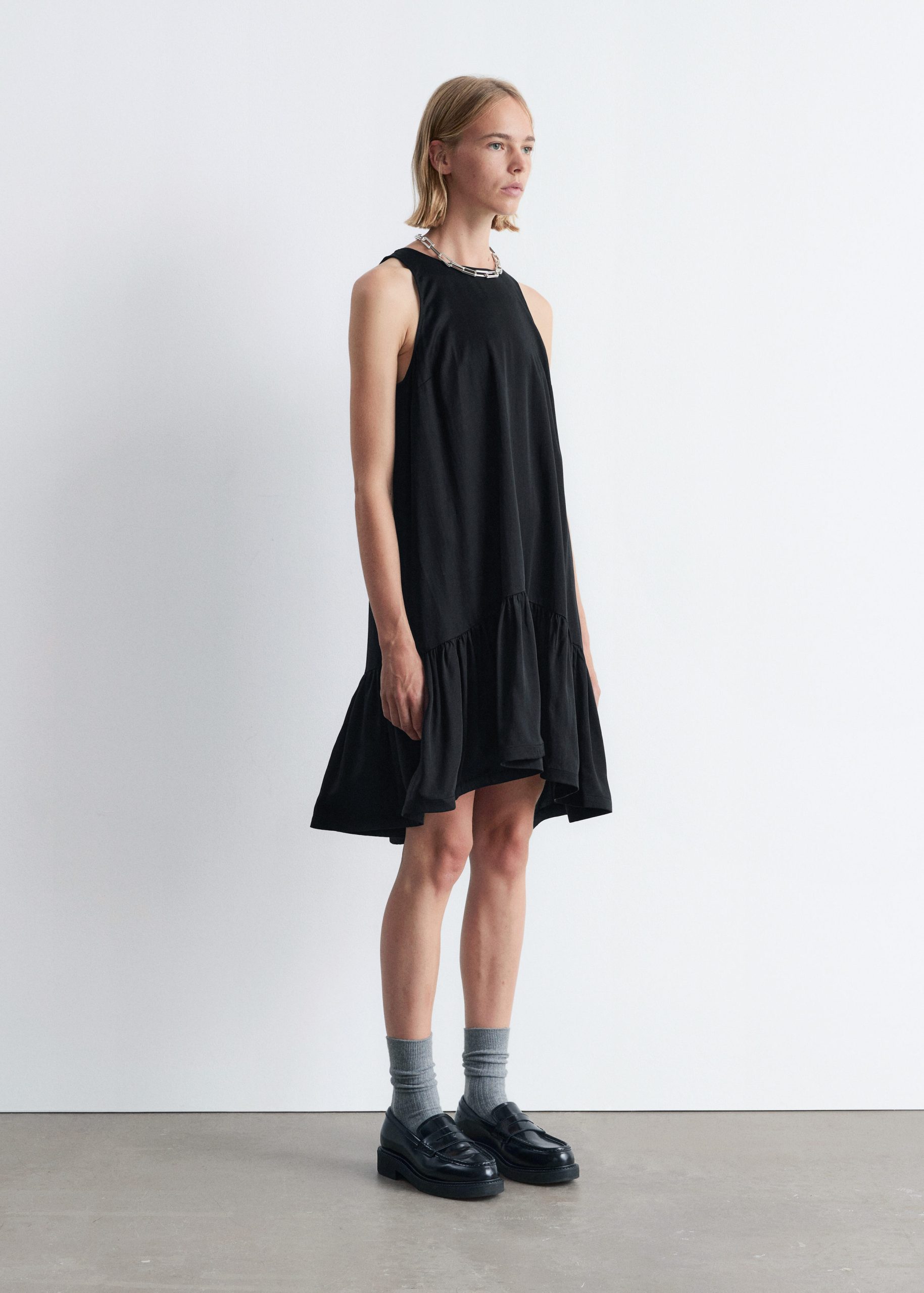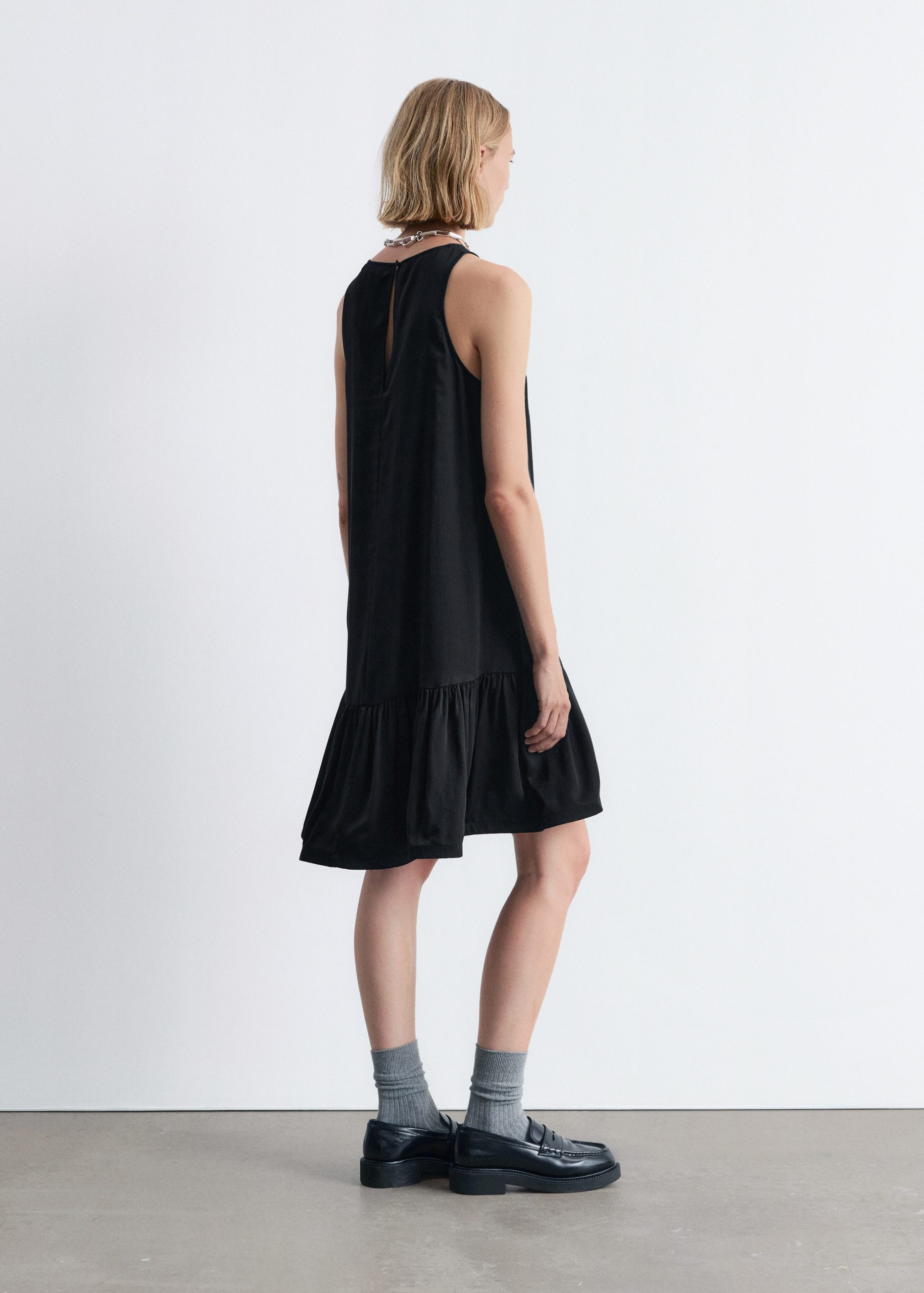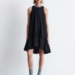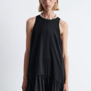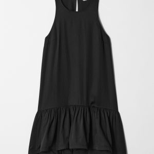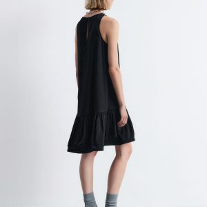 Sleeveless mini dress cut in an A-line silhouette, detailed with a frilled hem adding movement and a playful summery feel. Finished with a keyhole button closure at the back.