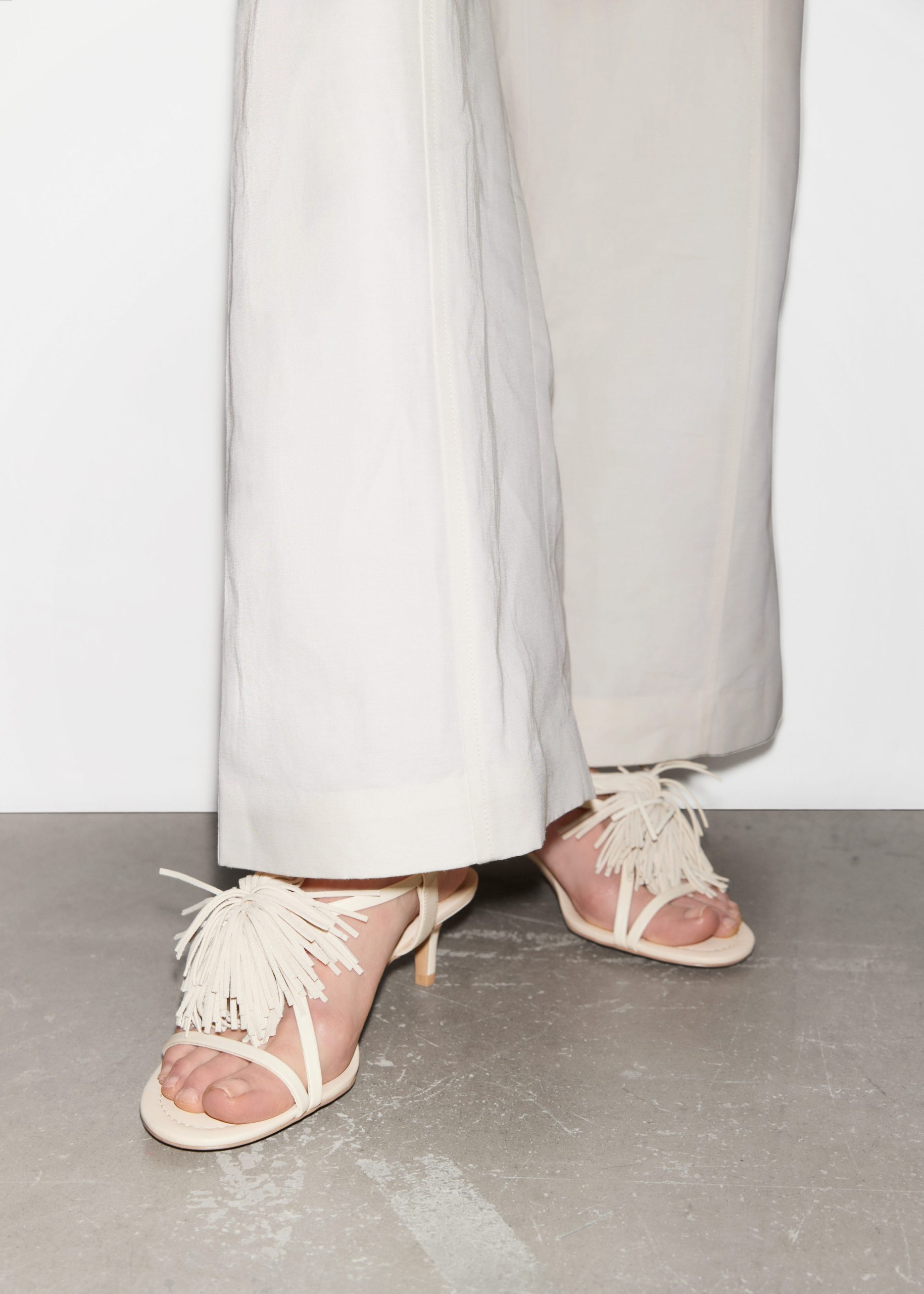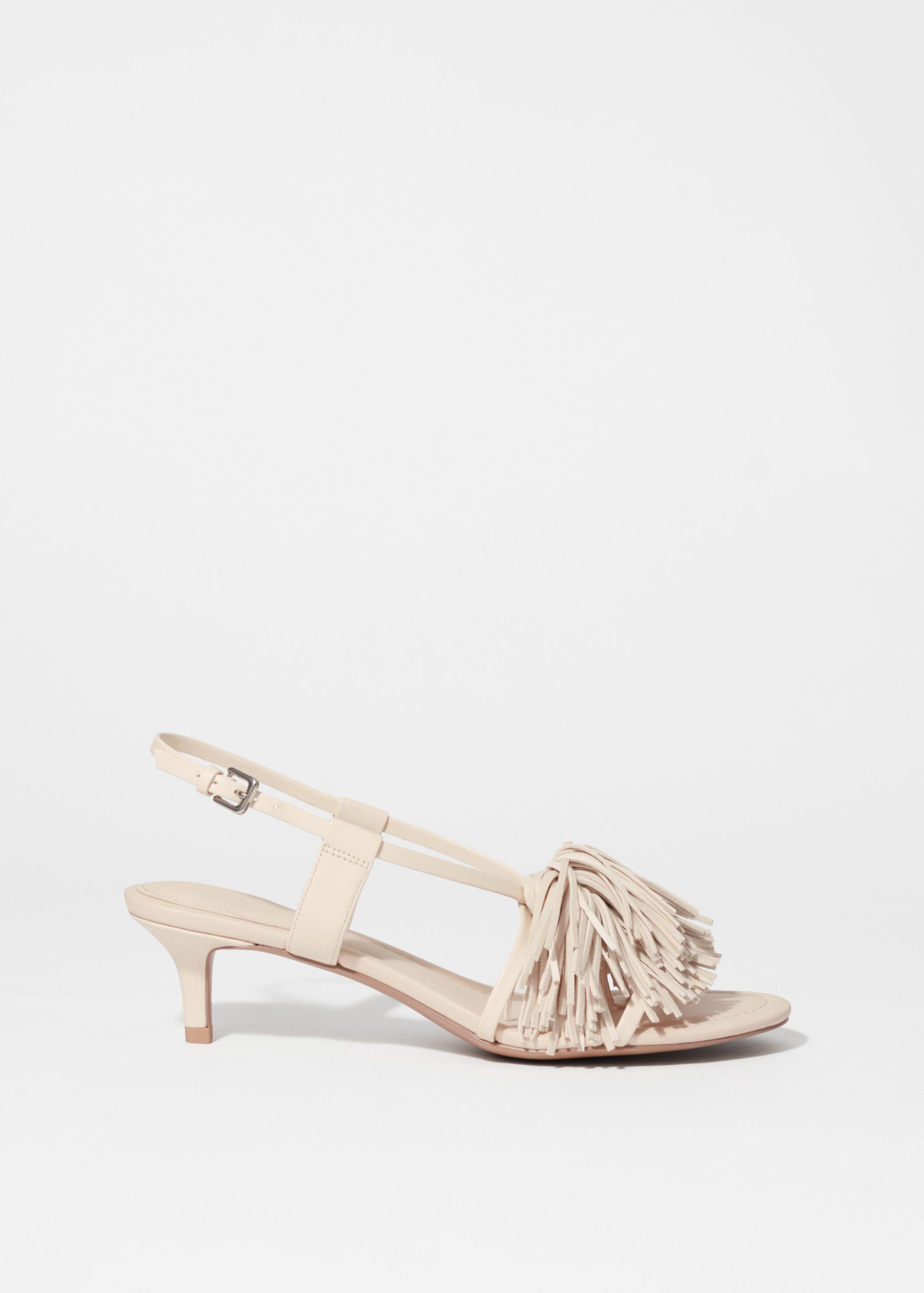 These sandals are decorated with swishy fringing. They’ve been crafted from supple leather and have adjustable slingback straps. The manageable heel offers 50mm of lift.