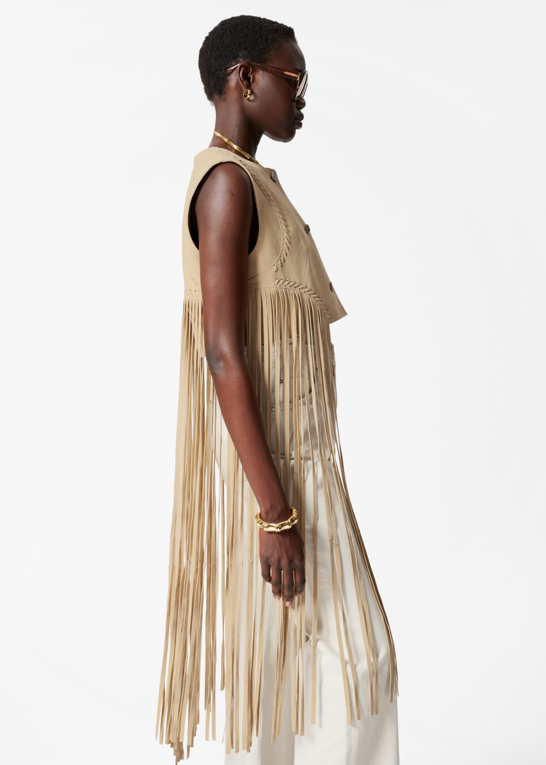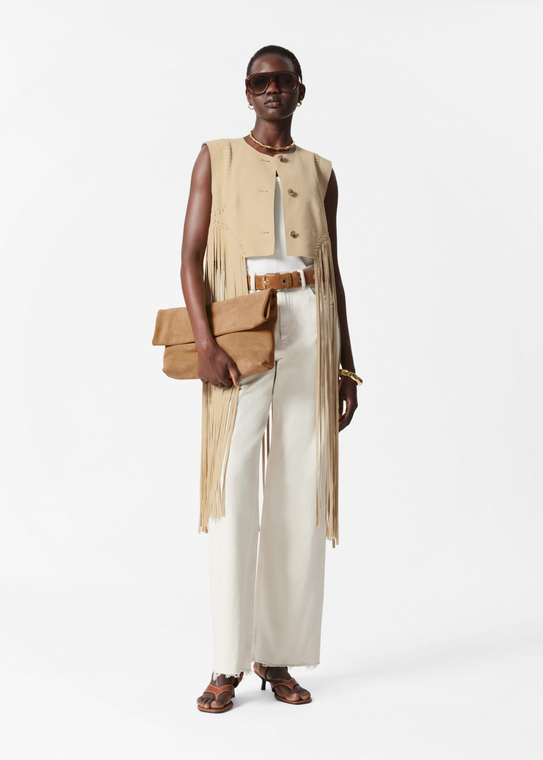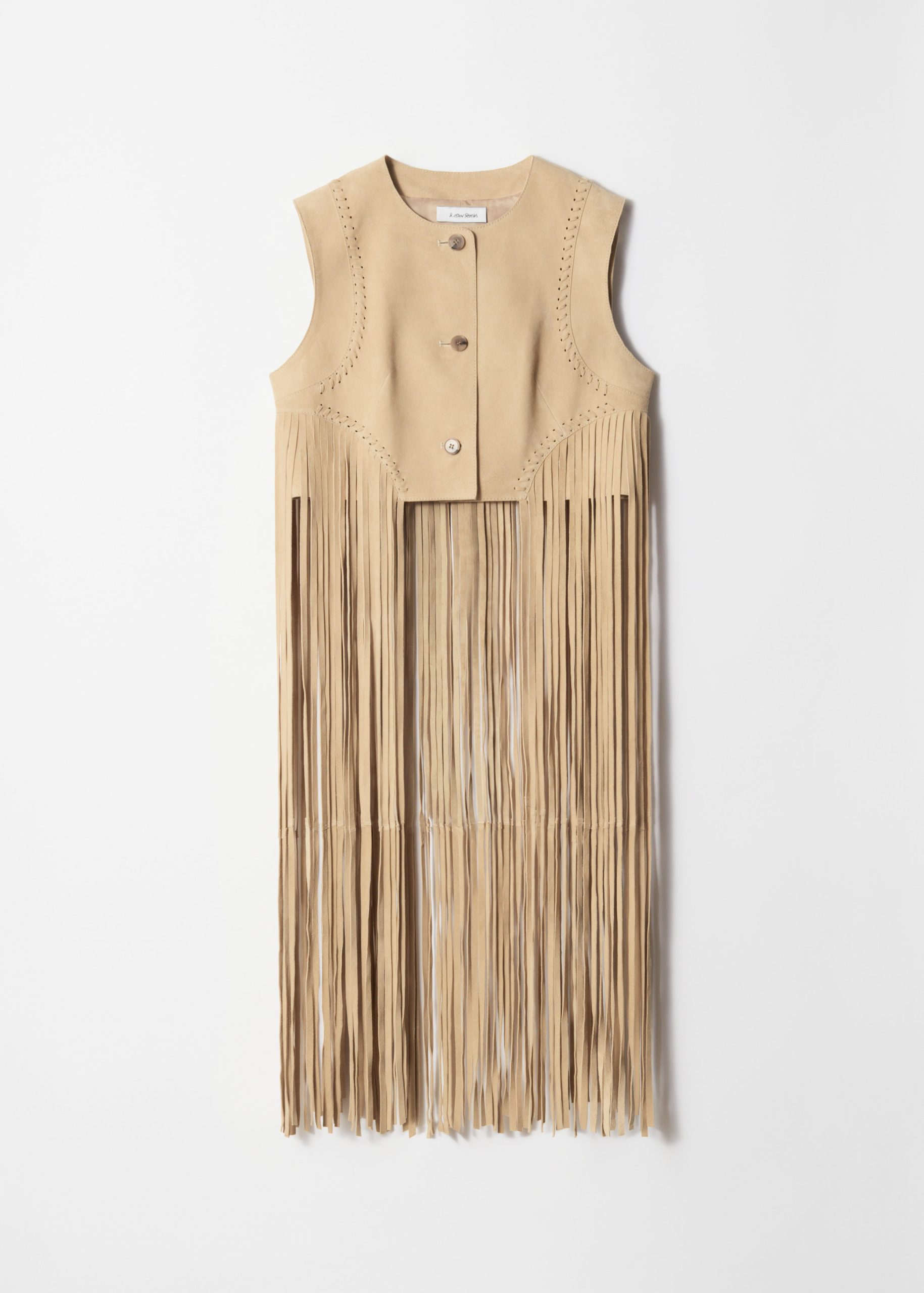 This cropped vest offers a modern take on Western Americana. Crafted from premium goat suede, it has a lightweight feel and matte finish. Detailed with thick, topstitched seams, and long fringes that cascade down the leg, adding movement and dramatic impact. Traced with three button closures along the front.